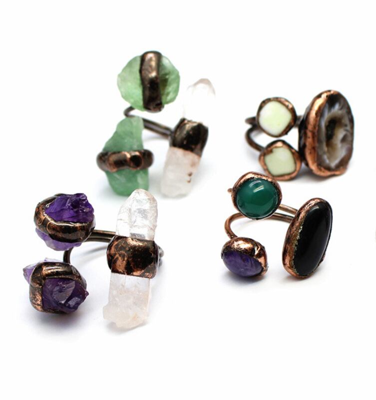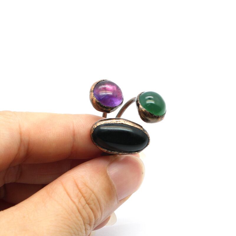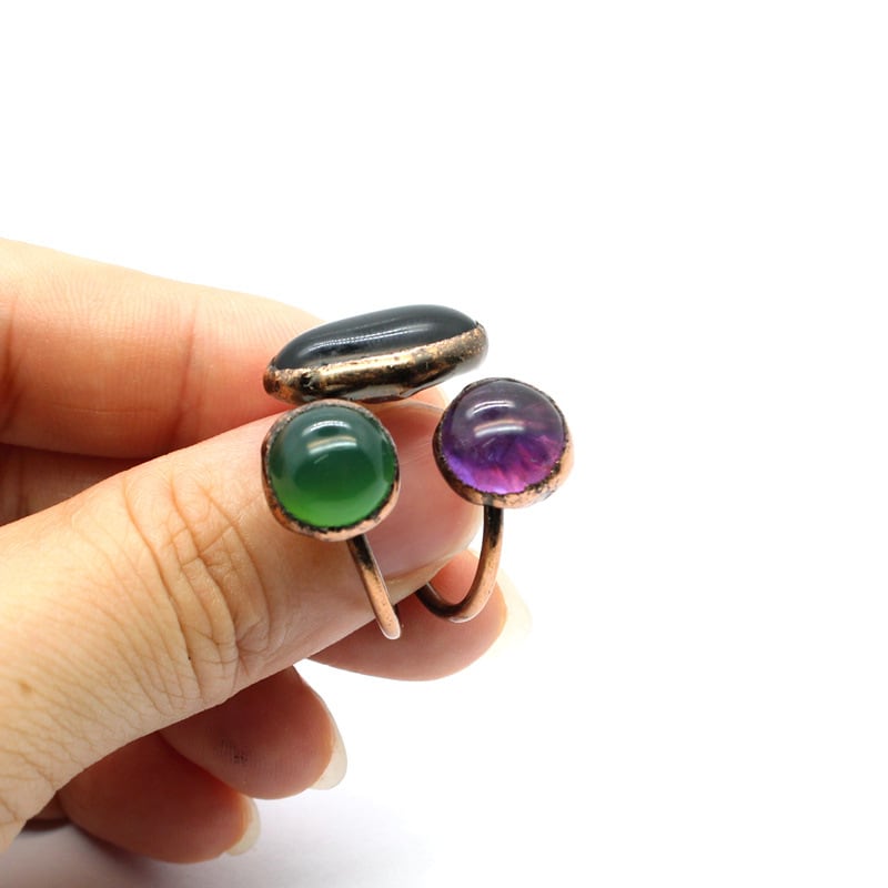 天然石 手作り水晶原石リング (アメジスト、 オブシディアン、グリーンメノウ)