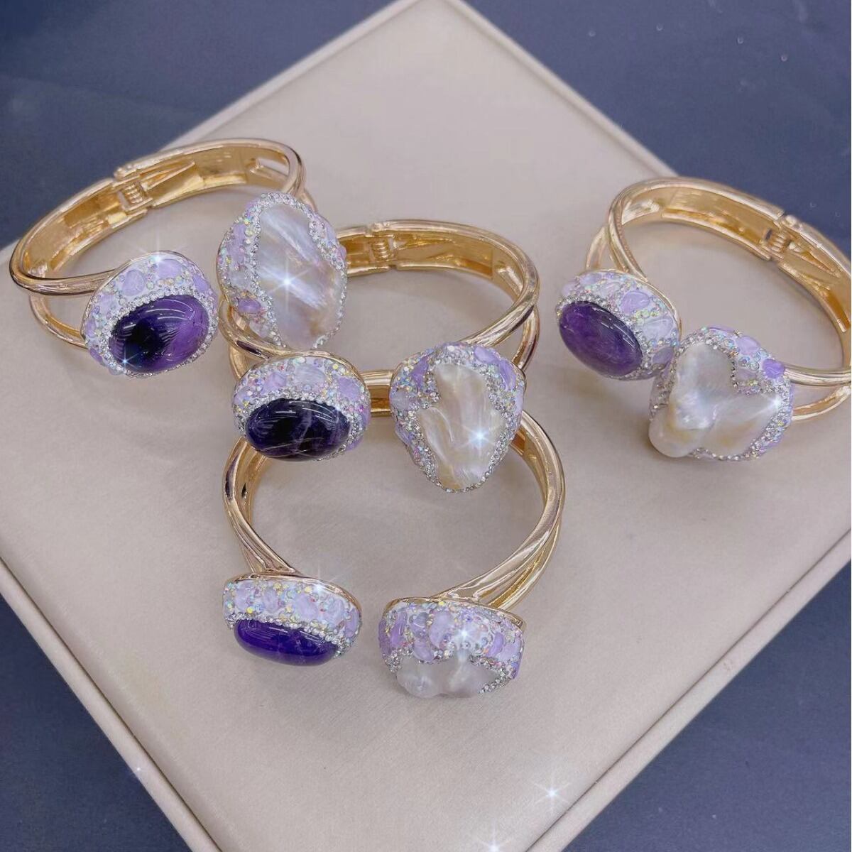 天然石 天然アメジスト+天然バロック真珠 バングル