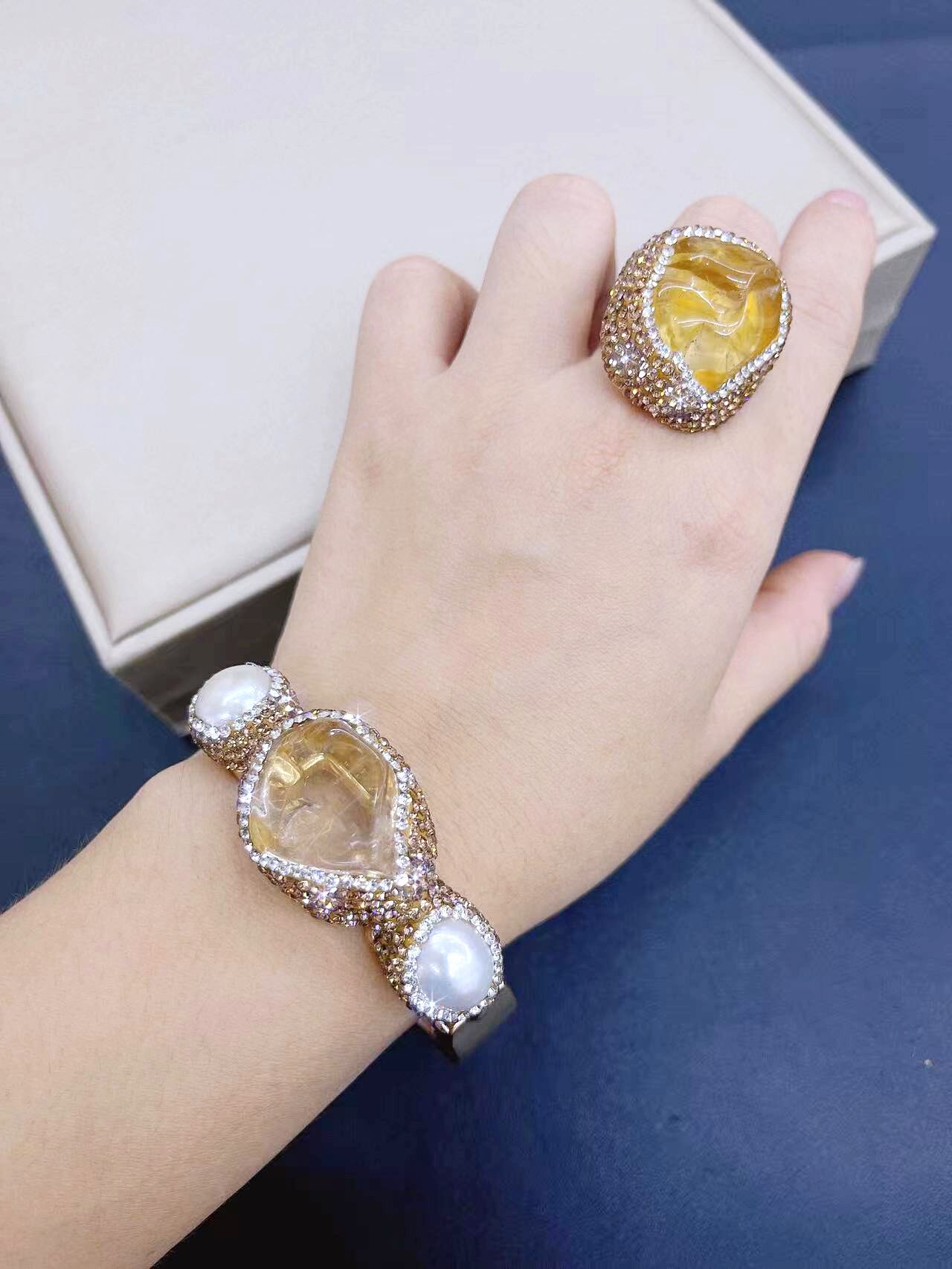 天然石 天然水晶 シトリン原石+白蝶貝 4点セット(ネックレス、リング、ピアス、ブレスレット)