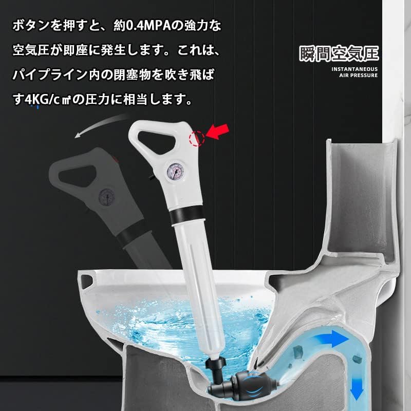 【トイレつまり解消道具】充電する必要はありません。異物のつまりによる嫌な臭いや汚水の滞留の原因にもなる排水溝やトイレの頑固なつまりを強力な空圧のパワーで押し出し一気に解消するパイプクリーナーです。高圧空気砲を使用して閉塞物を洗い流して、威力が強くて。 加圧ポンプで空気を溜めて、ボタンを押せば一気に空気を噴射することにで、詰まりの原因となる異物を一気に押し出して解消することが出来ます。各種アタッチメントの変更で、台所、排水管、排水溝、排水口、雨樋、洗面台、流し台などの排水溝つまりを解消できます。