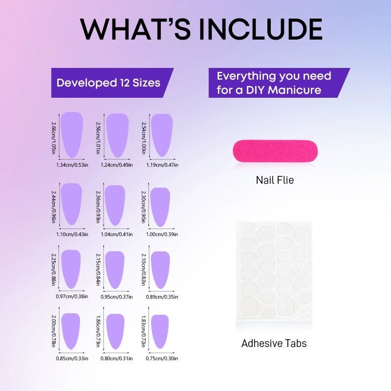 使用方法:1、製品を受け取った後、サイズをこの爪に合うかどうかを判断するために、1つずつ爪を見比べてください。2、手をきれいに洗って、爪の表面を予め磨いておくことで、よりしっかりと密着させることができる。3、クリーニング用コットンで爪の表面をきれいにし、乾燥させてください。4、爪に大きさが適切なゼリーグルーを選んで貼り付けて、爪に押し当てて10秒待つだけ完成です。