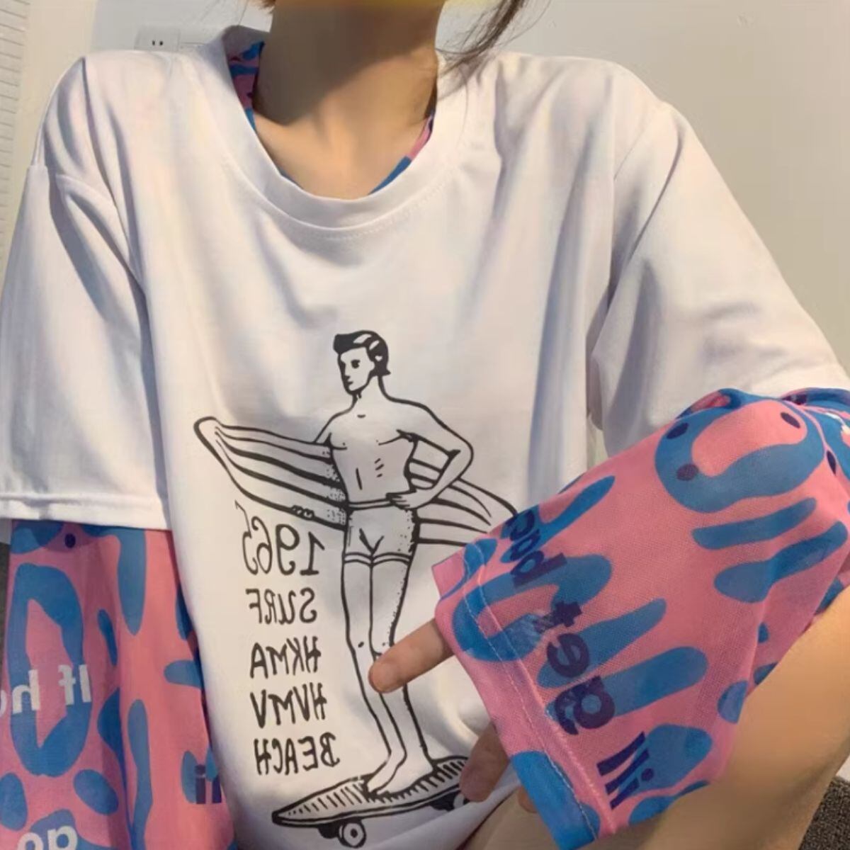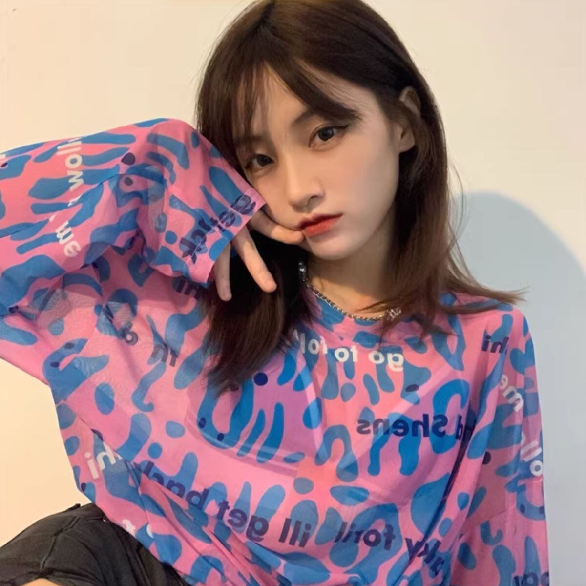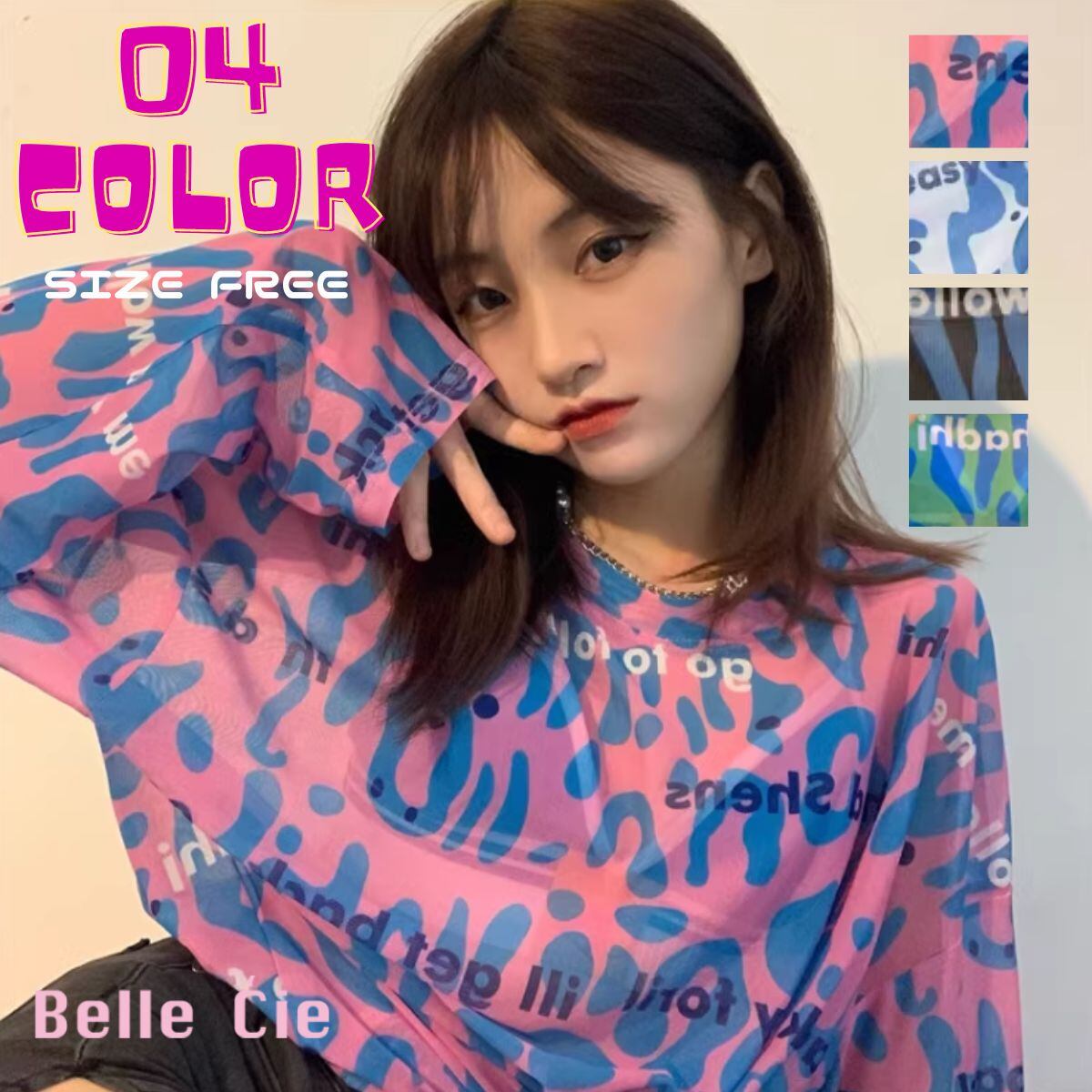 シアー トップス 長袖 透ける ロゴ 総柄 オーバーサイズ ゆる レディース 韓国ファッション ギャ