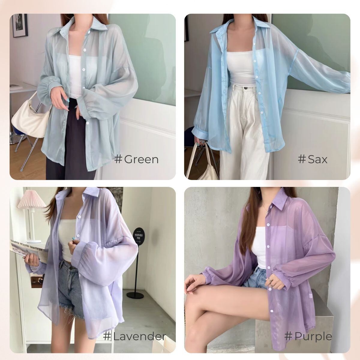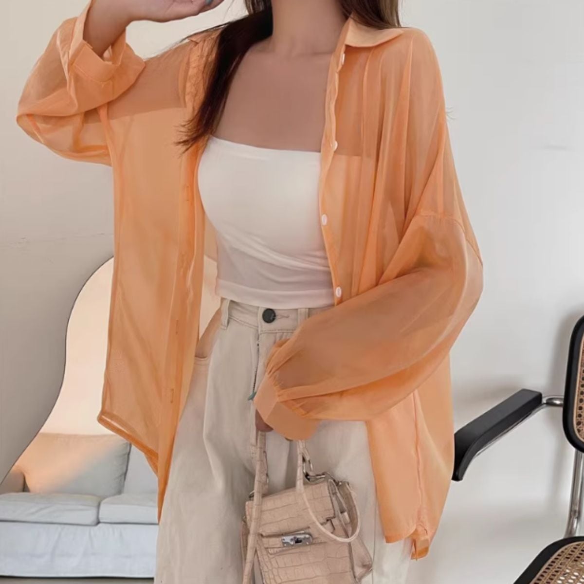シャツ 長袖 シアー レギュラーカラー 多色 羽織り 肌見せ 無地 レディース 韓国ファッション カ
