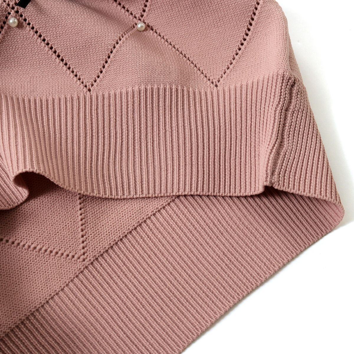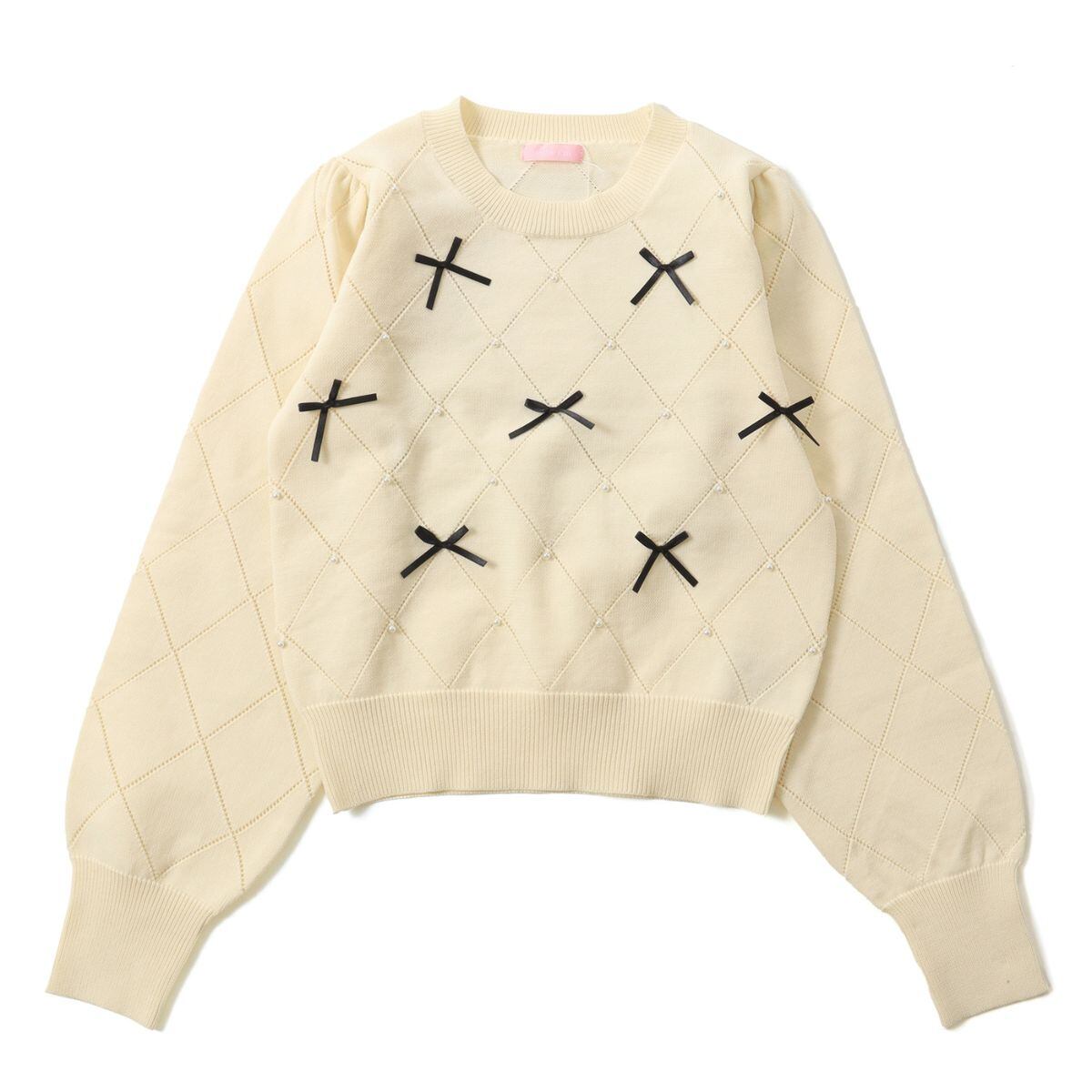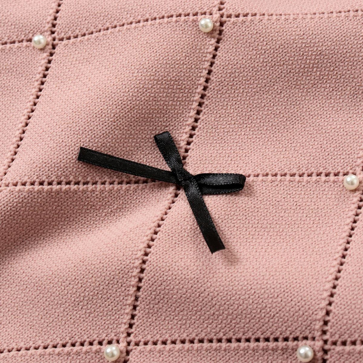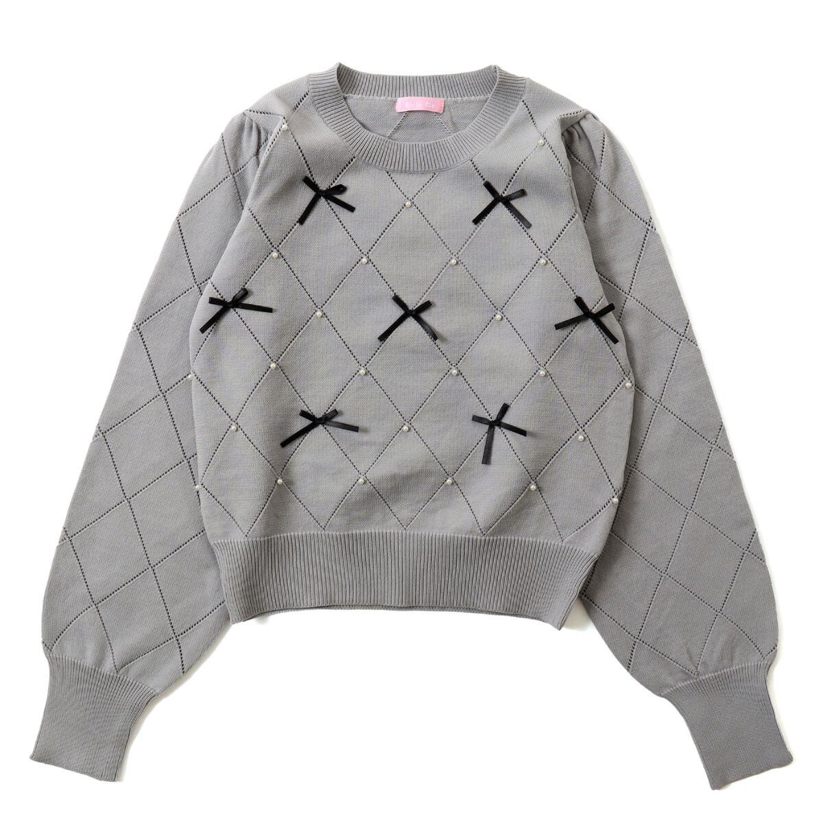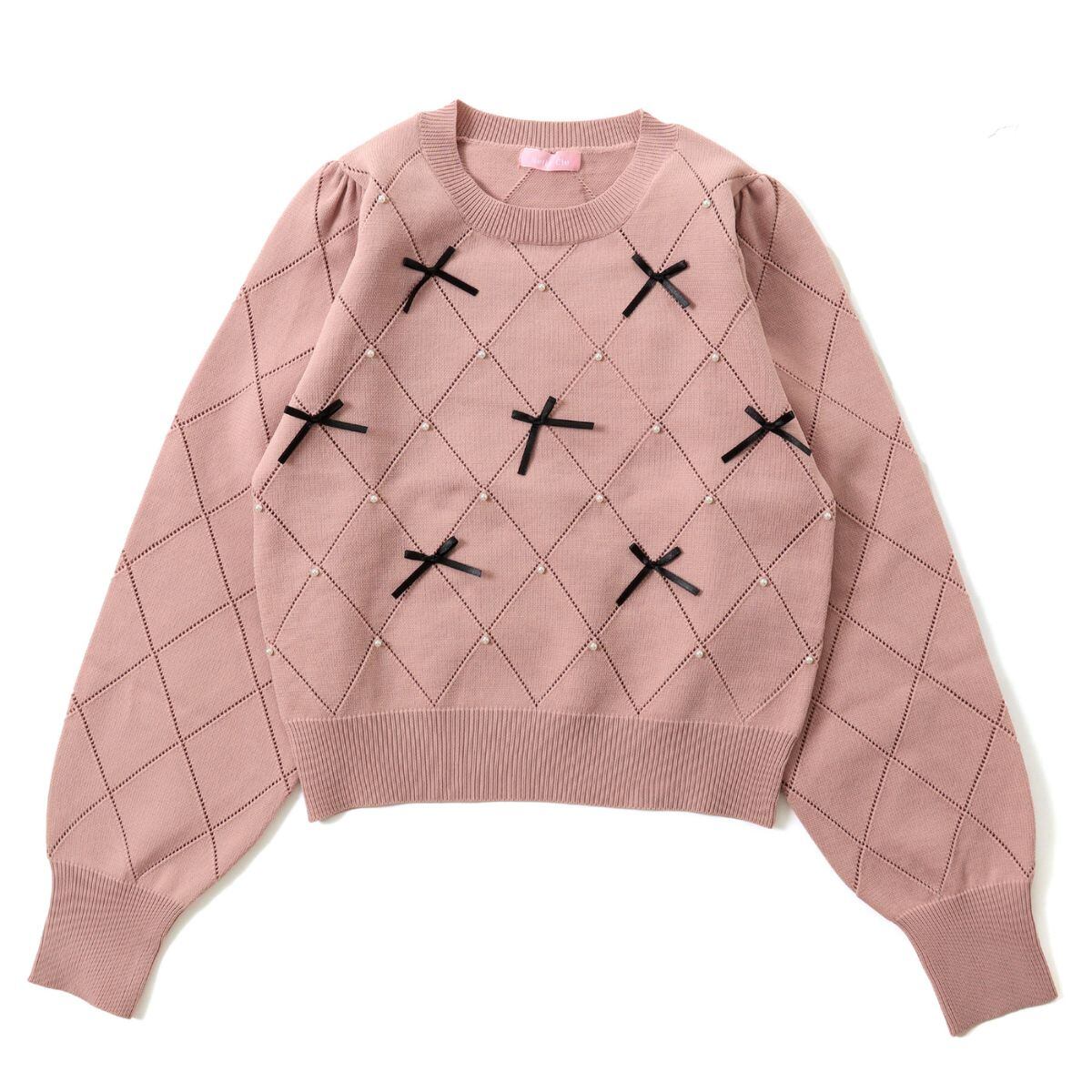 リボン ニット トップス セーター レディース 透かし編み ダイヤ パール フェミニン 韓国ファッシ
