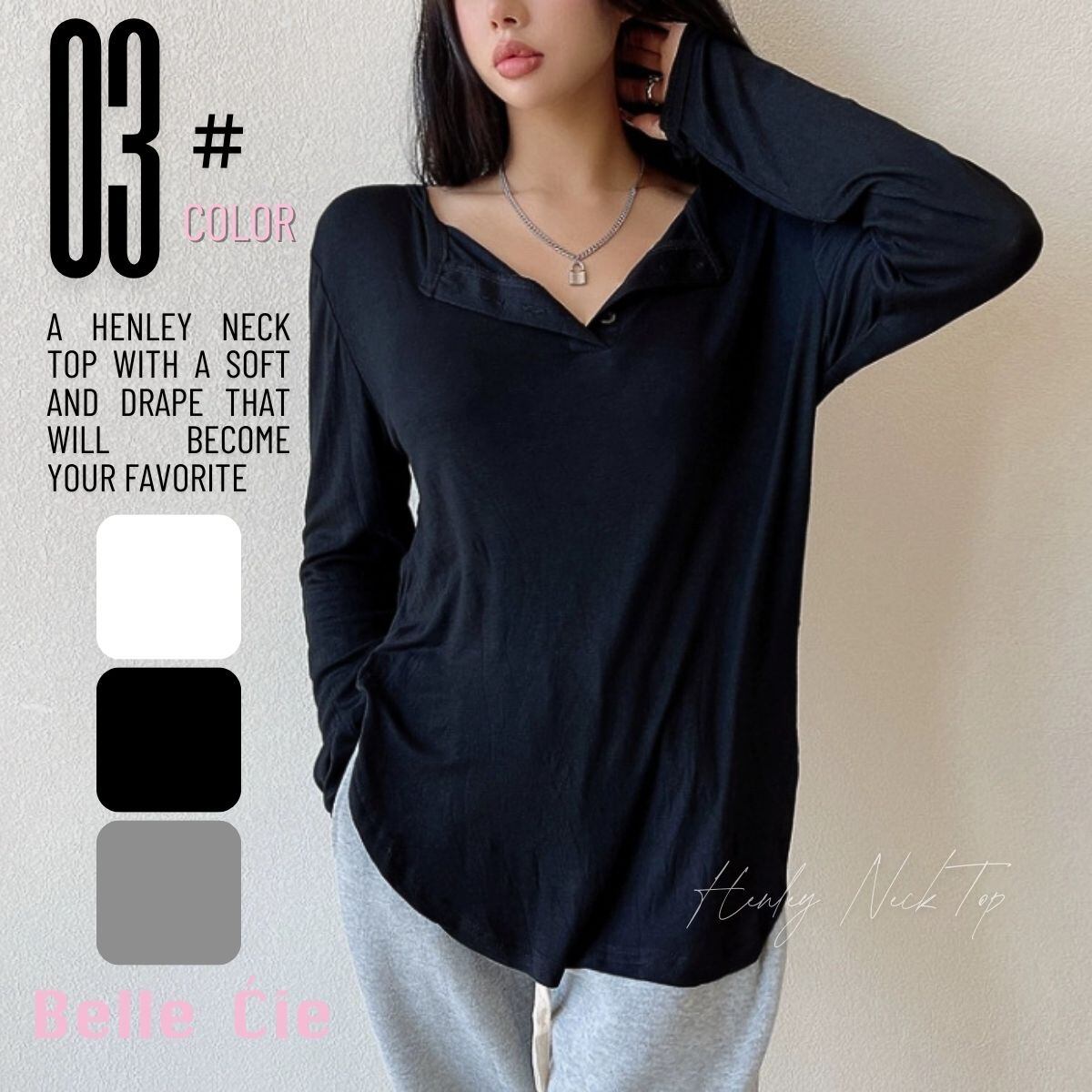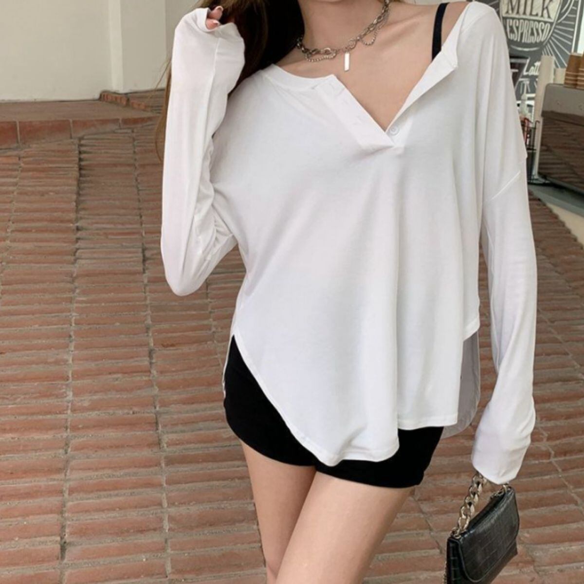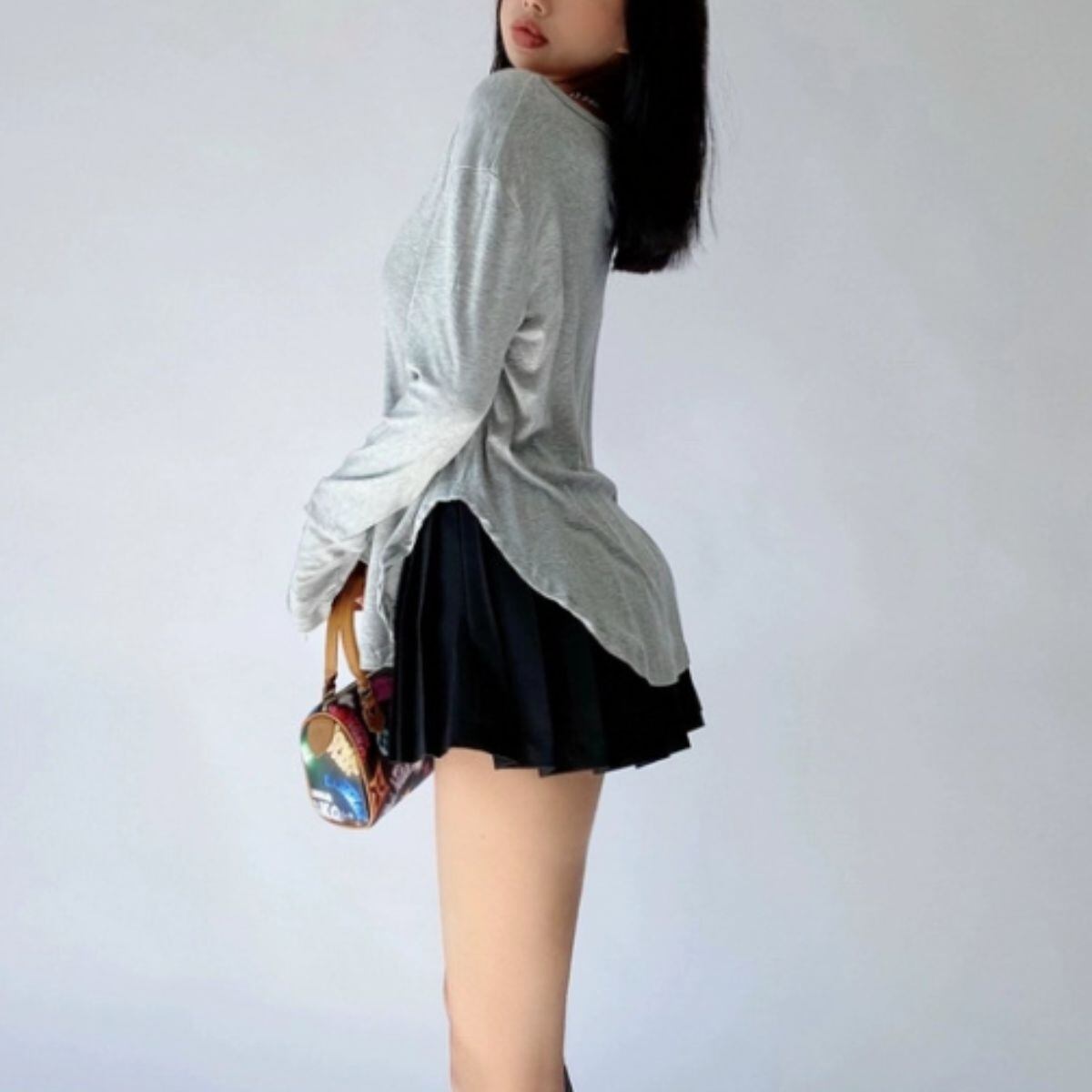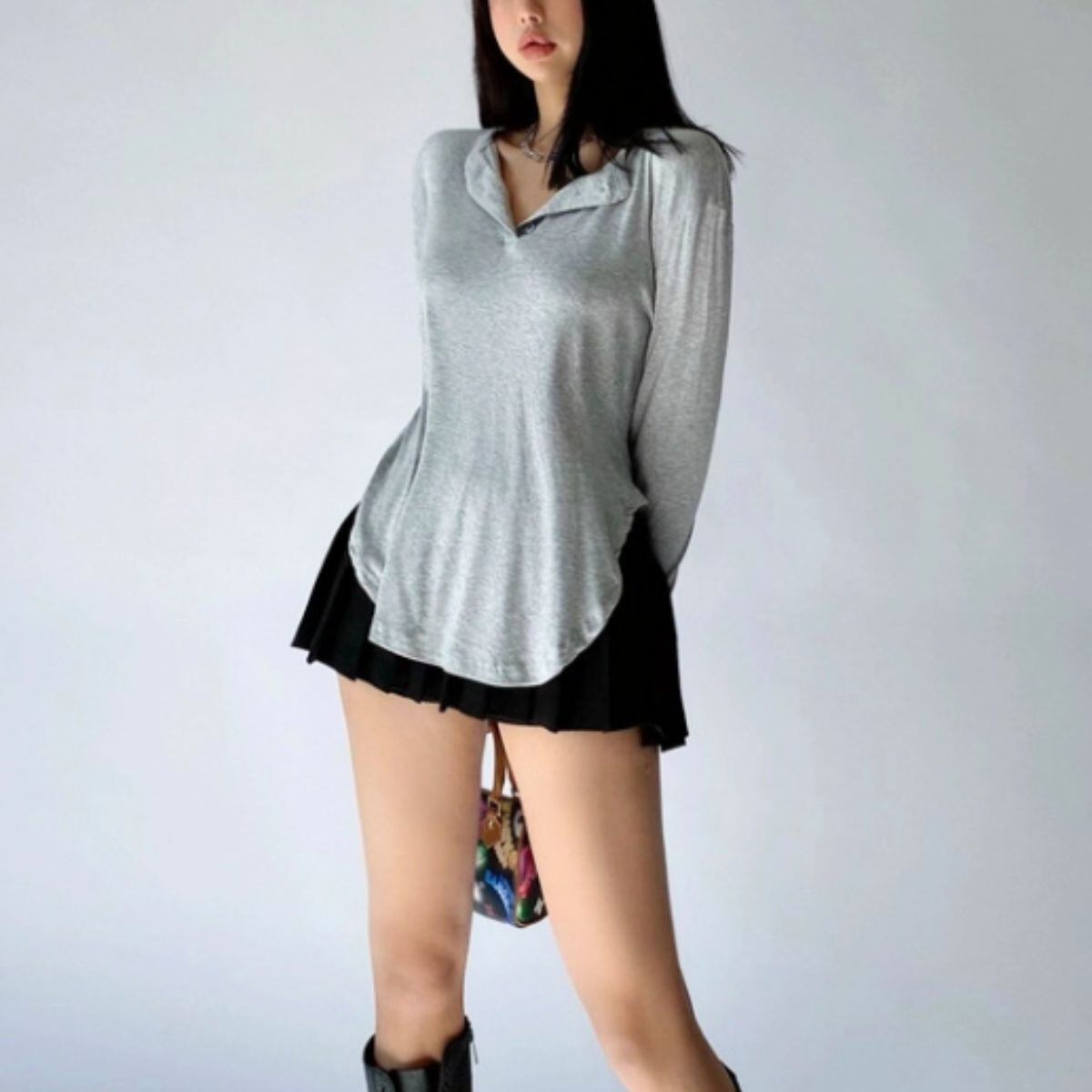Tシャツ 長袖 ロンT ヘンリーネック ヘム シンプル インナー レディース 韓国ファッション 重ね