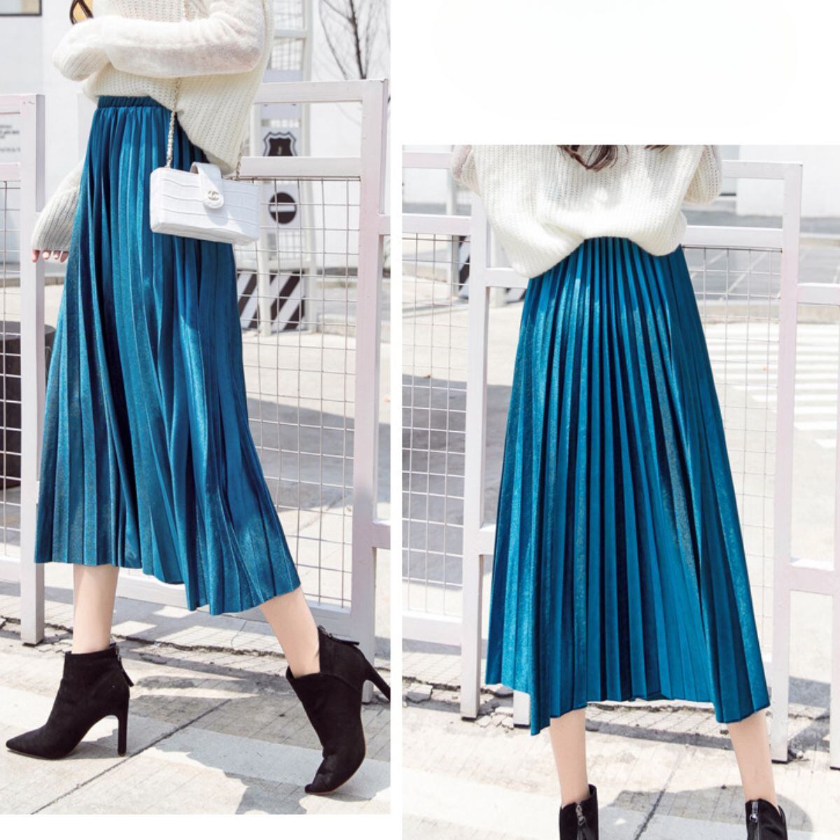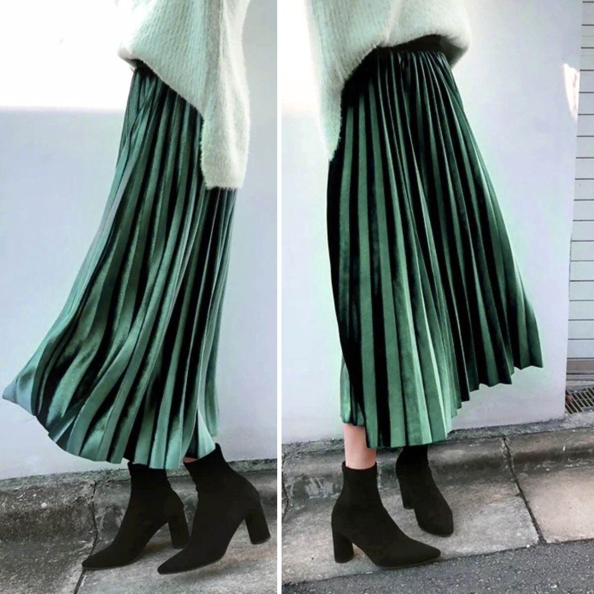 プリーツスカート ベロア フレア スカート ミモレ丈 ウエストゴム Aライン フレアスカート かわい