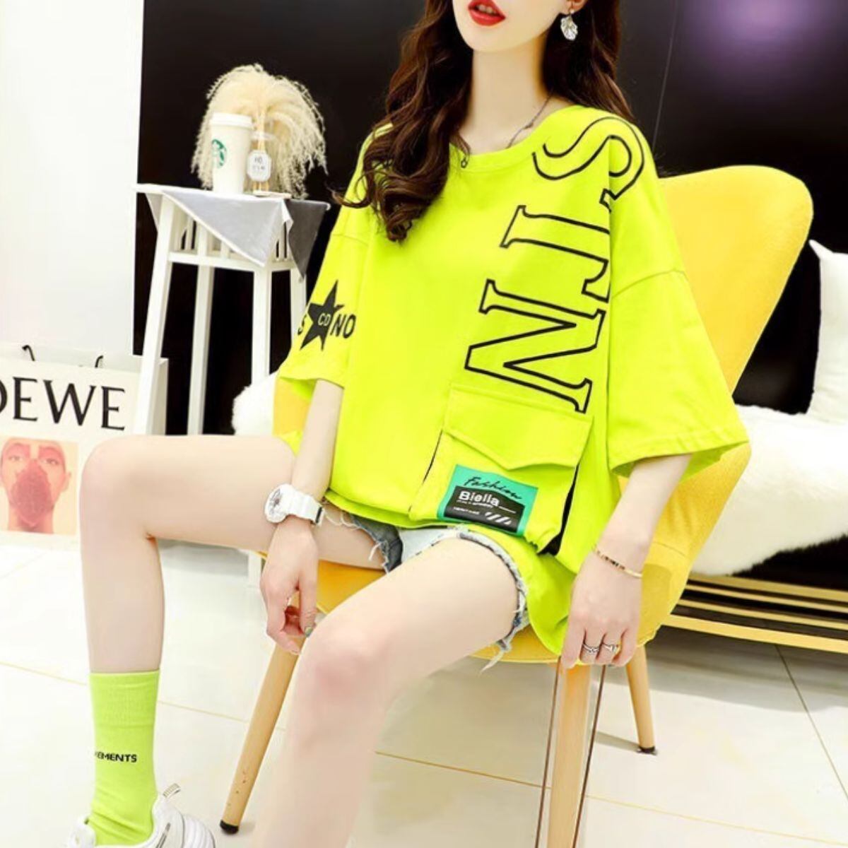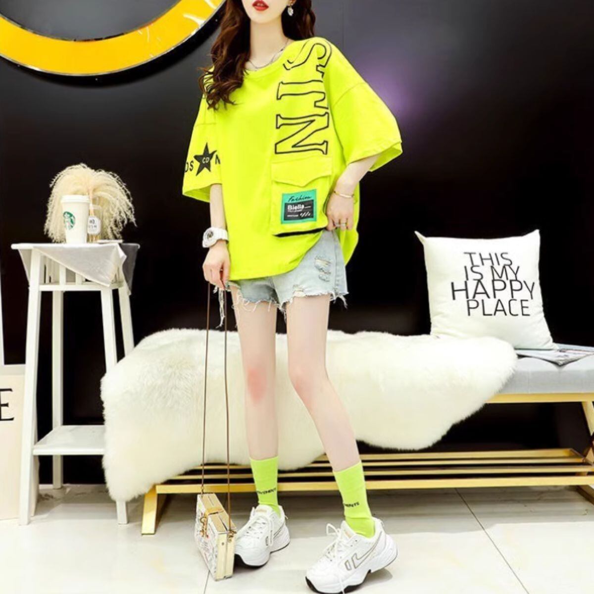 Tシャツ トップス 半袖 ネオン 蛍光 ポケット 大きいサイズ レディース ロゴ プリント カットソ
