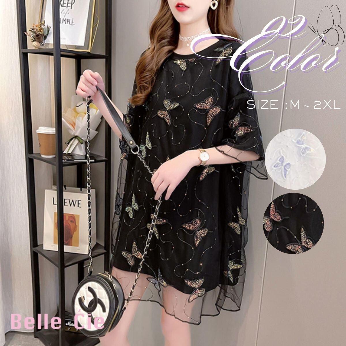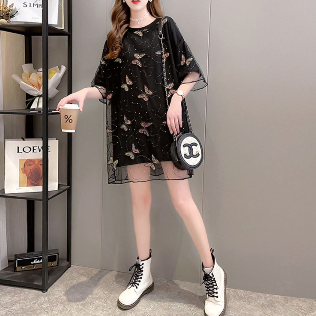 Tシャツ トップス 半袖 シアー バタフライ 蝶 ちょう 春夏 柄 レディース スパンコール