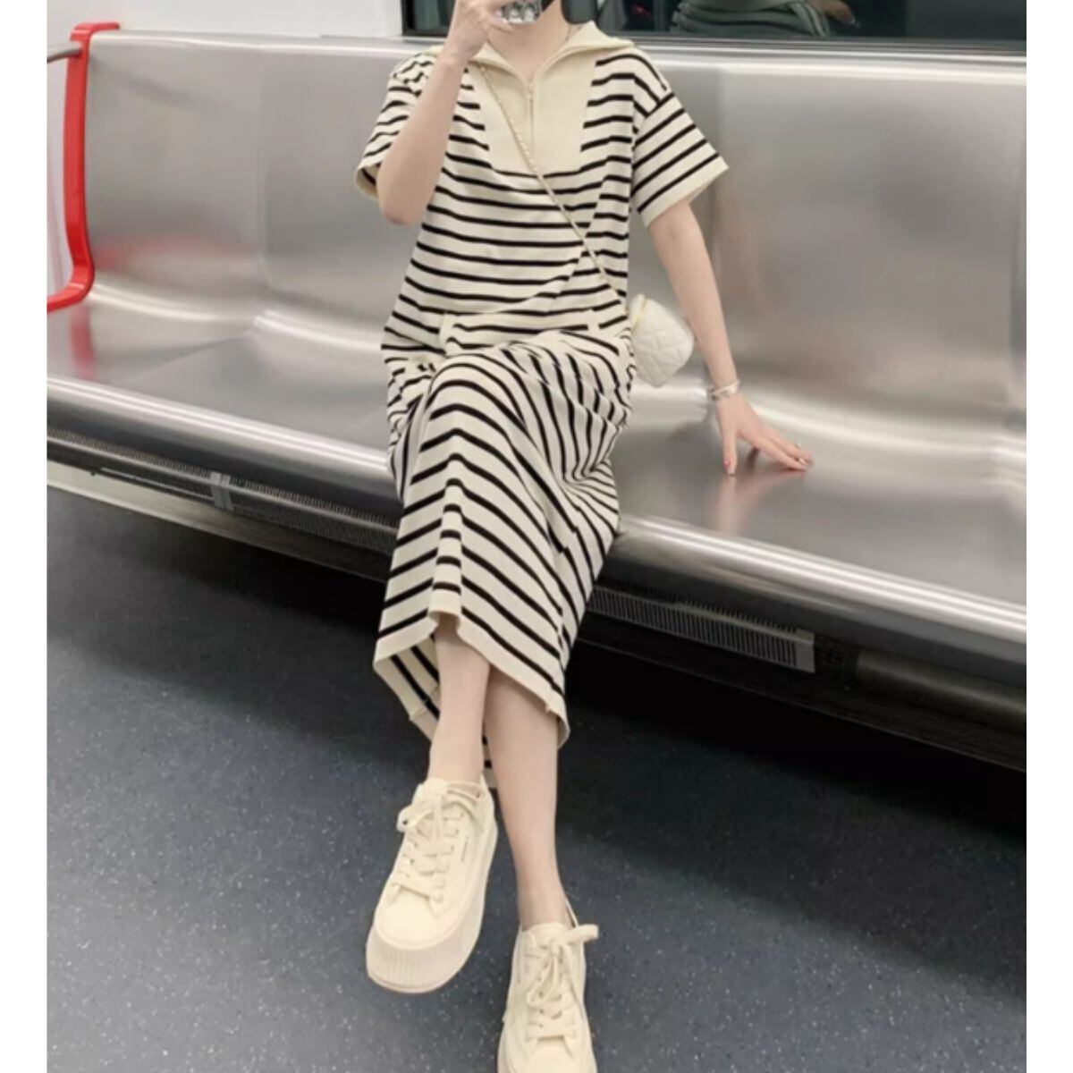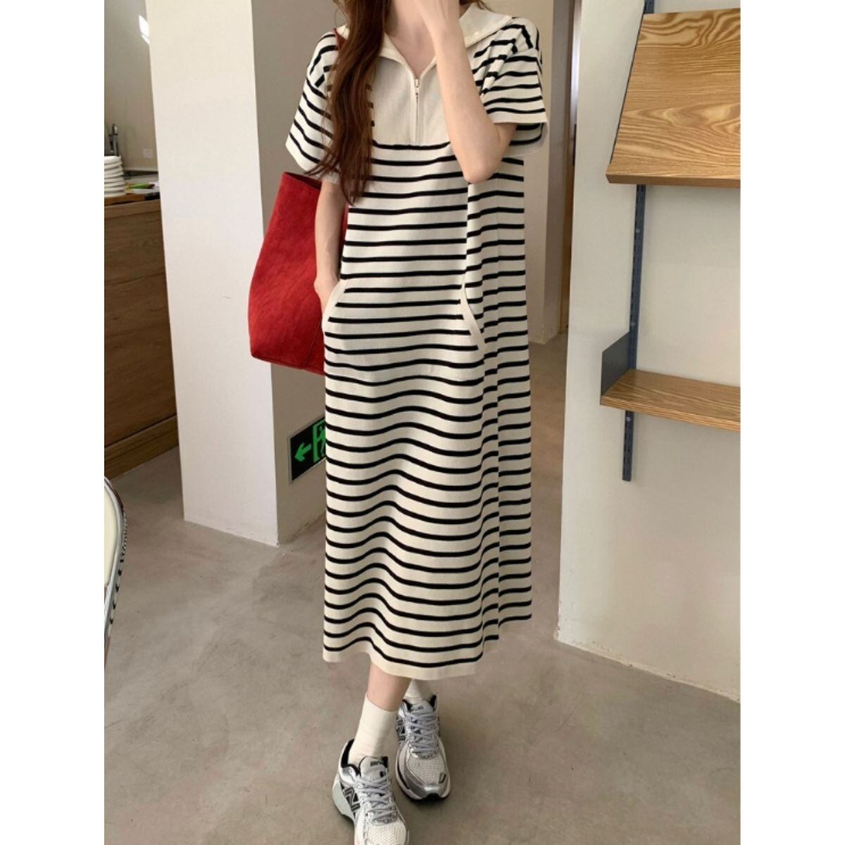 ワンピース スウェット ハーフジップ 半袖 ミモレ丈 ボーダー 柄 レディース Iライン リラックス