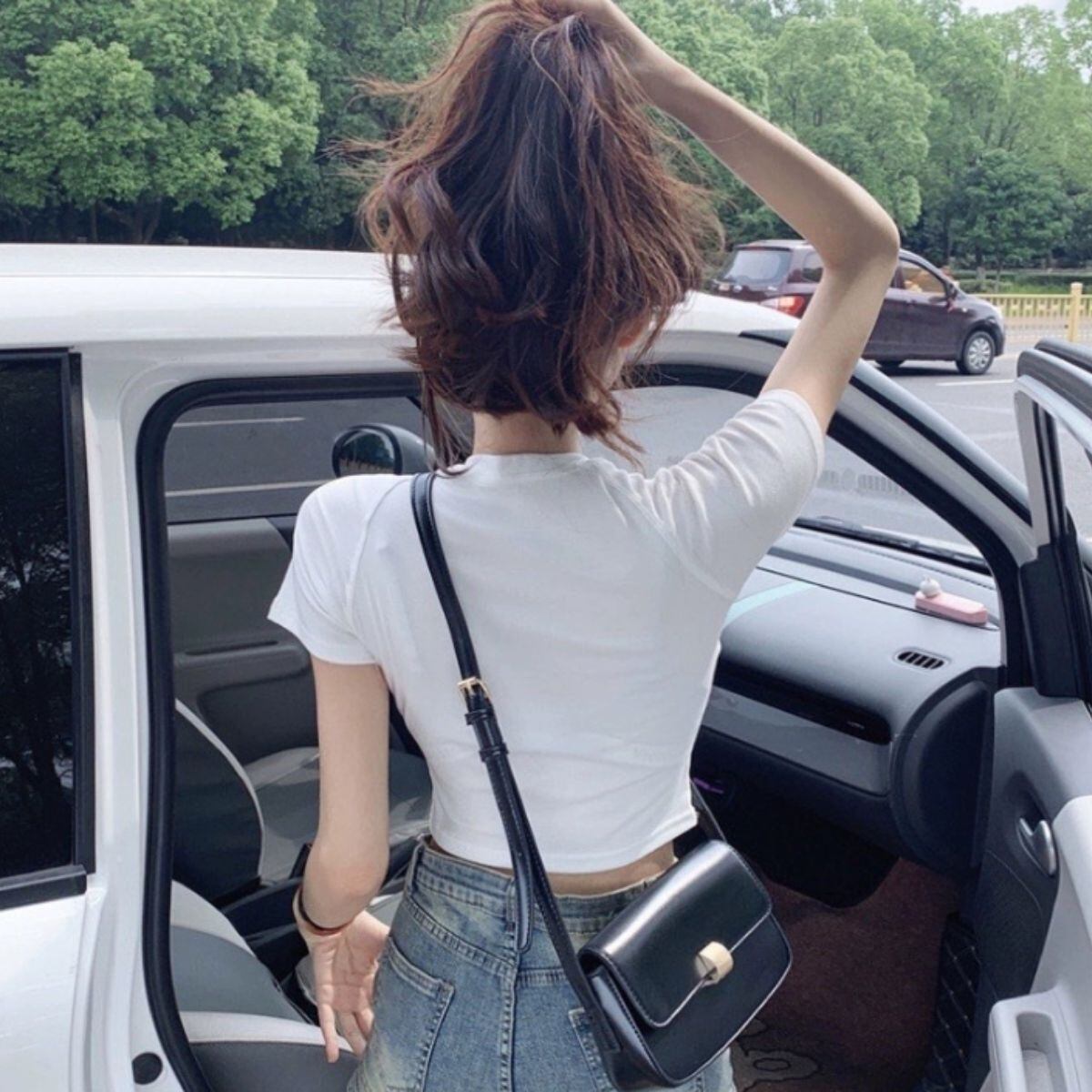 トップス 半袖 モチーフ バタフライ 蝶 ショート丈 細身 夏 レディース 韓国ファッション