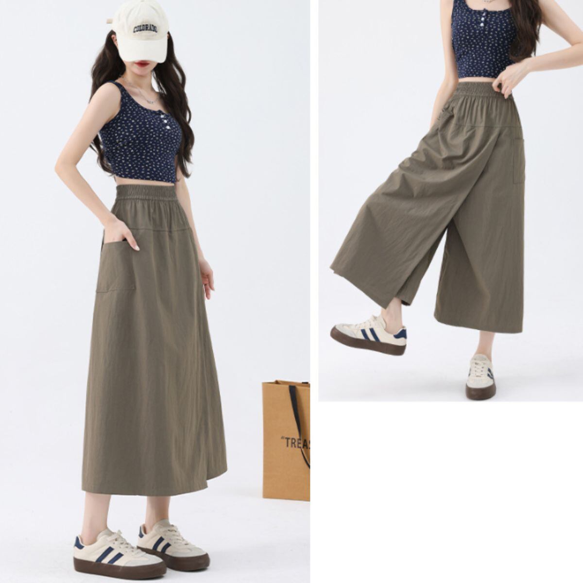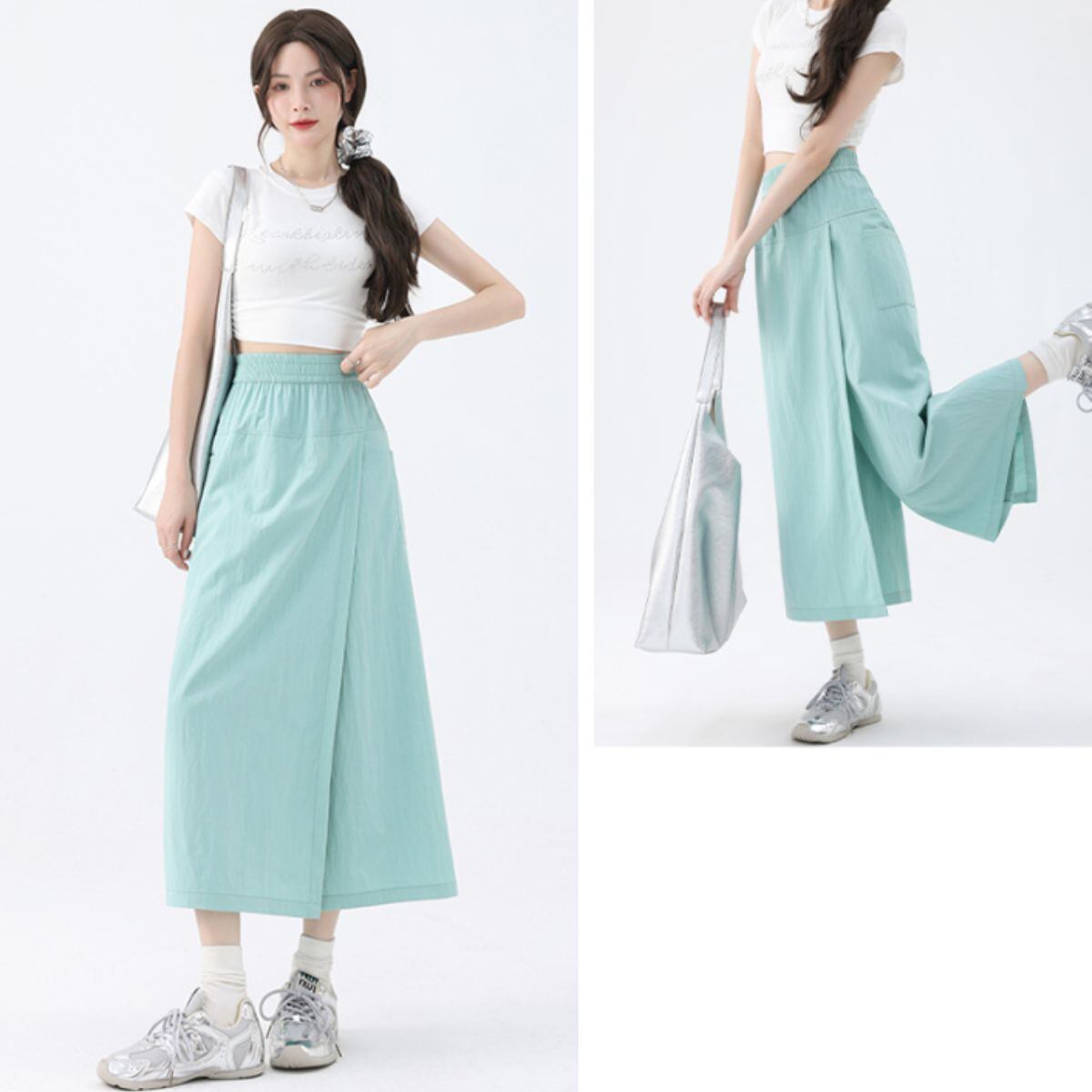 ガウチョ スカート ラップパンツ ウエストゴム ミモレ丈 春夏 レディース 韓国ファッション 無地