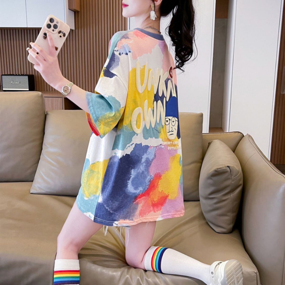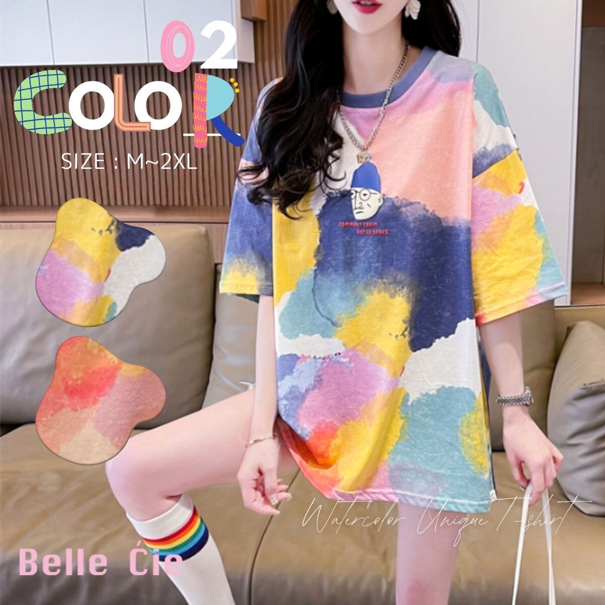 Tシャツ トップス 半袖 タイダイ 柄 絞り 水彩 イラスト カラフル ユニーク おじさん レディー