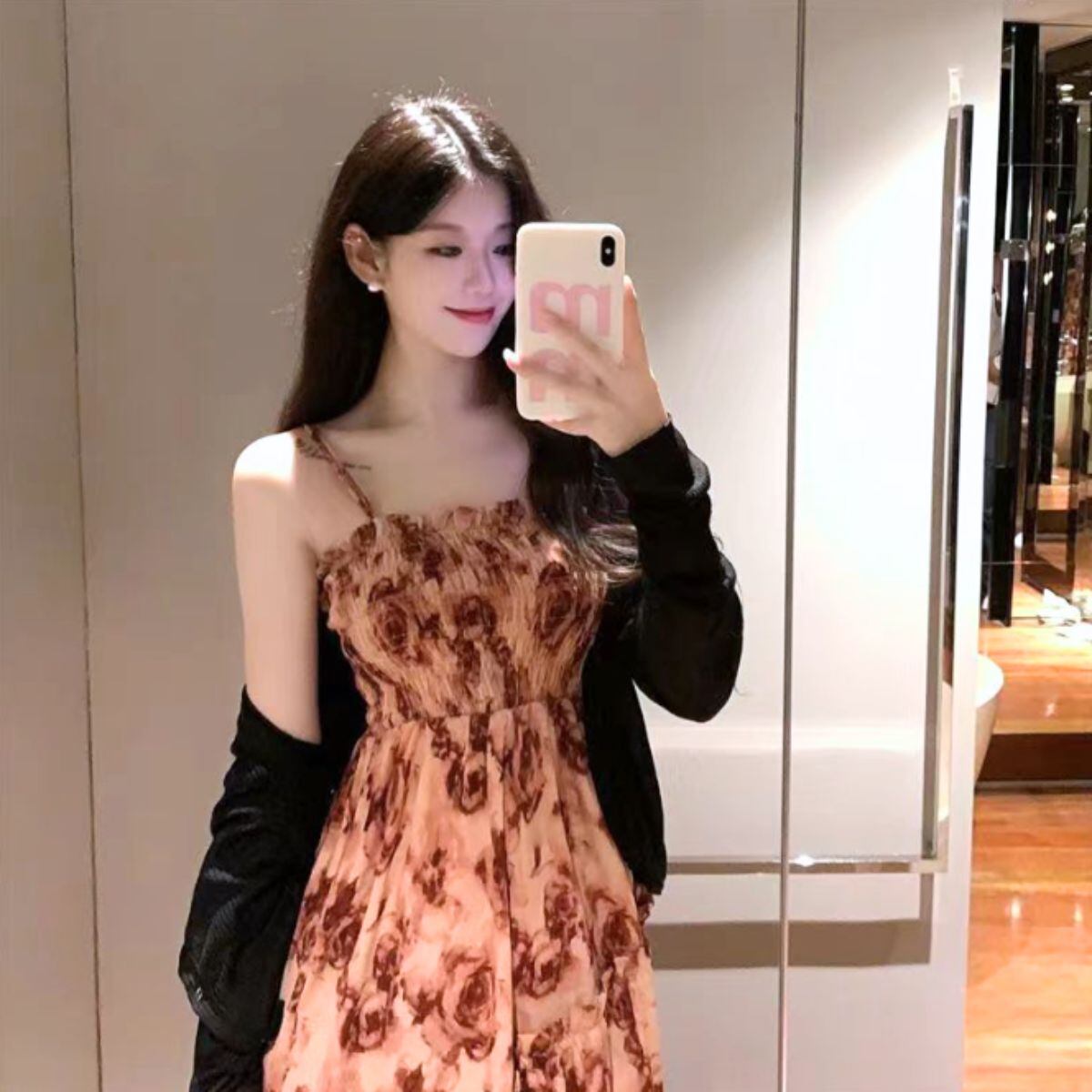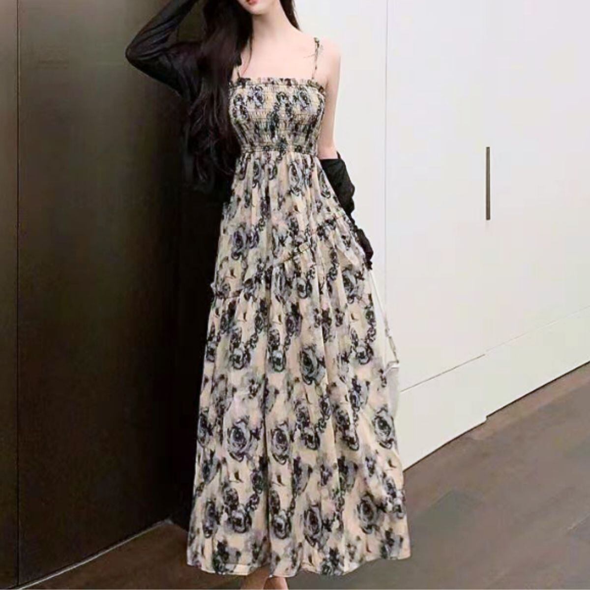 ワンピース レディース マキシ丈 ロングワンピース 花柄 レトロ キャミ紐 柄 キャミワンピ