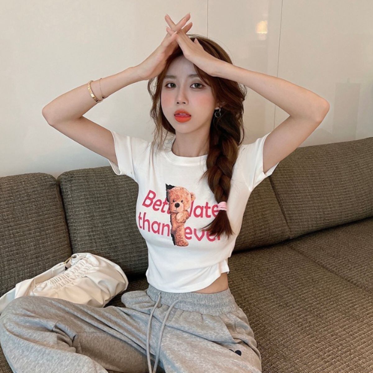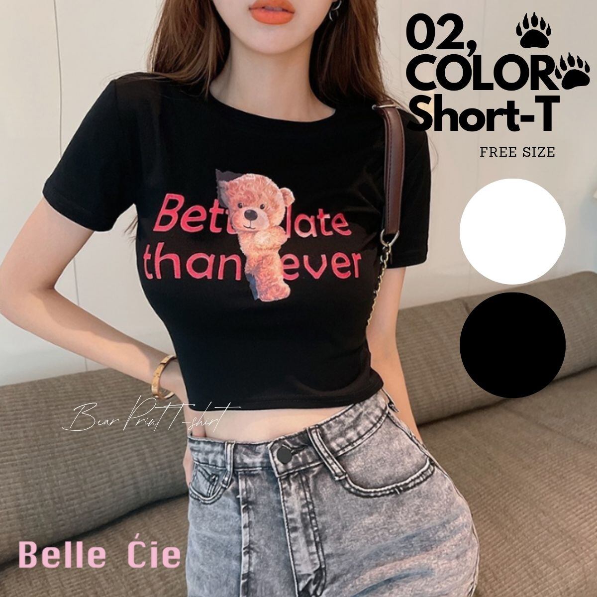 Tシャツ トップス 半袖 短丈 くま プリント 転写 原宿系 夏 レディース 韓国ファッション