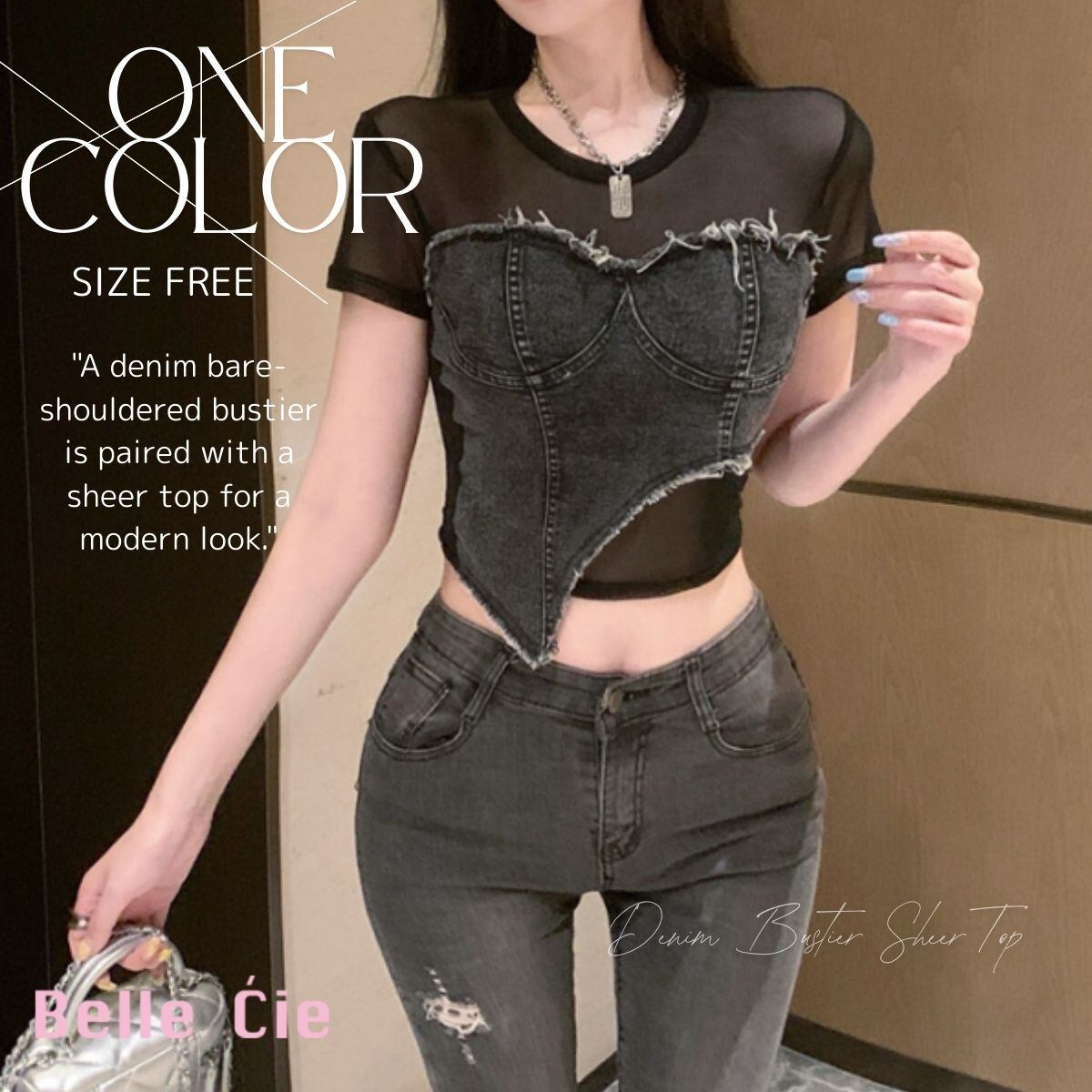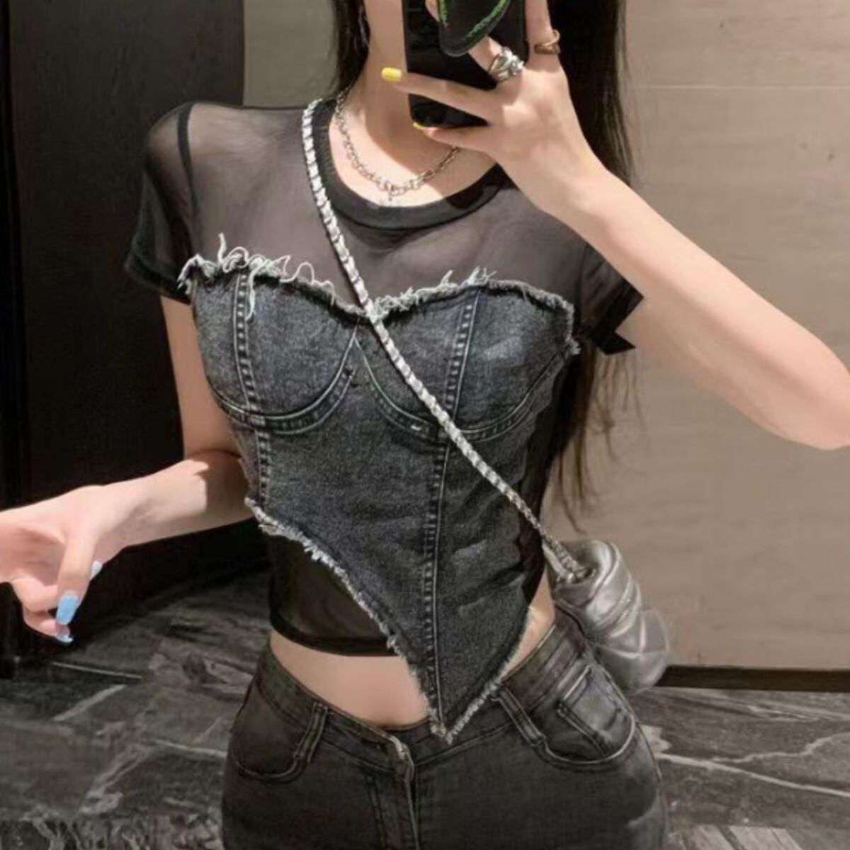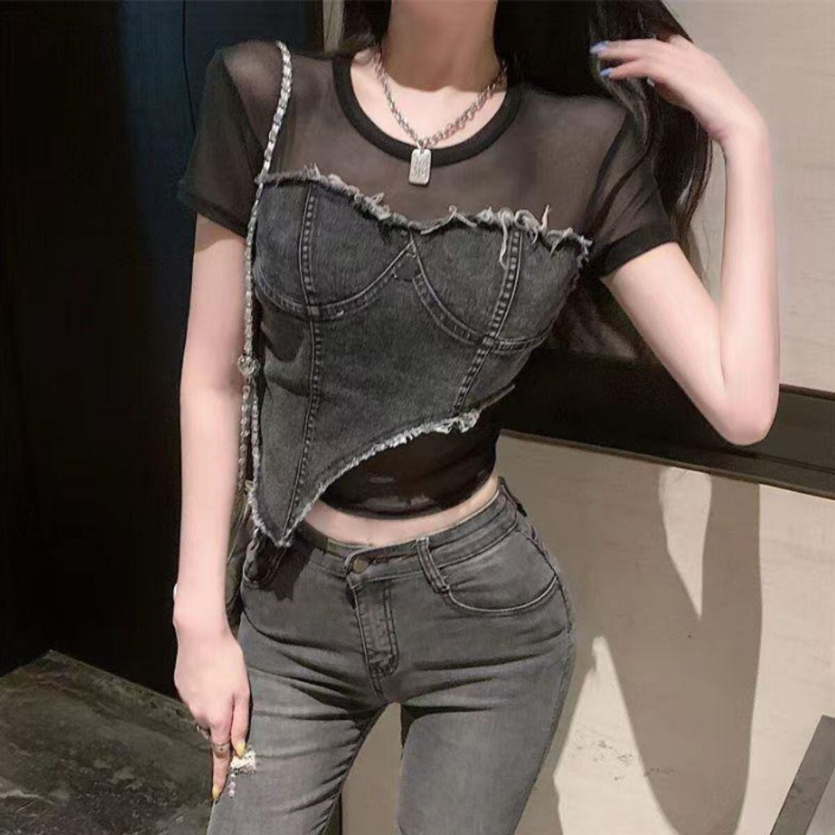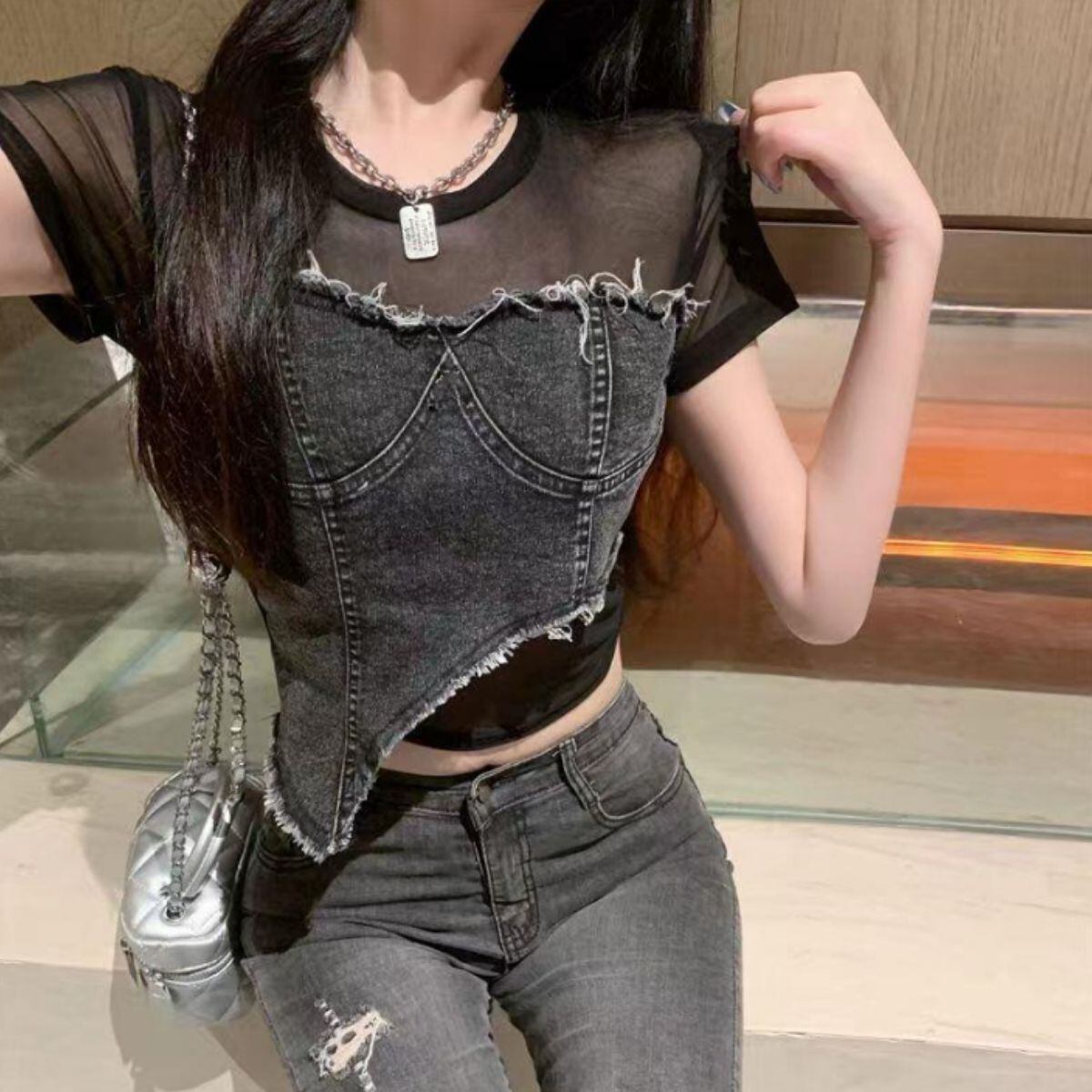 トップス 半袖 シアー デニム 透け感 短丈 ショート丈 春夏 黒 レディース カジュアル ストリー