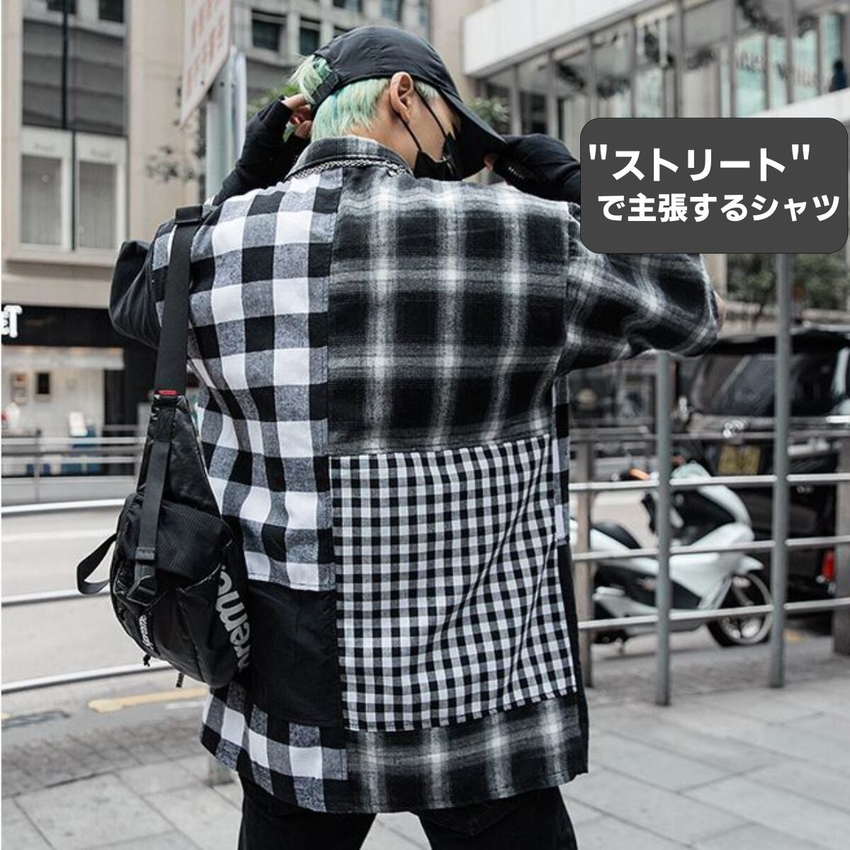 クレイジーパターン チェックシャツ メンズ ストリートファッション アシメ 半袖シャツ アシンメトリ