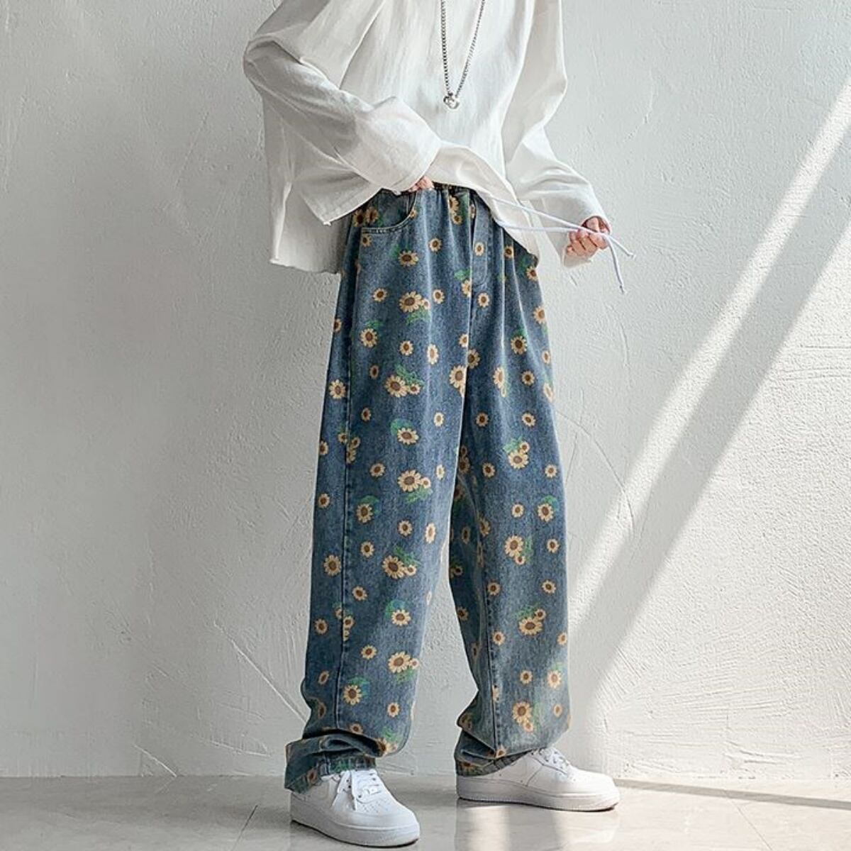 デニムパンツ メンズ ひまわり ストリートファッション 花柄 フラワー ゆったり ワイドパンツ ワイ