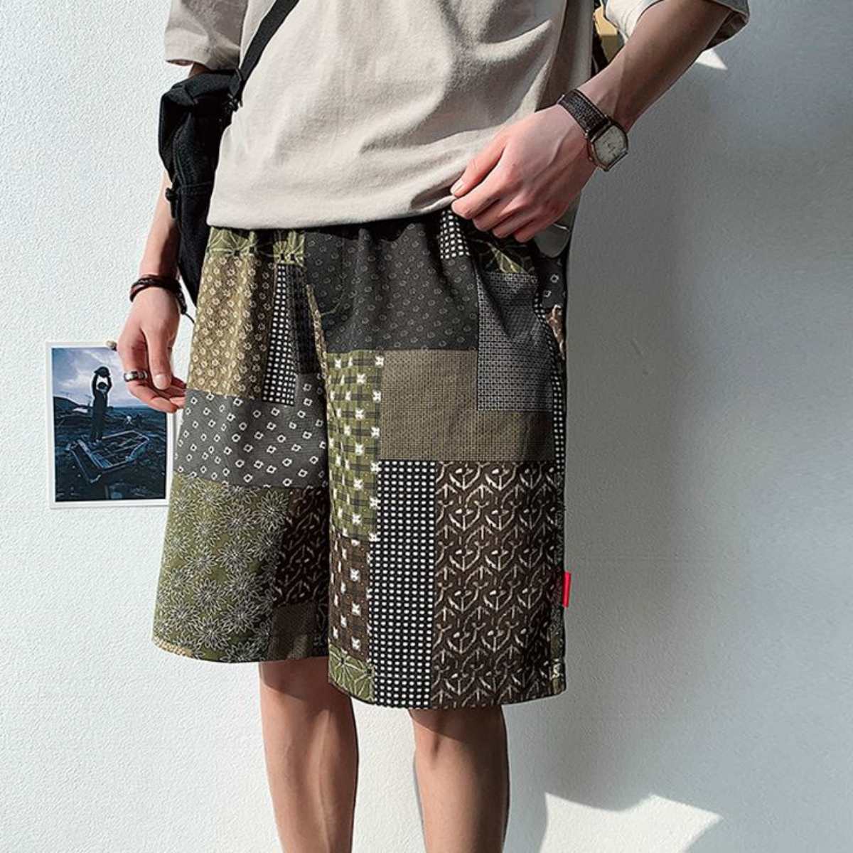 和柄パネルハーフパンツ メンズショーツ パネル柄 パッチワーク 個性的 ボトムス