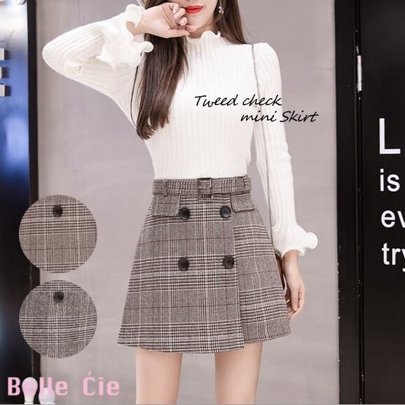 レディース ツイード スカート ラップスカート チェック柄 グレンチェック 台形スカート 韓国ファッ
