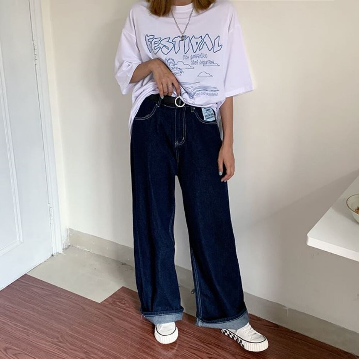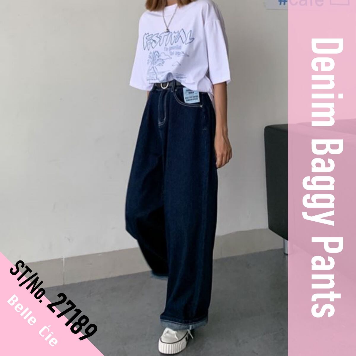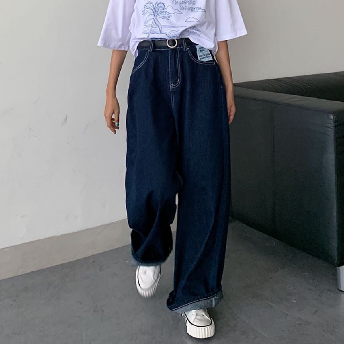 デニムバギーパンツ ワンウォッシュ ゆったり ワイドパンツ ロールアップ ジーンズ デニムパンツ き