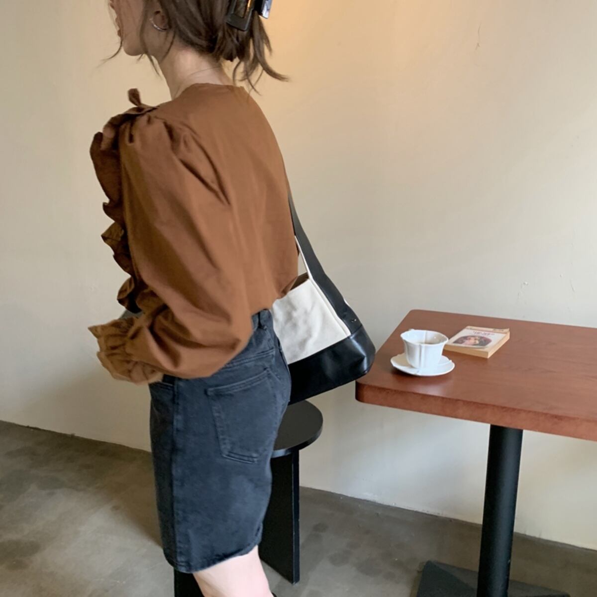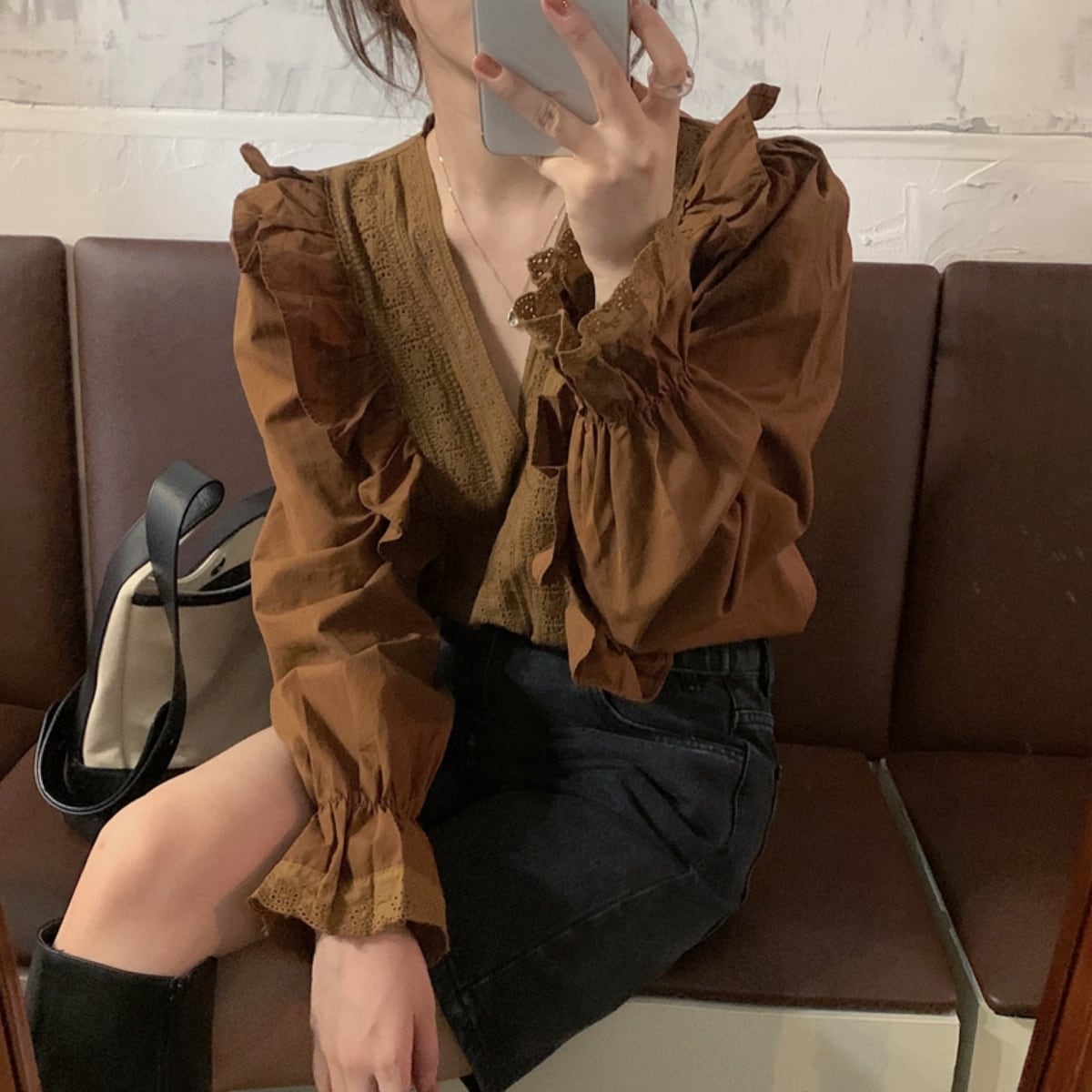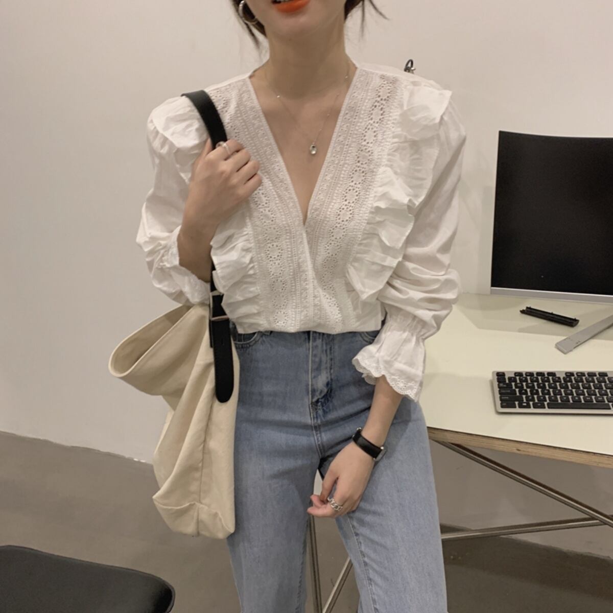 ラッフルレースVネックトップス ブラウス プルオーバー レディース 韓国ファッション オルチャン ガ