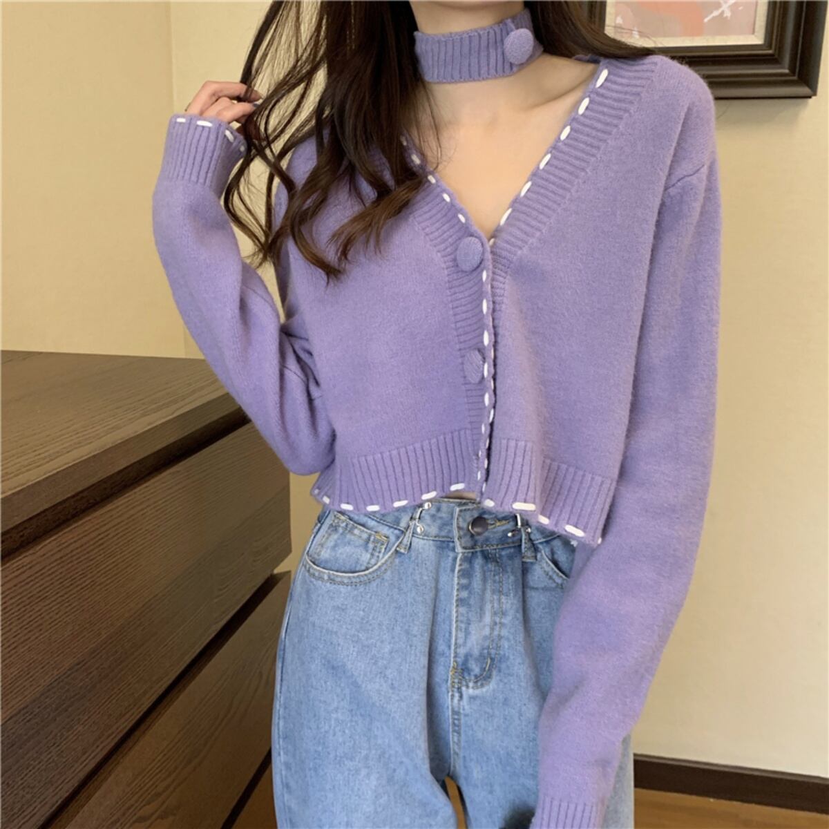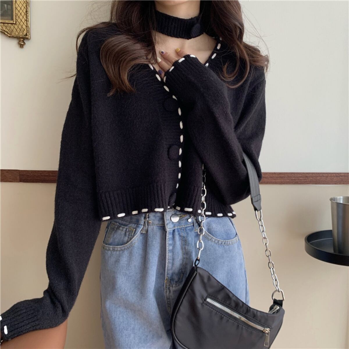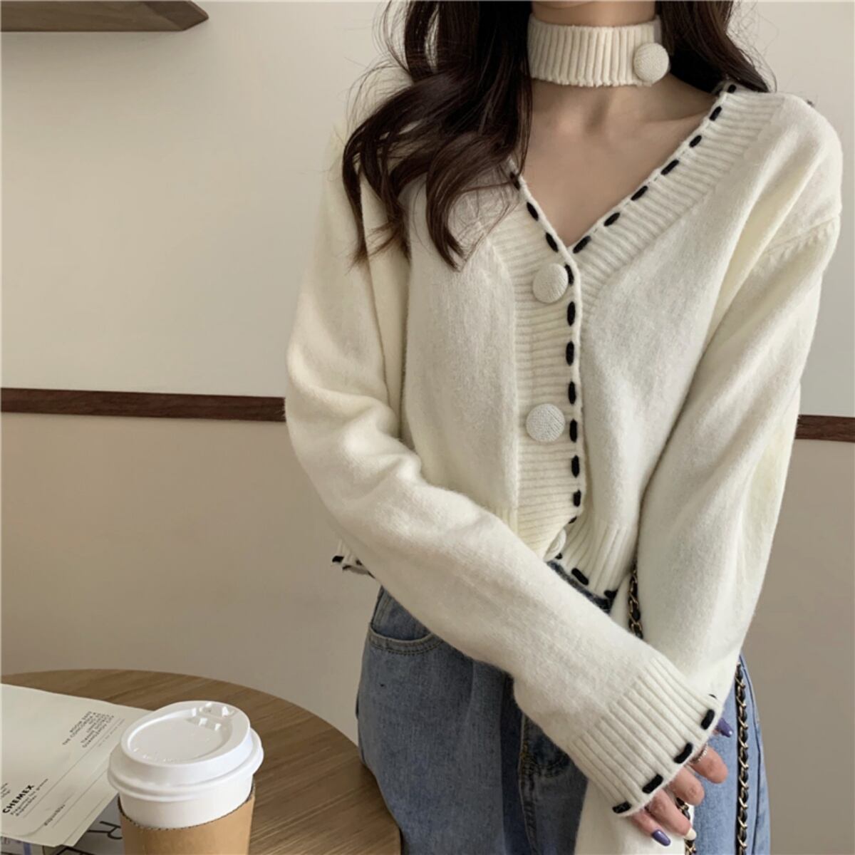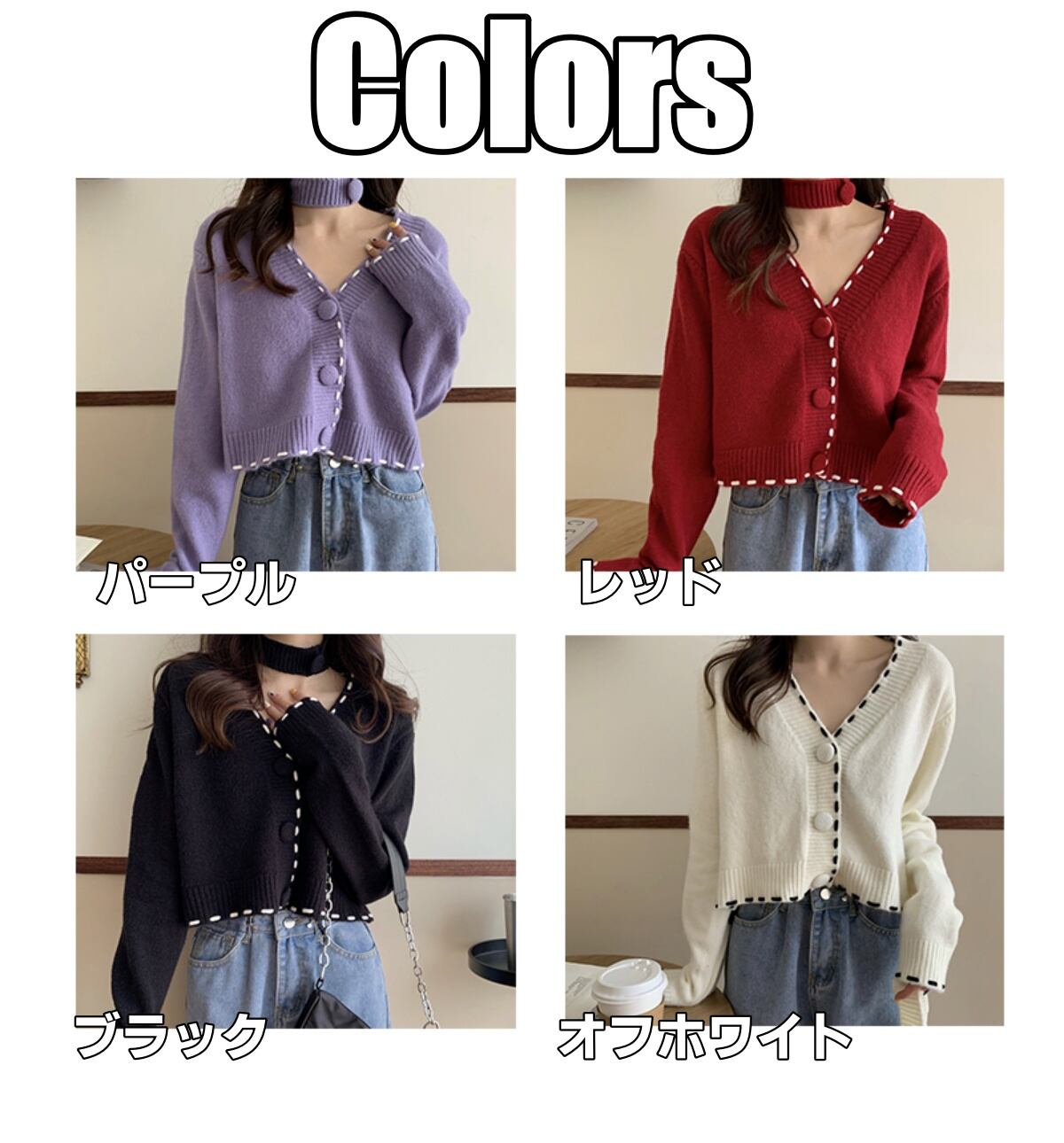 ショート丈 ニッ カーディガン ステッチ配色 レディース セーター Vネック トップス 韓国ファッシ