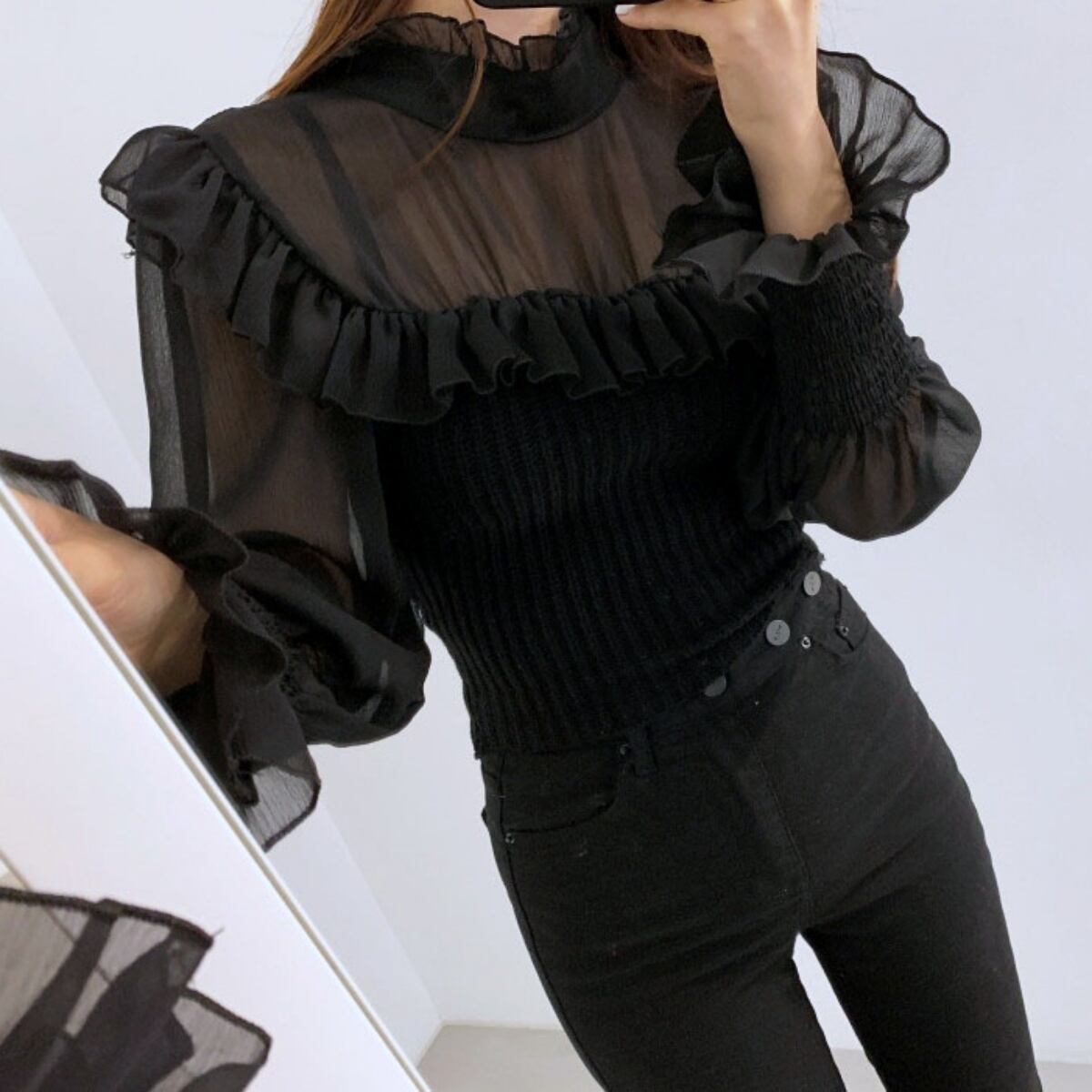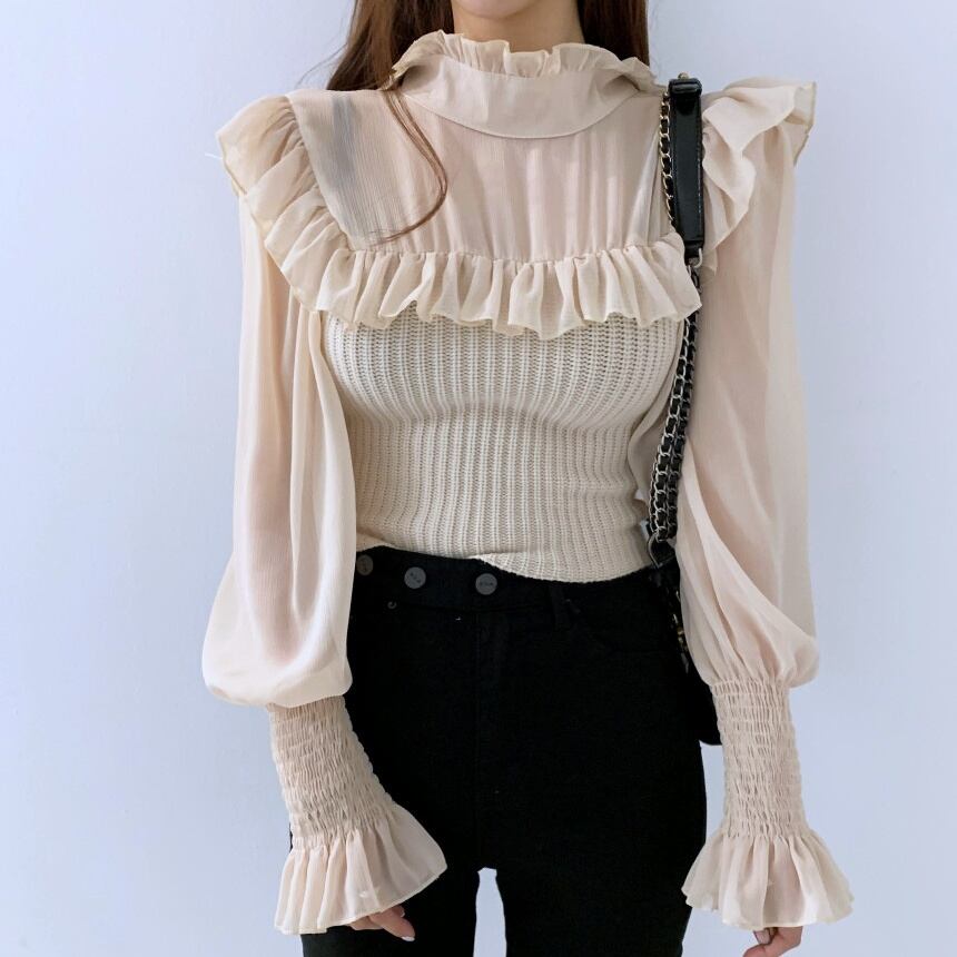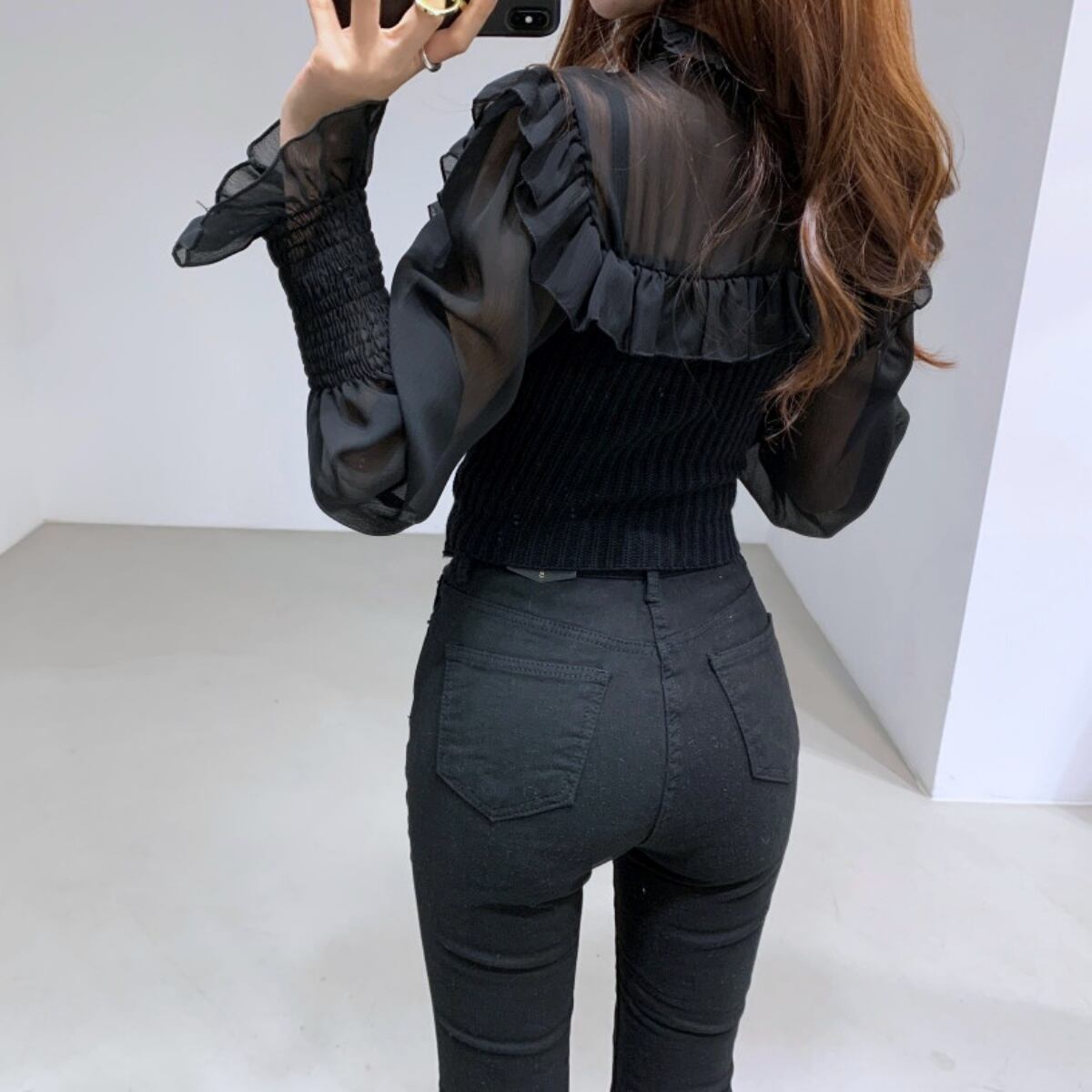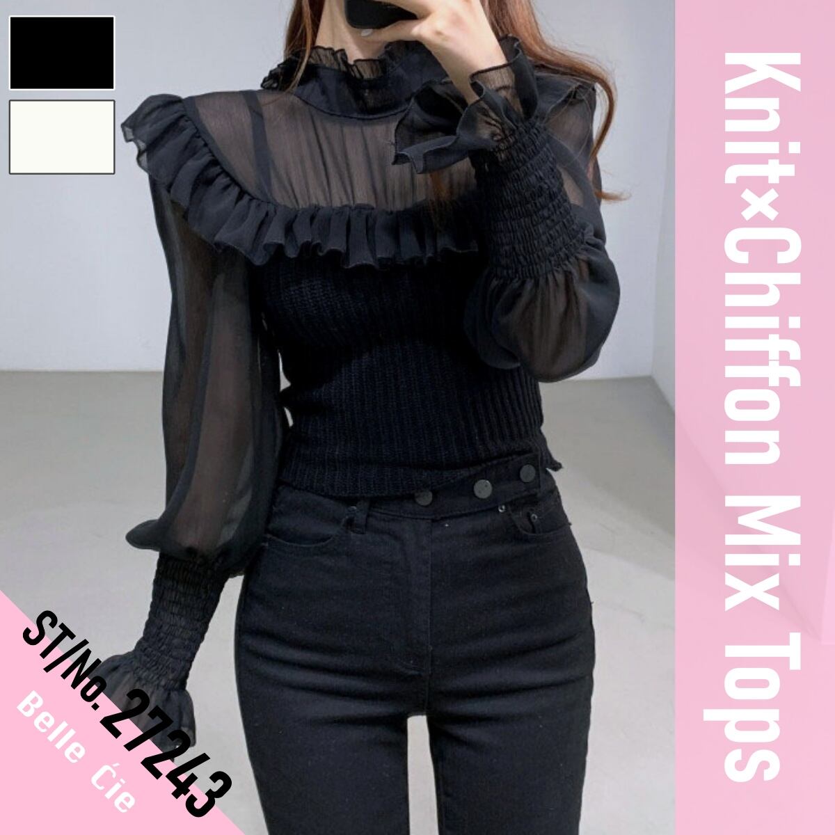 シアー切り替えニットトップス ラッフル衿 ベルスリーブ シャーリング ベルスリーブ シフォン ベルシ