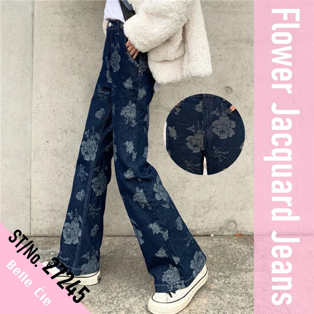 フラワージャカード フレアデニムパンツ 韓国ファッション レディース 花柄 薔薇 ジーンズ ベルシー