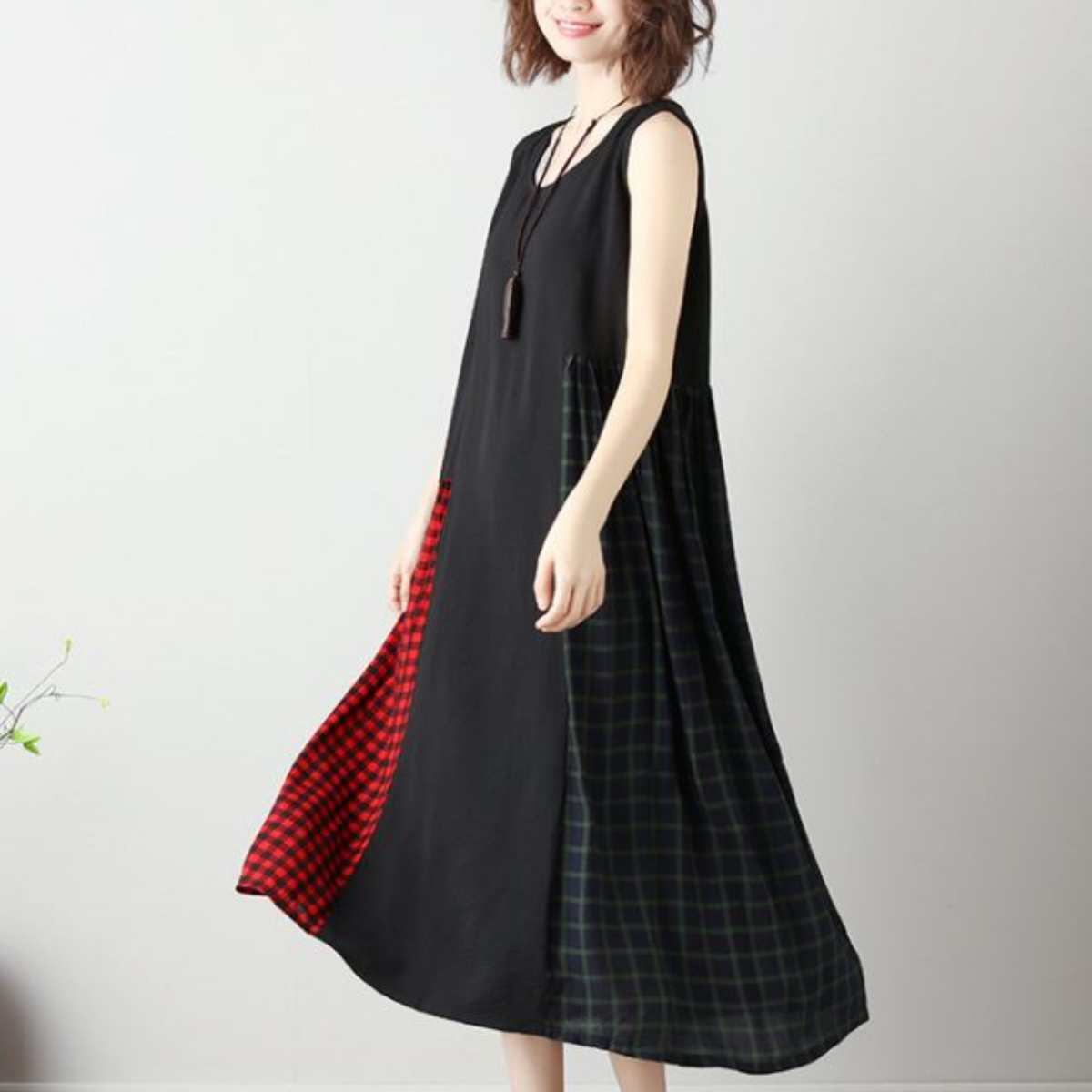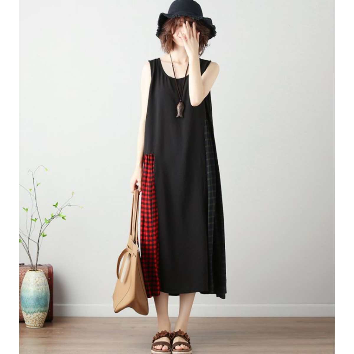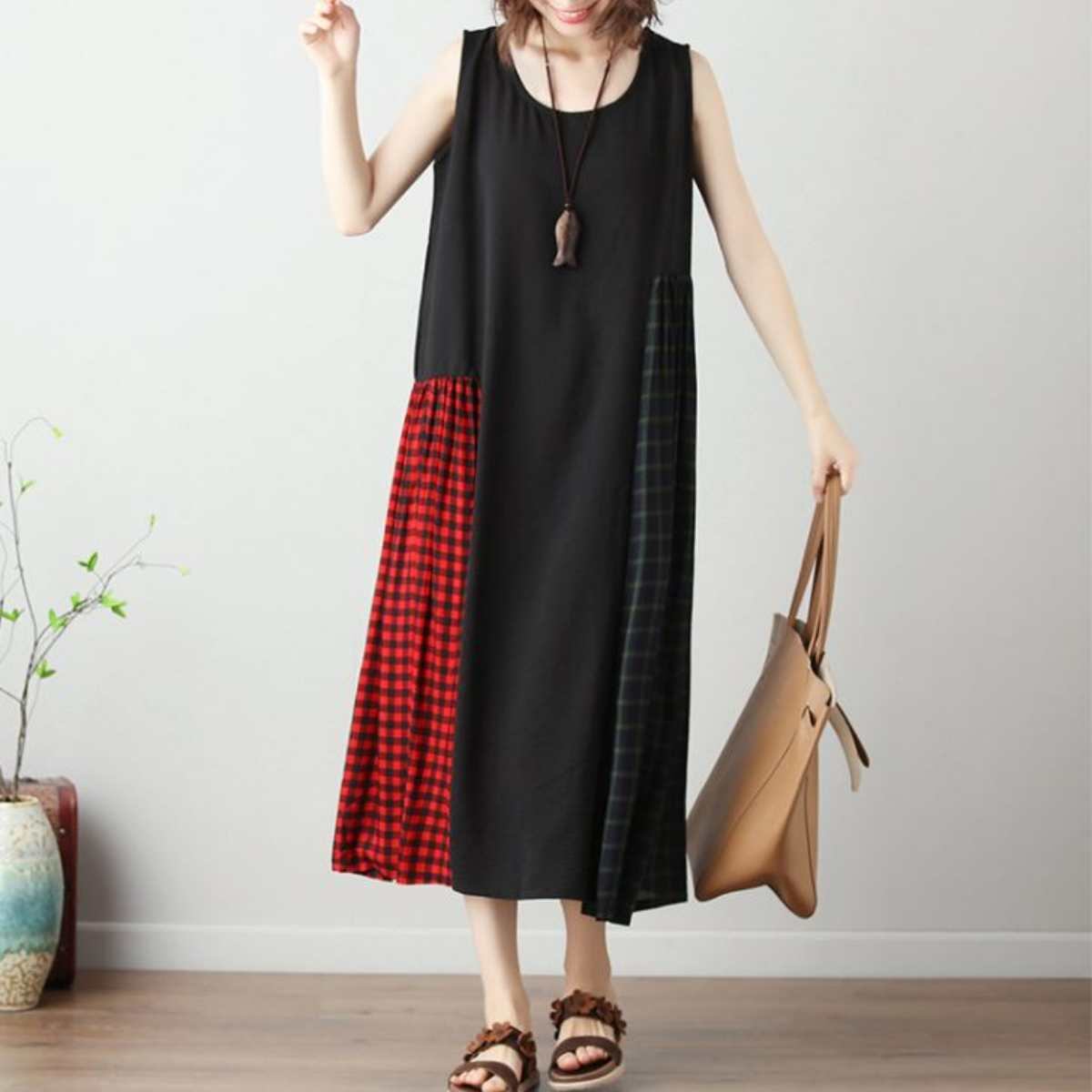 チェック配色 マキシワンピース レディース サンドレス 夏 ロングワンピース サマードレス タンク