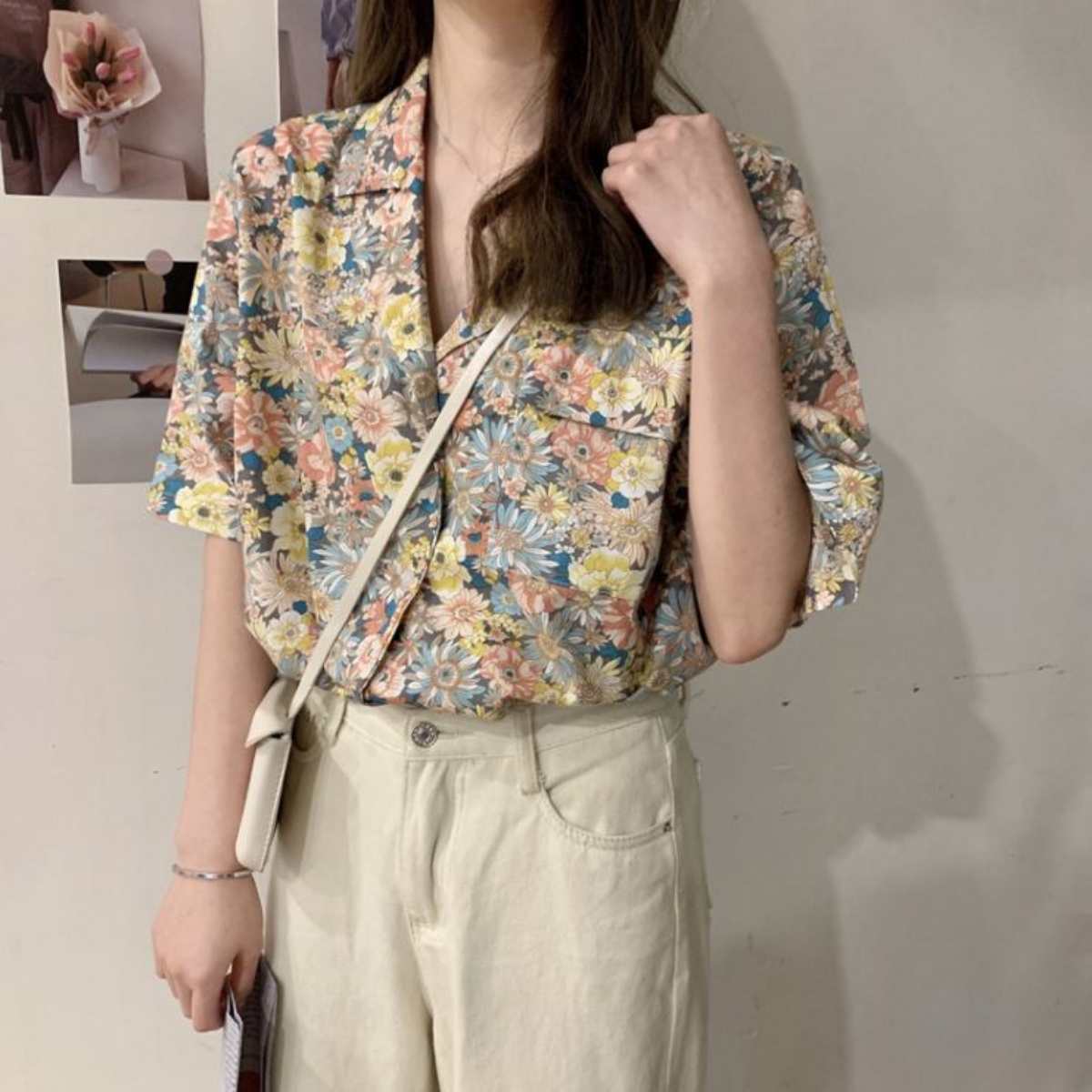 リバティプリント開襟シャツ レディース 半袖シャツ 小花柄 オープンカラー 韓国ファッション ベルシ