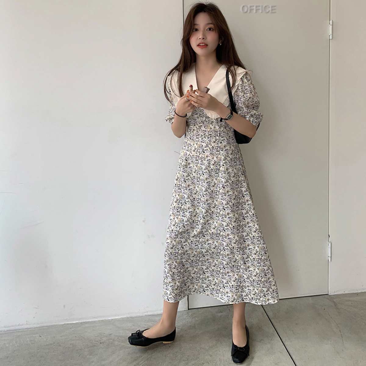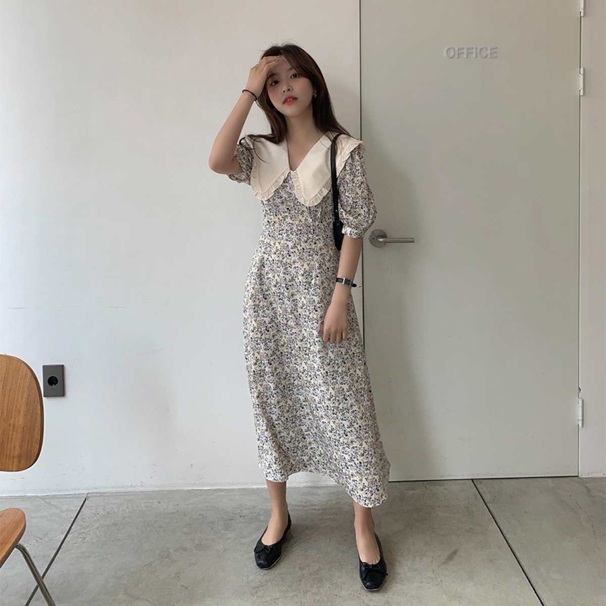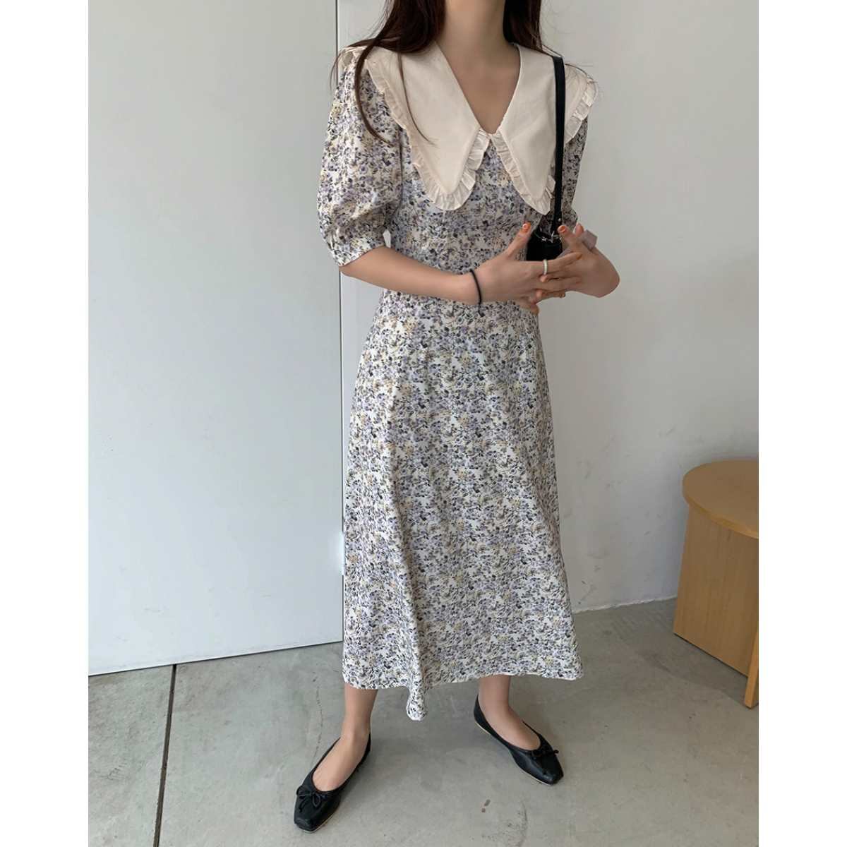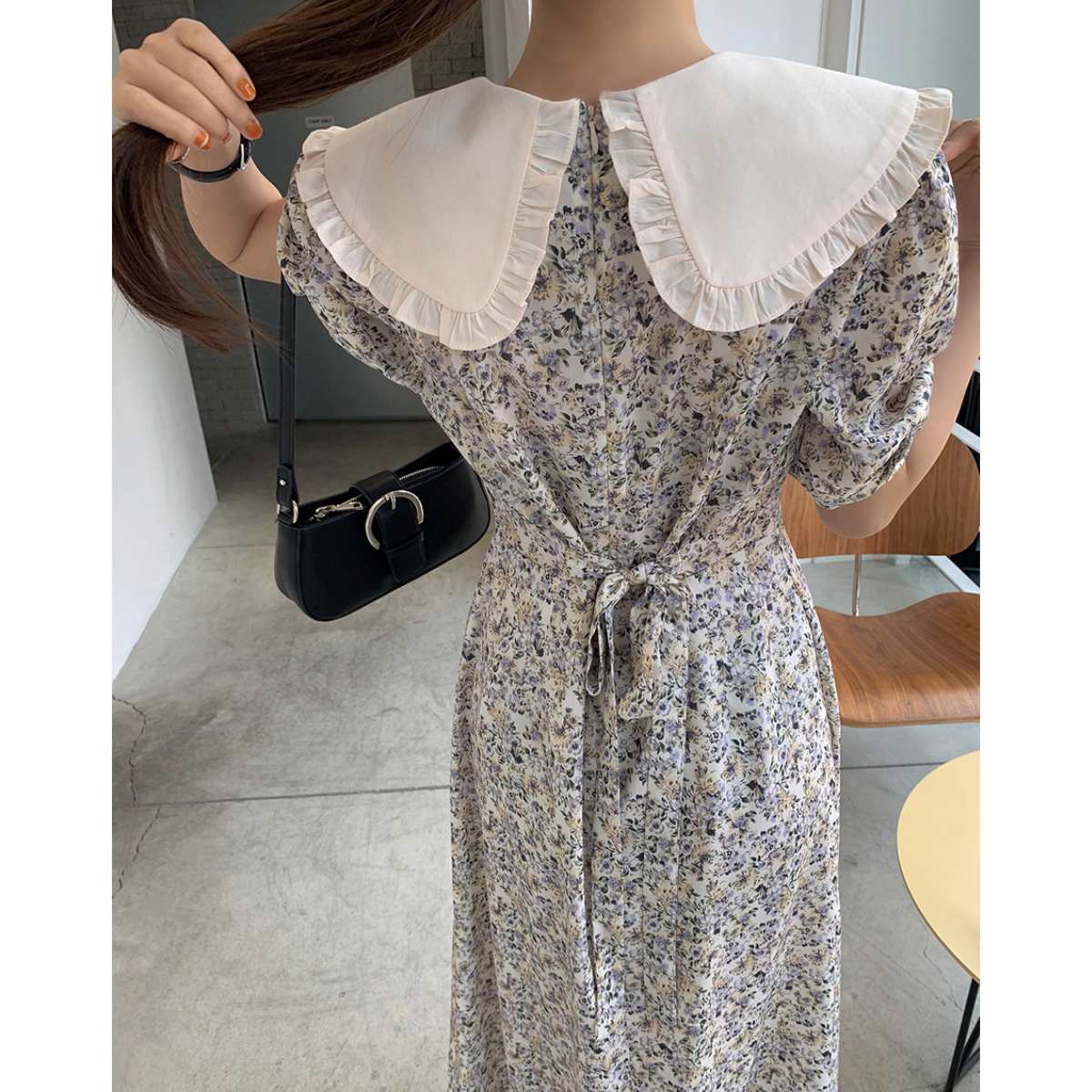 小花柄フリルギャザー衿ワンピース 韓国ファッション ガーリー Aライン ワンピ リバティー花柄 レデ