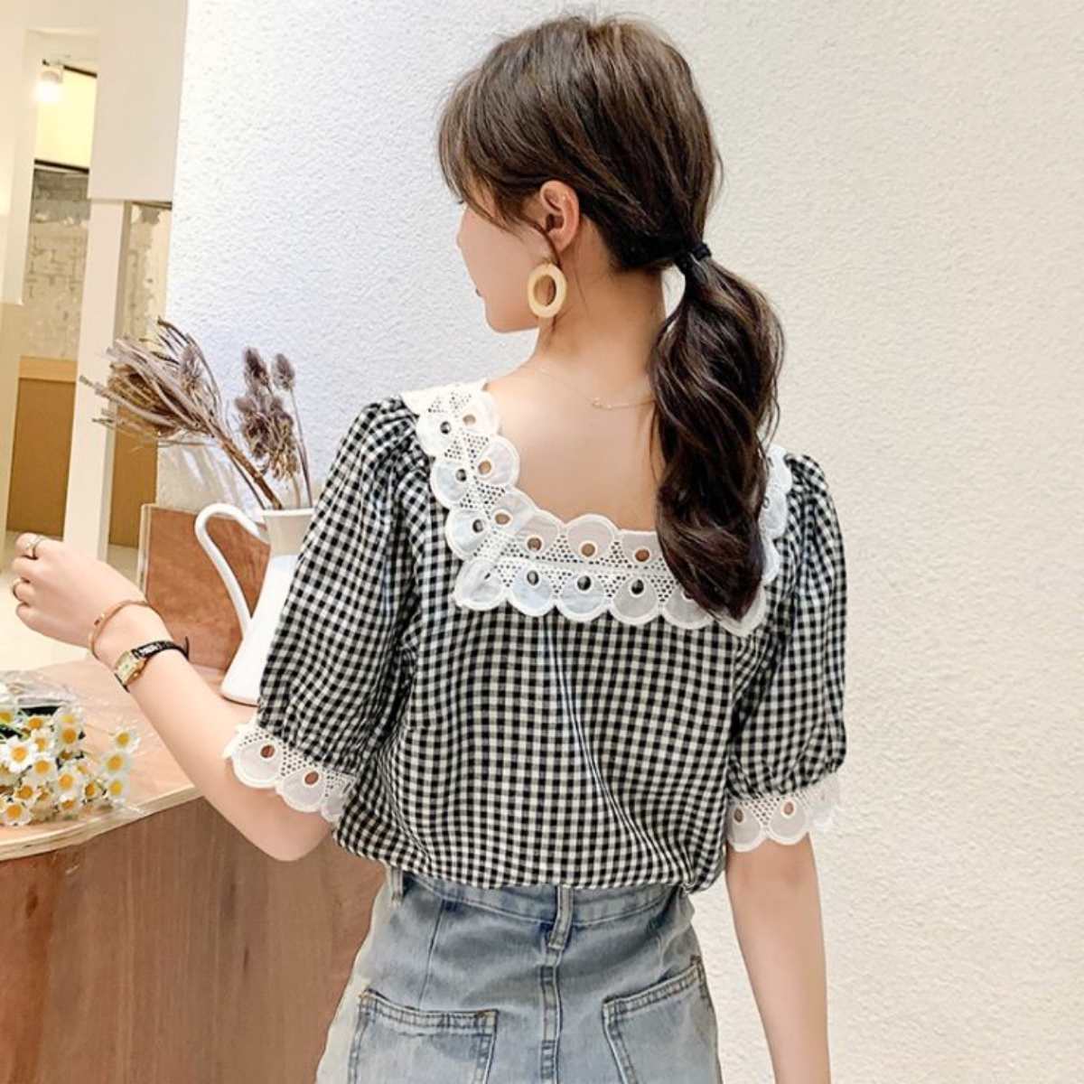 ギンガムチェック ブラウス トップス レディース ガーリー レース フェミニン ナチュラル 韓国ファ