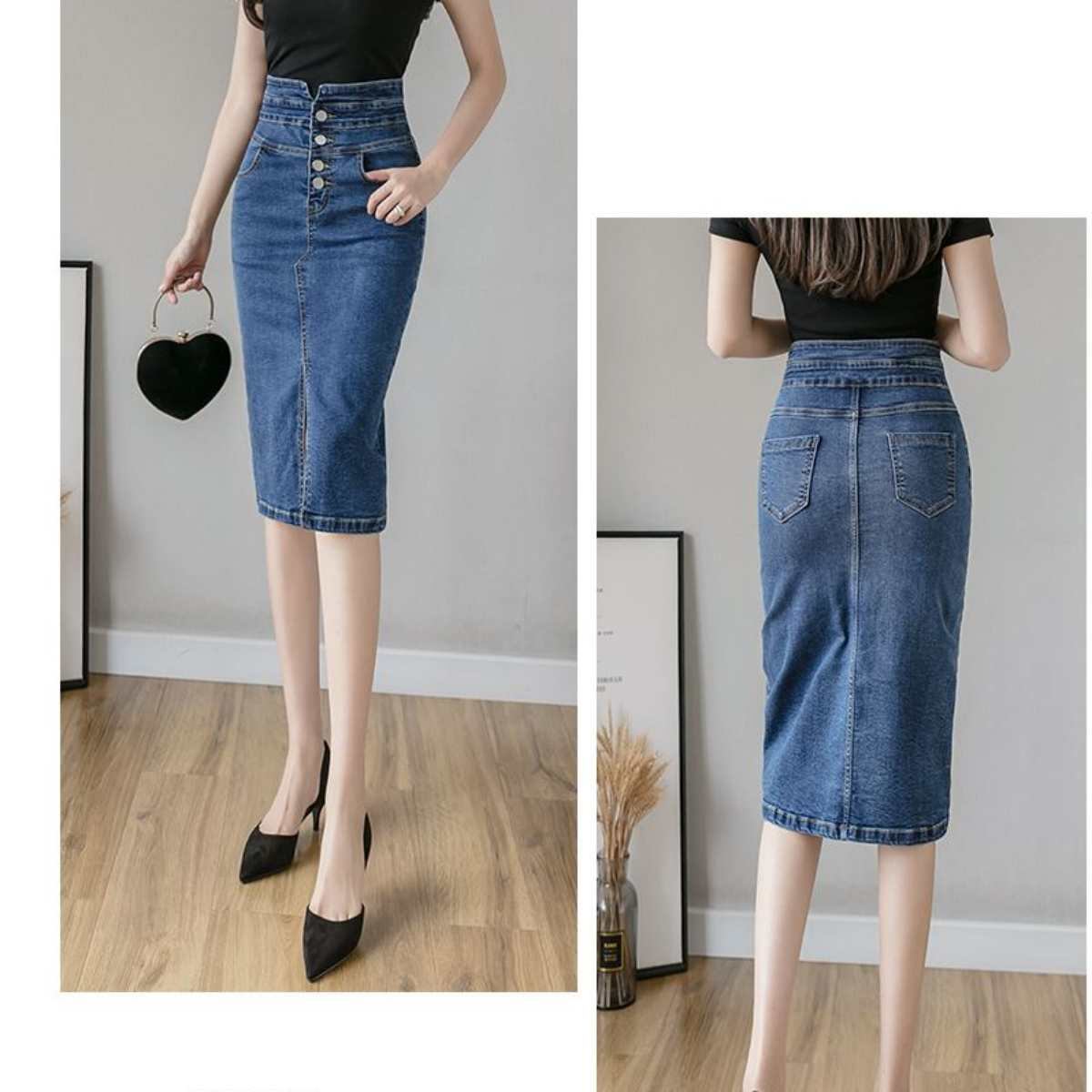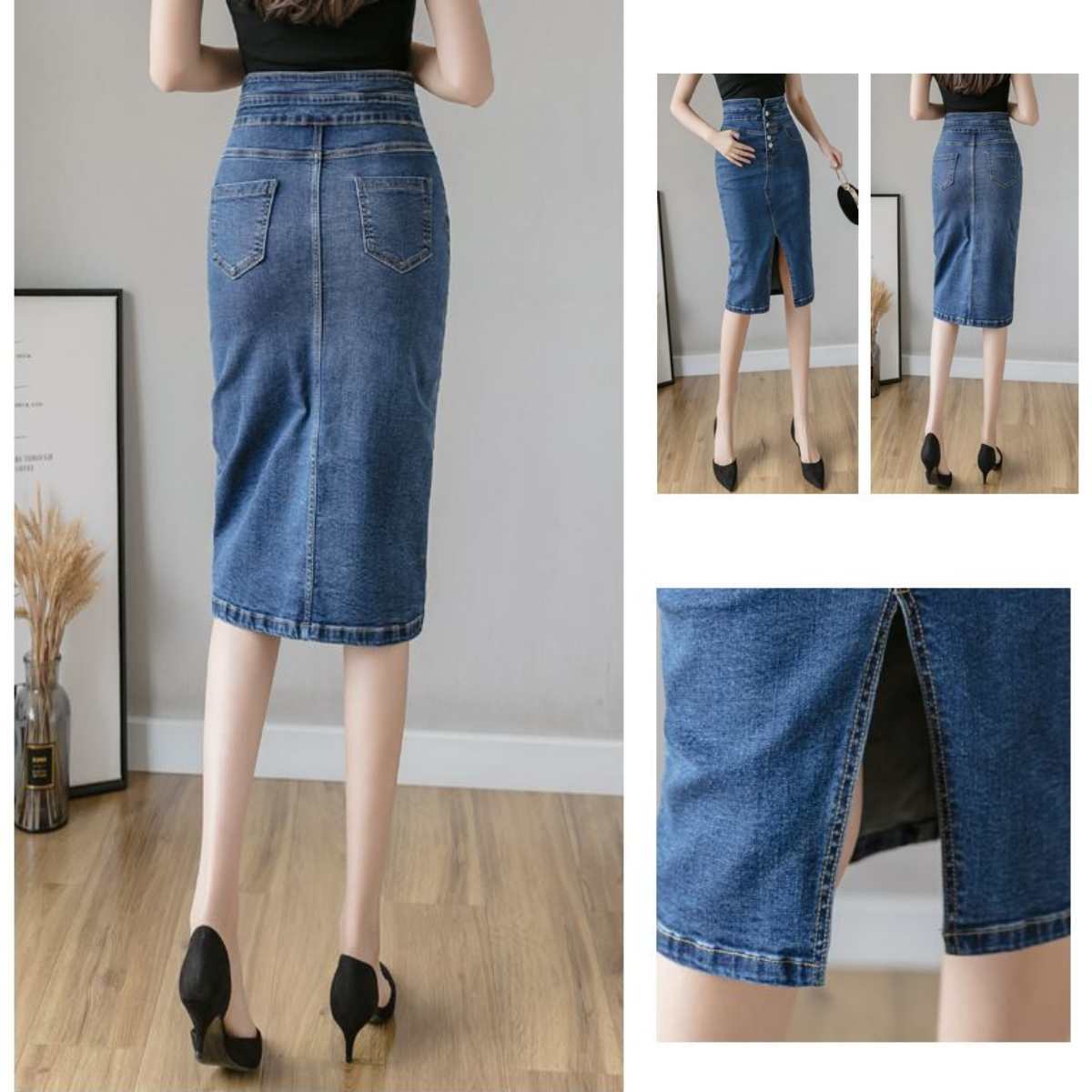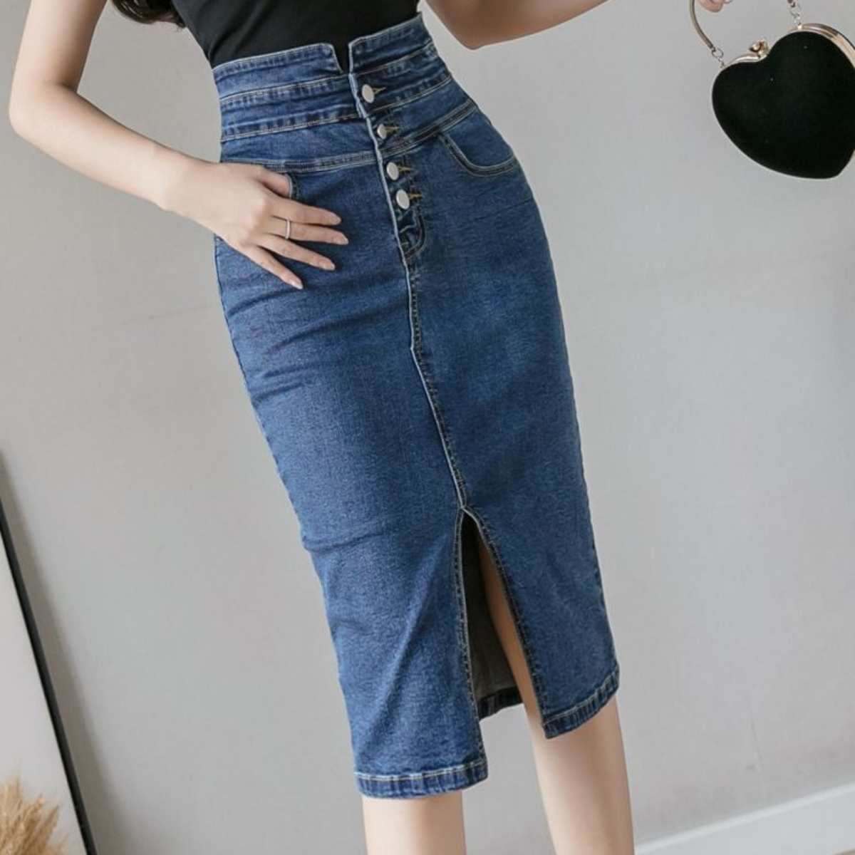 タイトスカート ストレッチデニム ひざ下丈 スリット スカート ジーンズ ハイウエスト デニムスカー