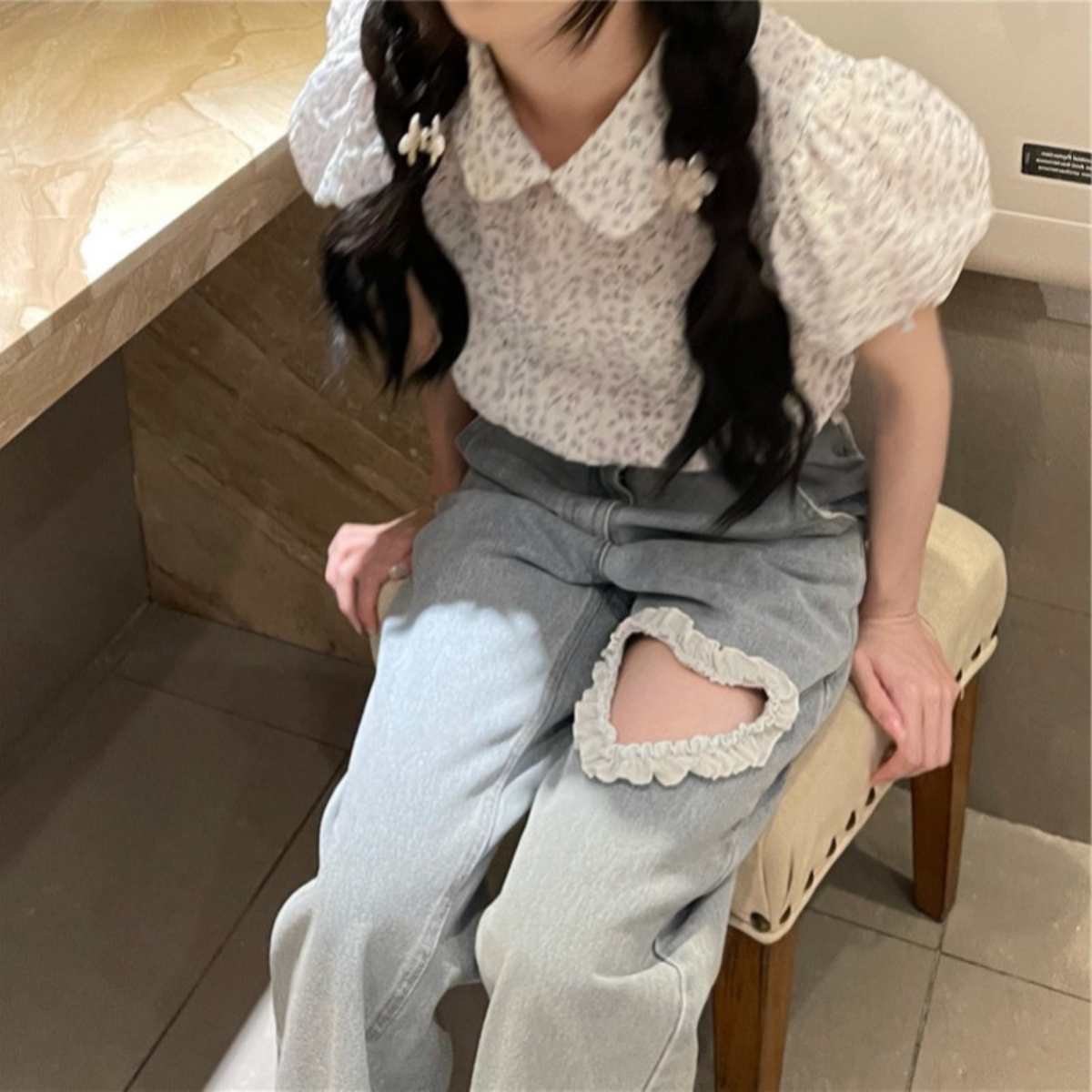 くりぬきレース デニムパンツ ジーンズ レディース 韓国ファッション ガーリー カジュアル Gパン