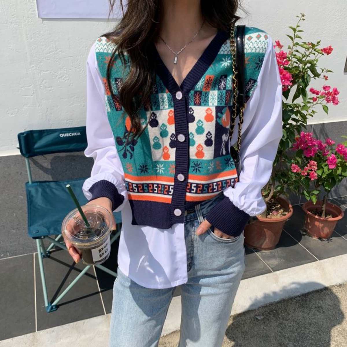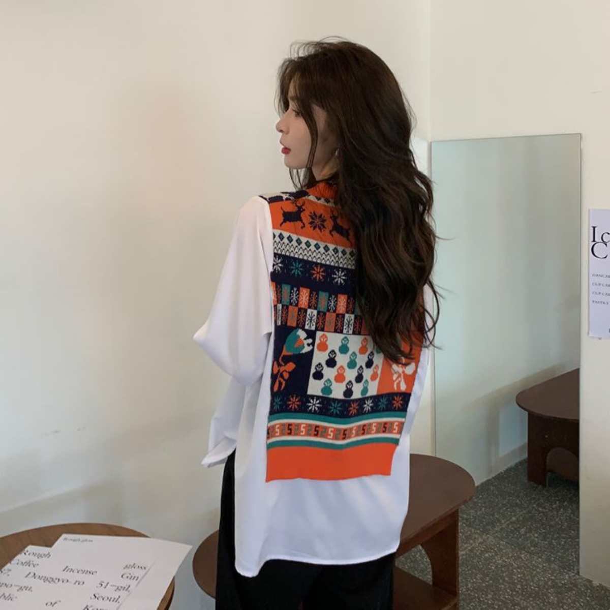 ノルディックニット配色シャツ レディース フェイクレイヤード ニットベスト トップス 雪柄ジャガード