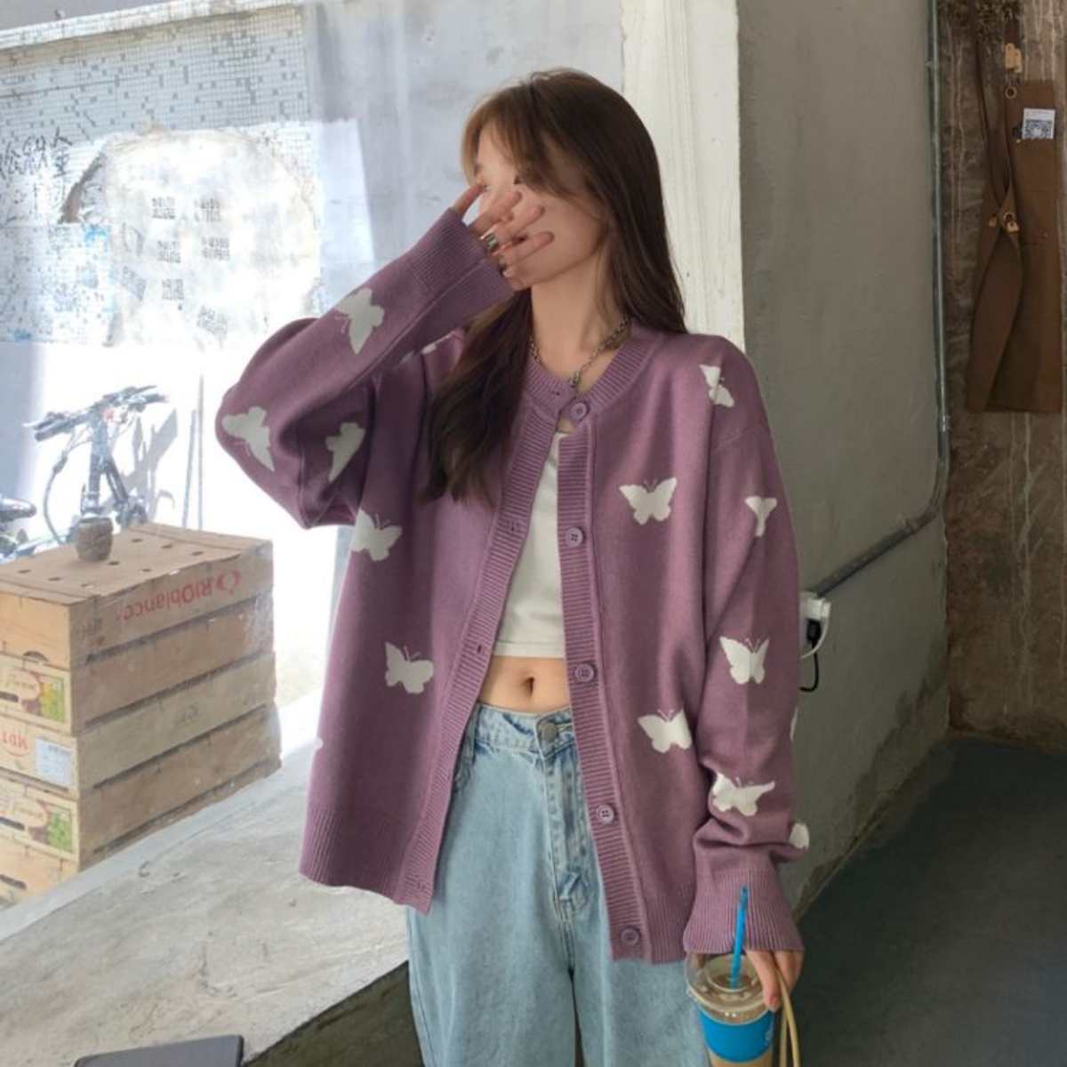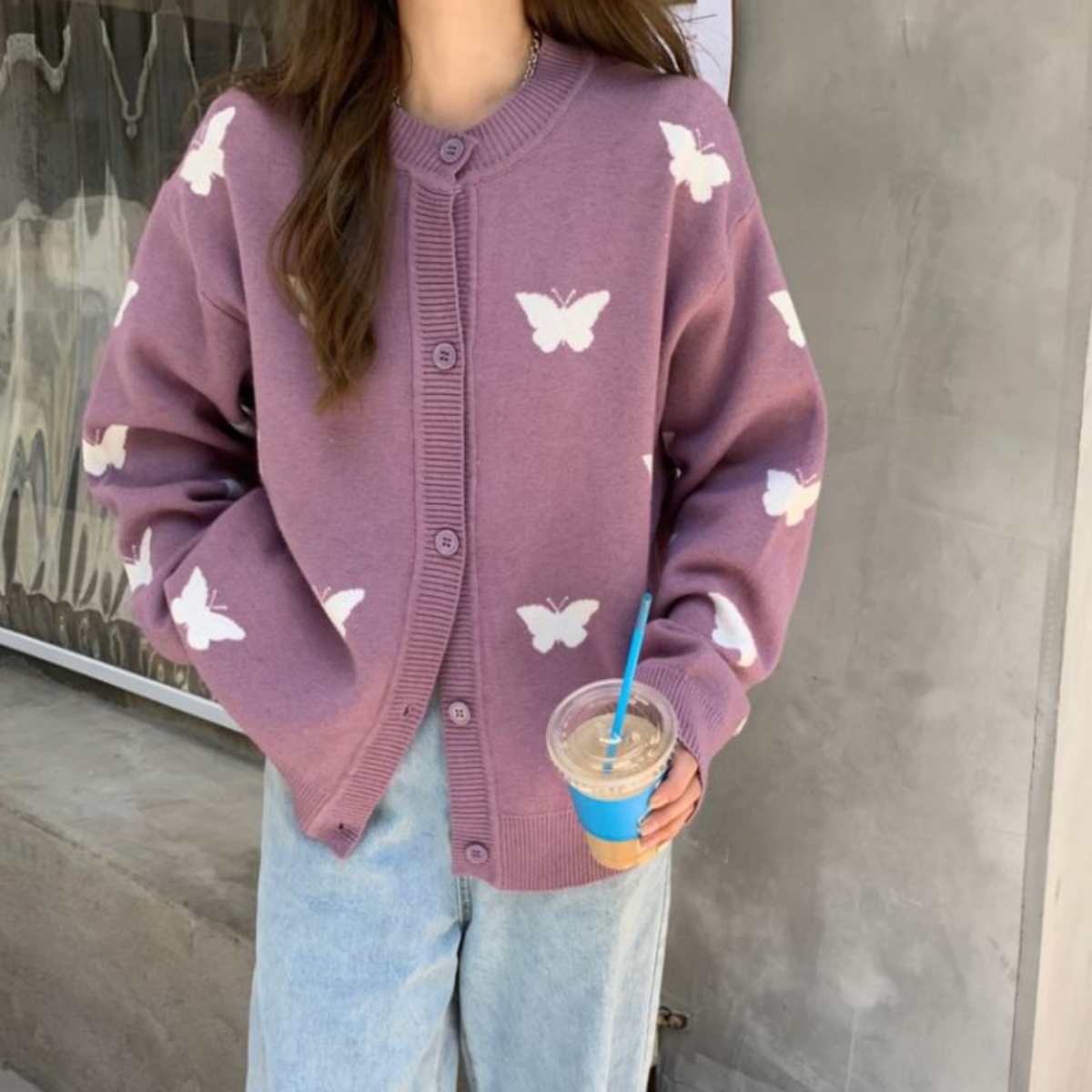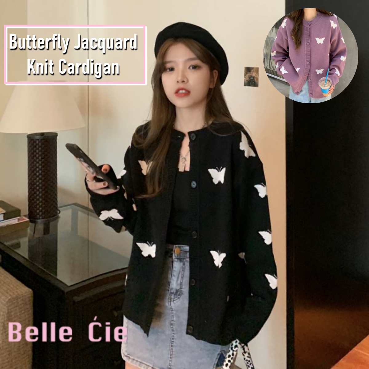 バタフライジャカード ニットカーディガン レディース 秋冬 丸首 カーデ 蝶ジャガード 韓国ファッシ