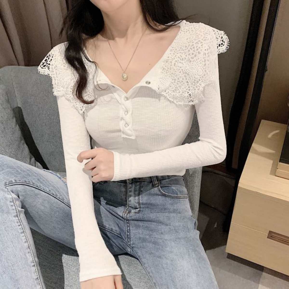 衿ぐりレース使い スラブテレコ Tシャツ トップス レディース カットソー おしゃれ かわいい 韓国