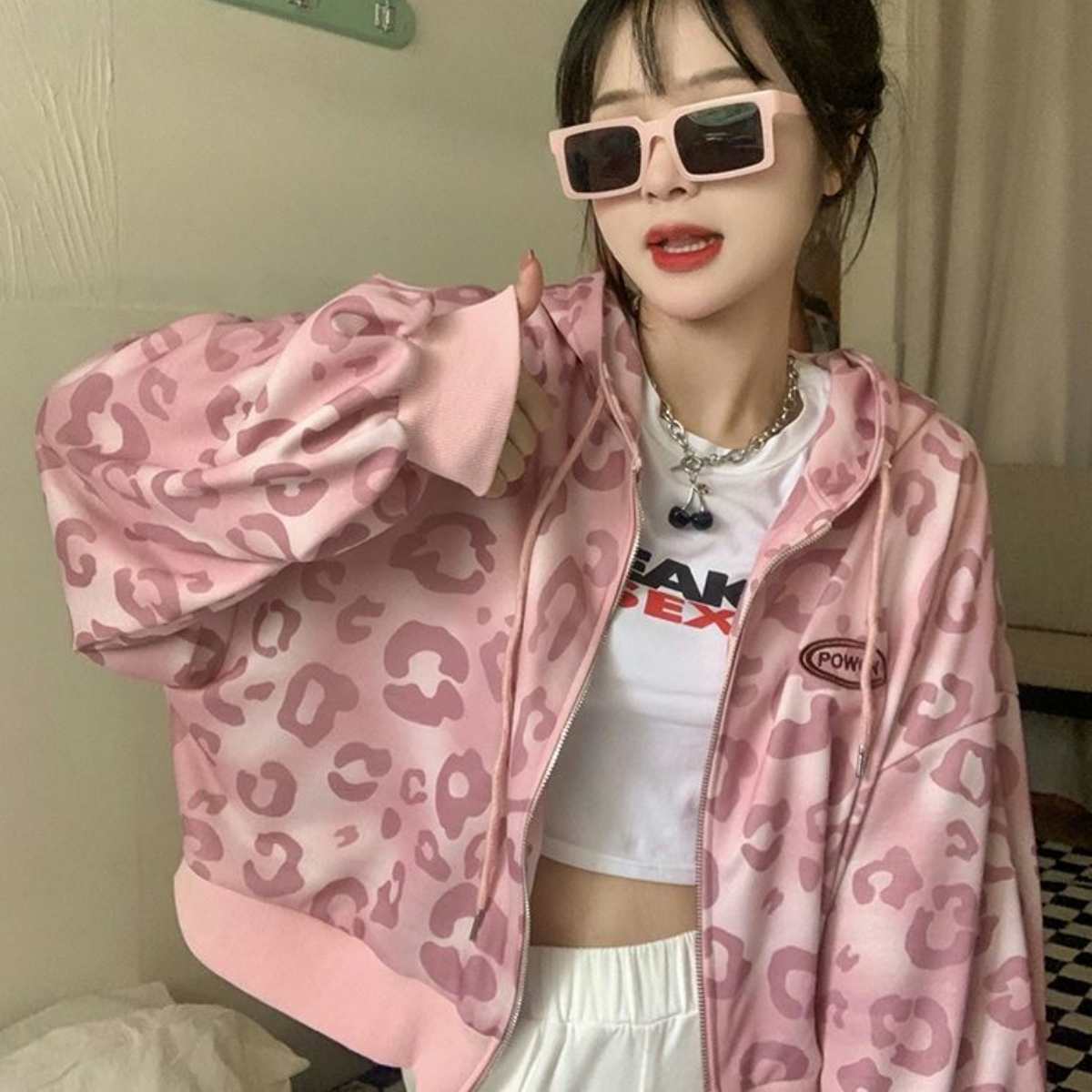 グラデーション レオパード ショート丈 パーカー レディース ピンク ショート トップス 韓国ファッ