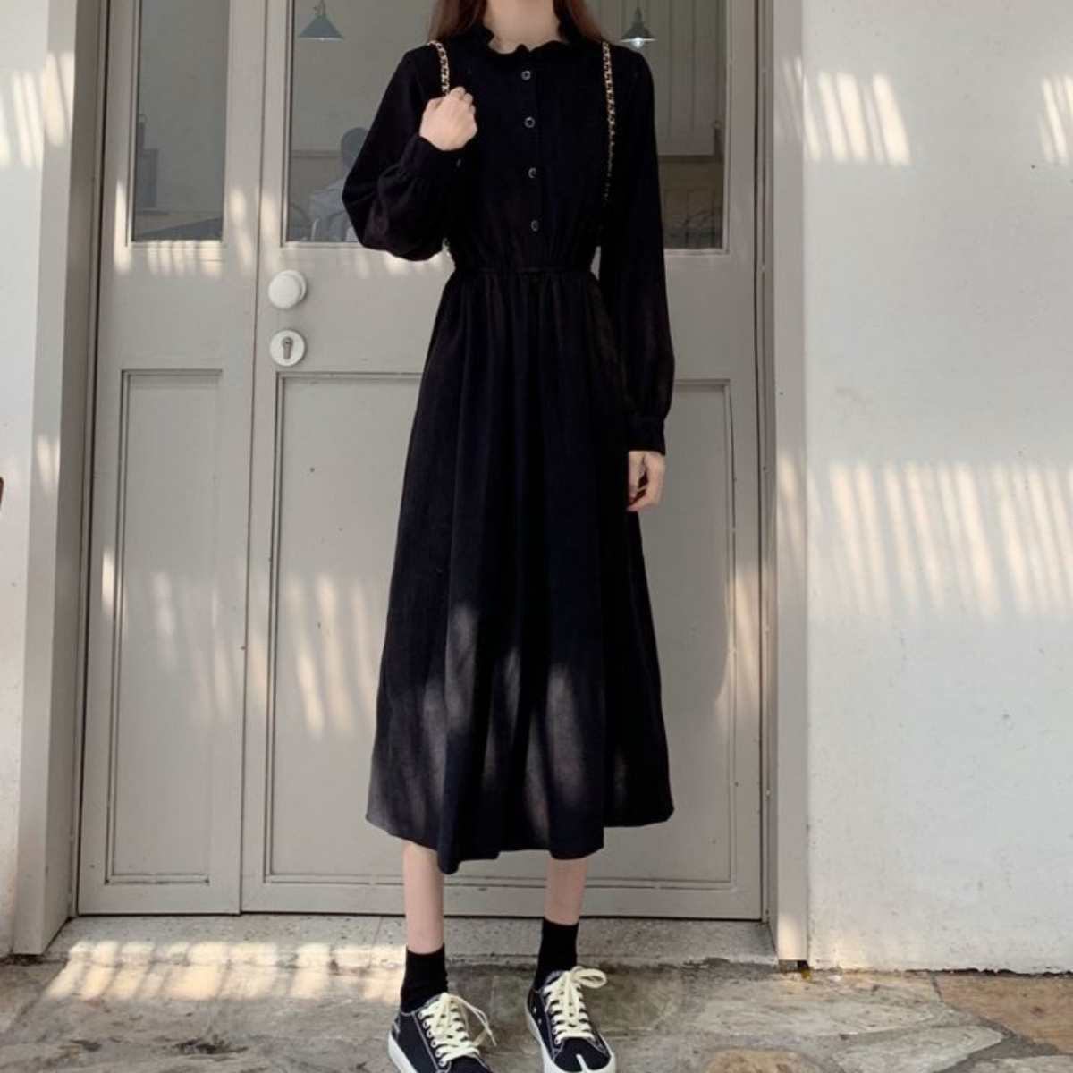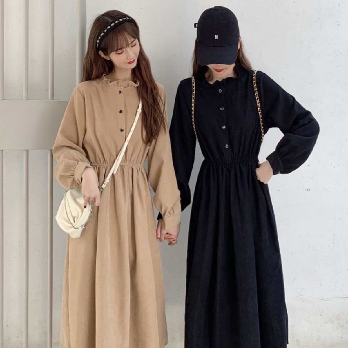 フリルネック コーデュロイ ワンピース レディース ロング ワンピ ドレスワンピ シャツワンピ 秋