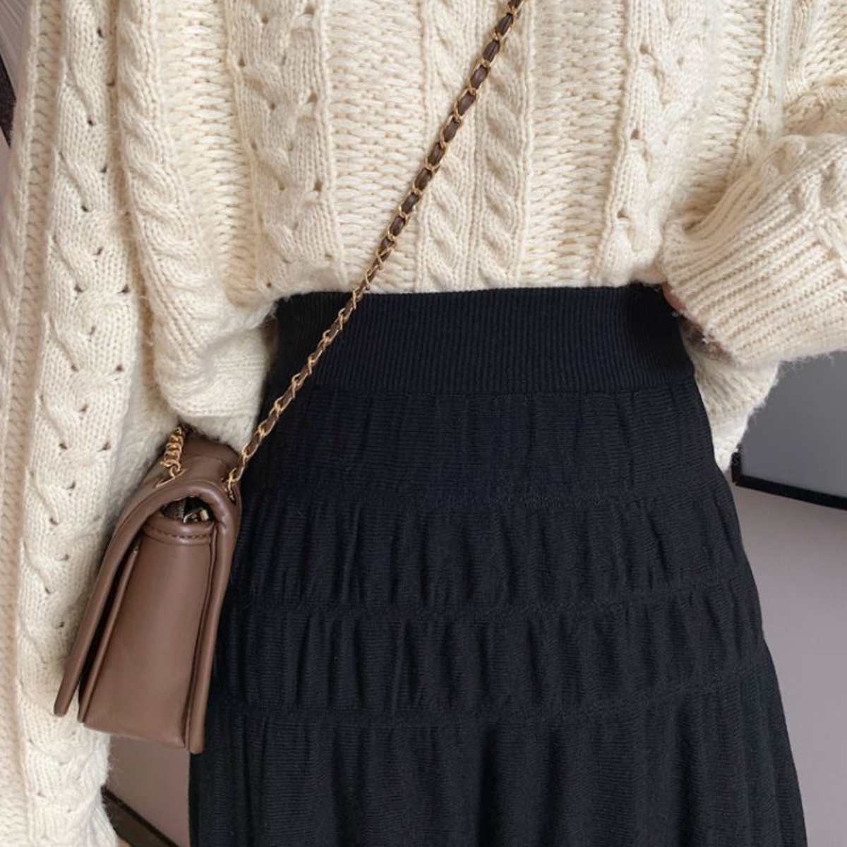 ギャザー ティアードスカート ニットソー 韓国ファッション レディース Aライン ロングスカート フ