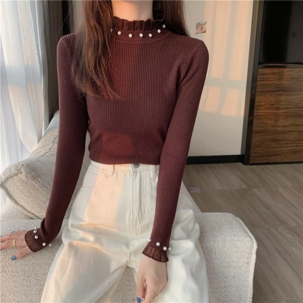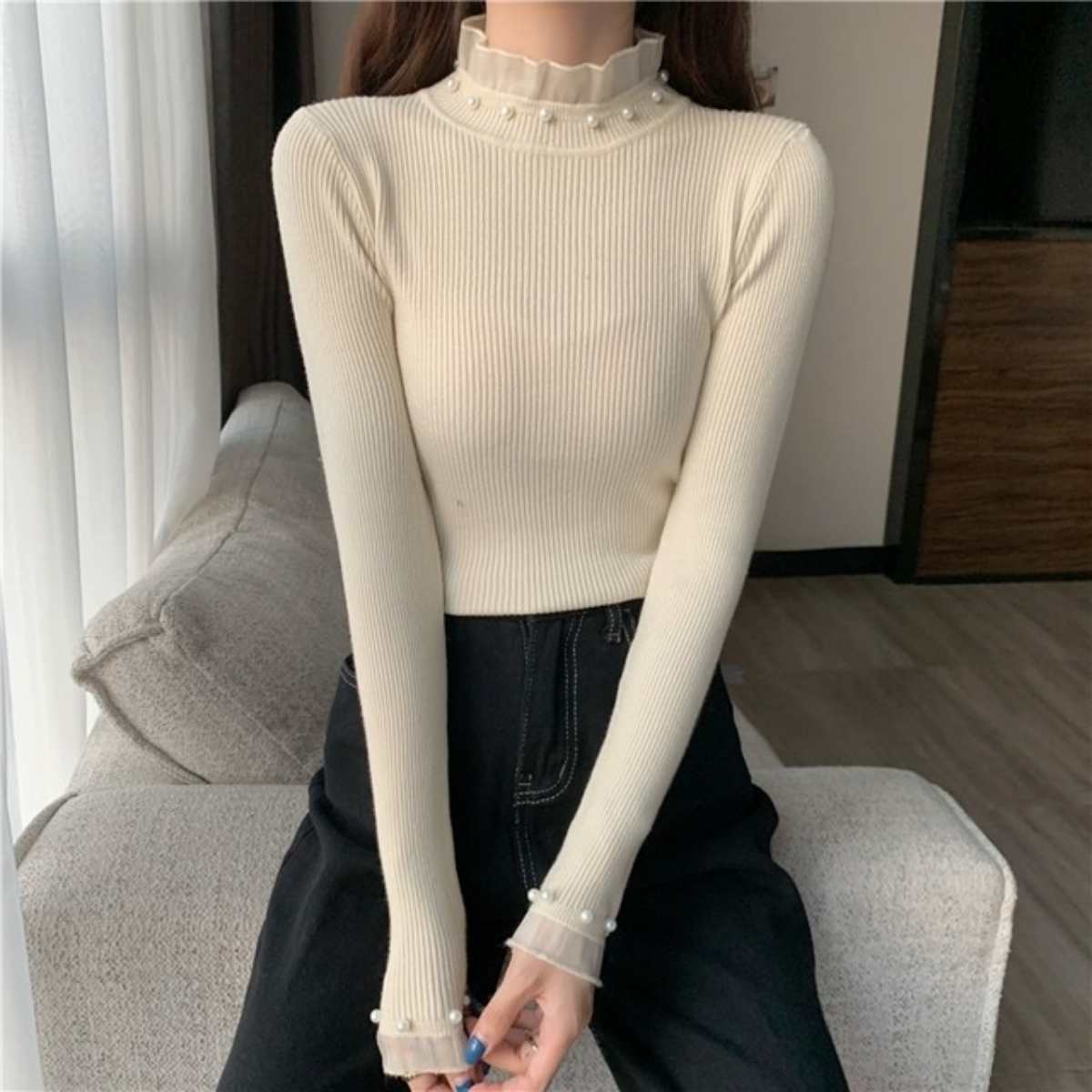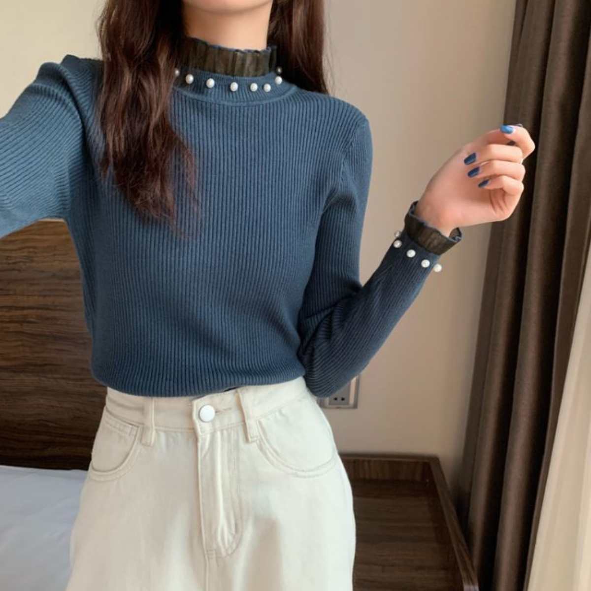 パール使い Tシャツ 韓国ファッション レディース レースネック トップス ガーリー カットソー コ