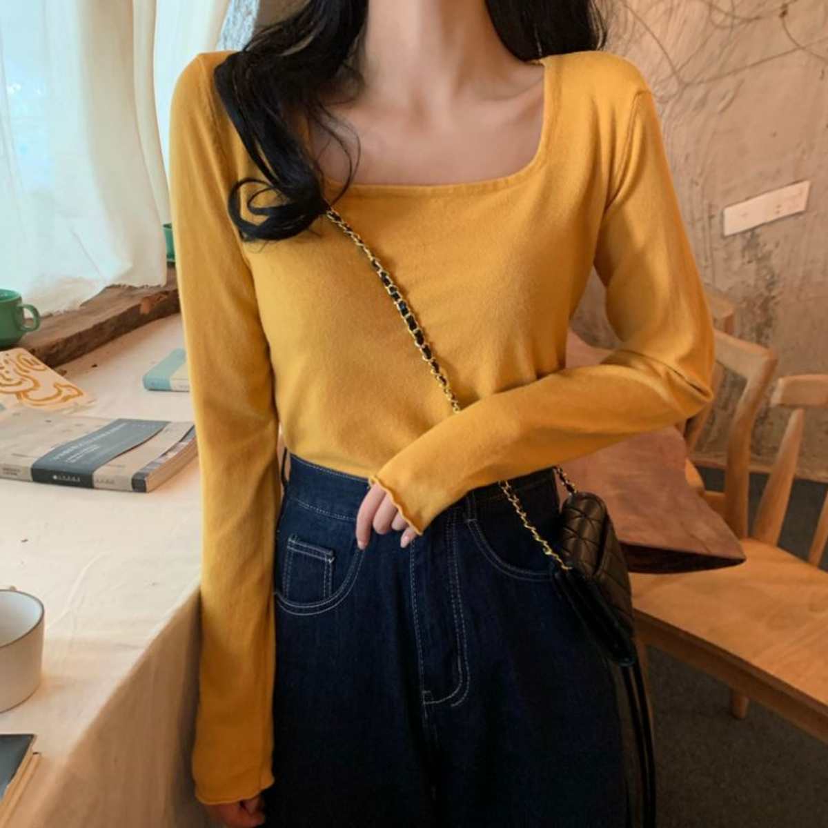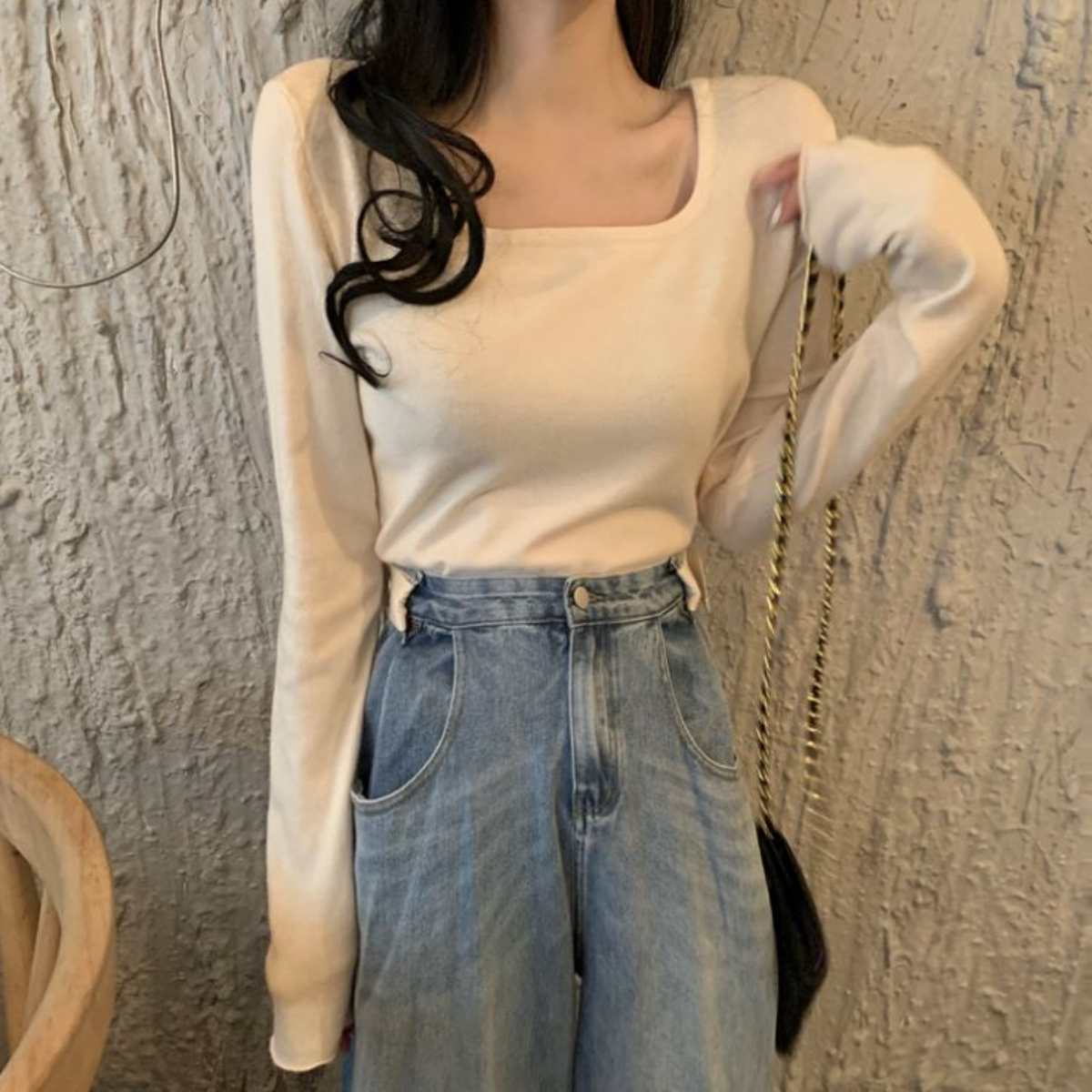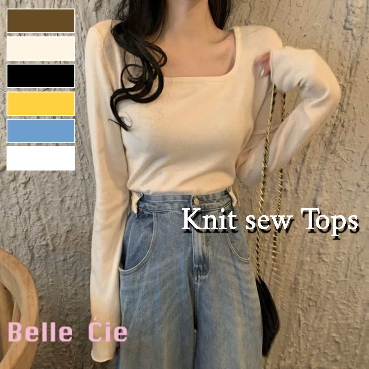 ニットソー長袖Tシャツ 韓国ファッション レディース ショート丈 ストレッチ ロングスリーブ 短丈