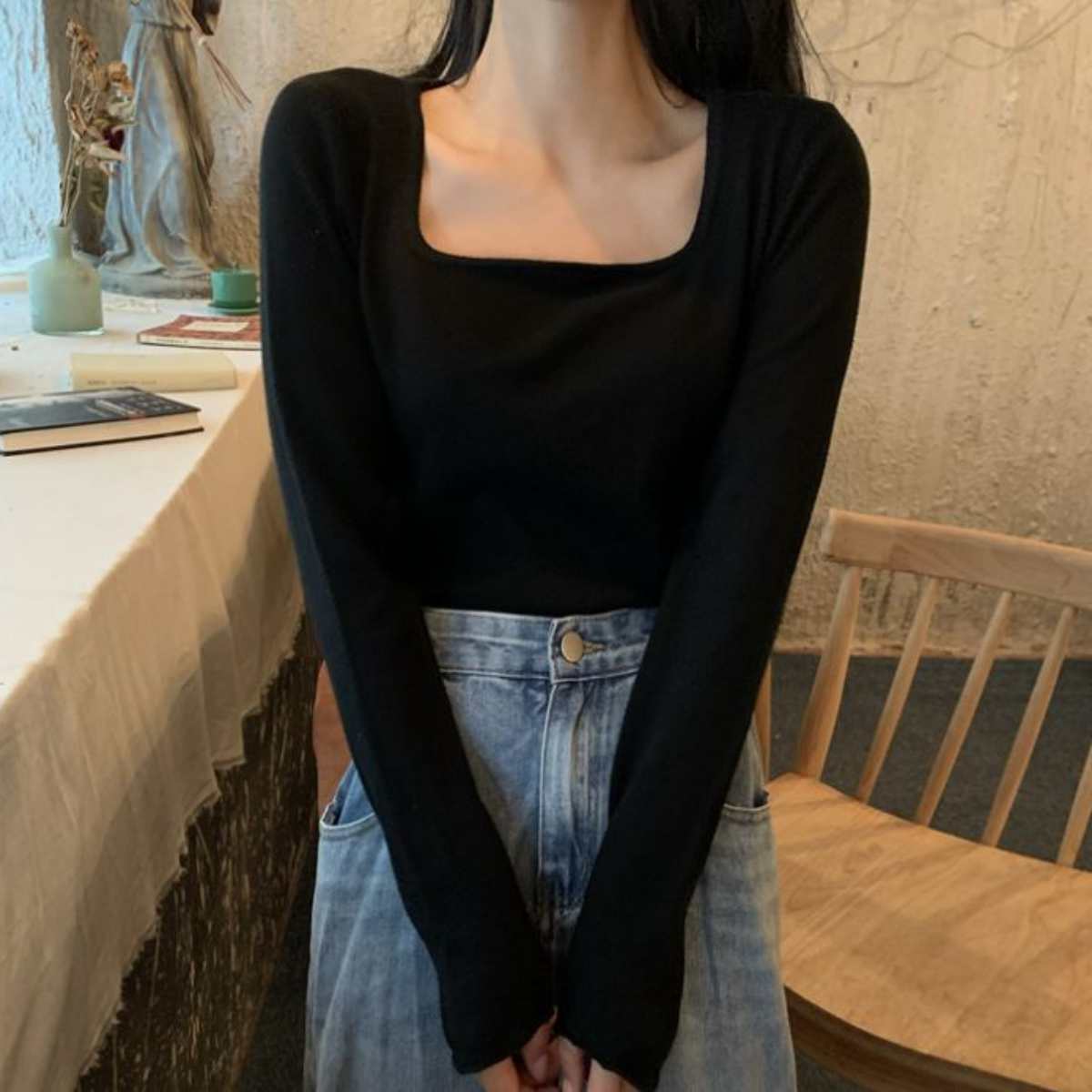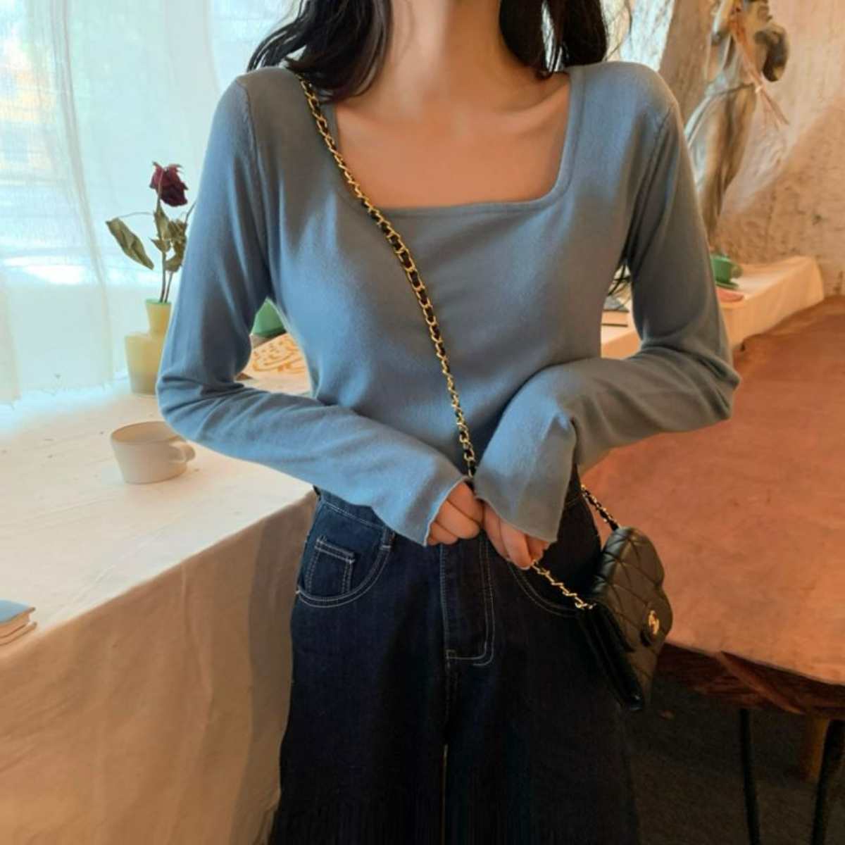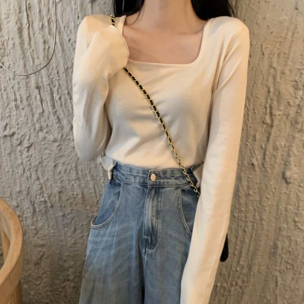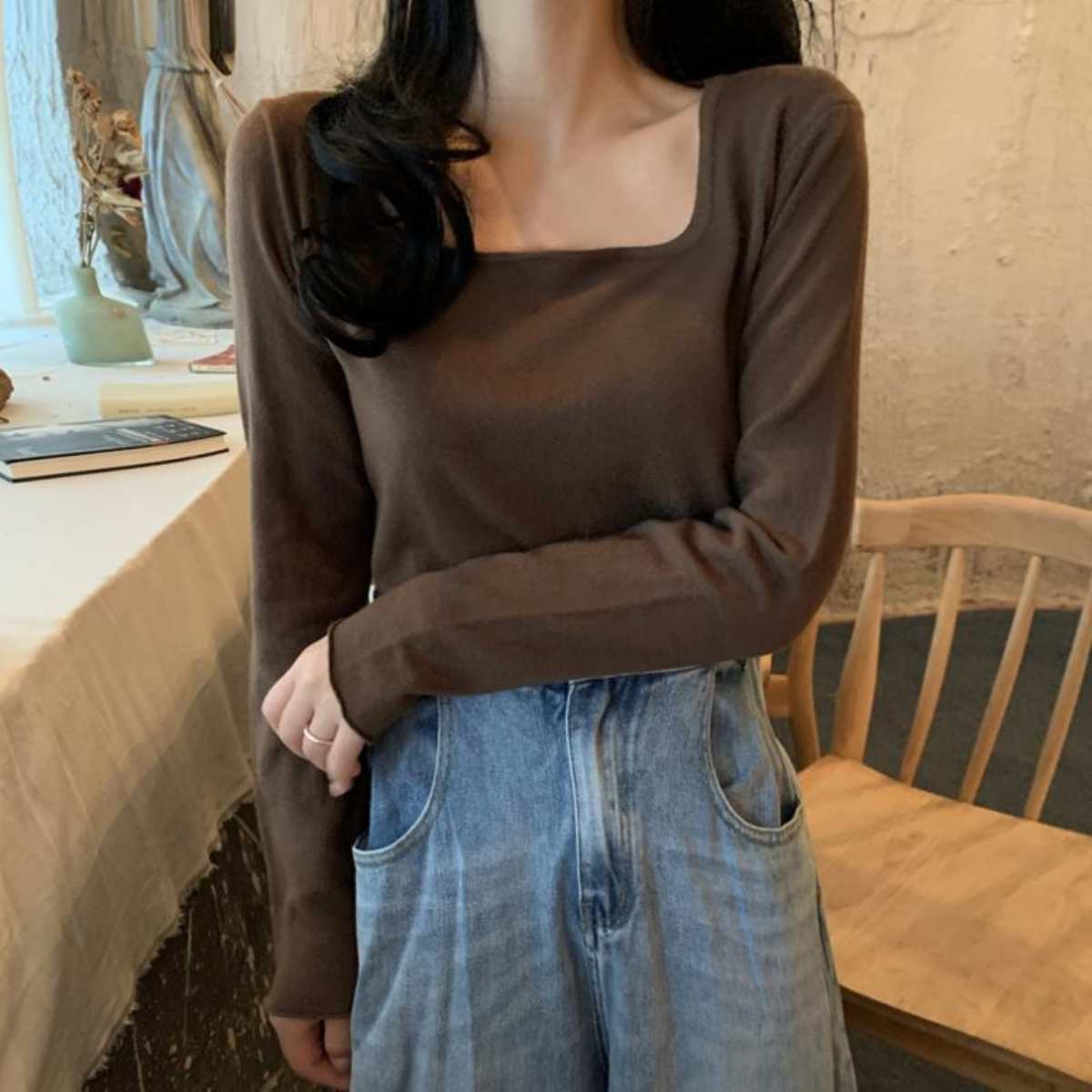 ニットソー長袖Tシャツ 韓国ファッション レディース ショート丈 ストレッチ ロングスリーブ 短丈