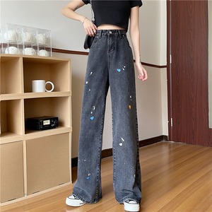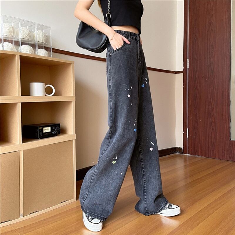 デニムパンツ レディース ハート刺繍 ワイドパンツ ペイント ジーンズ Gパン 韓国ファッション ゆ