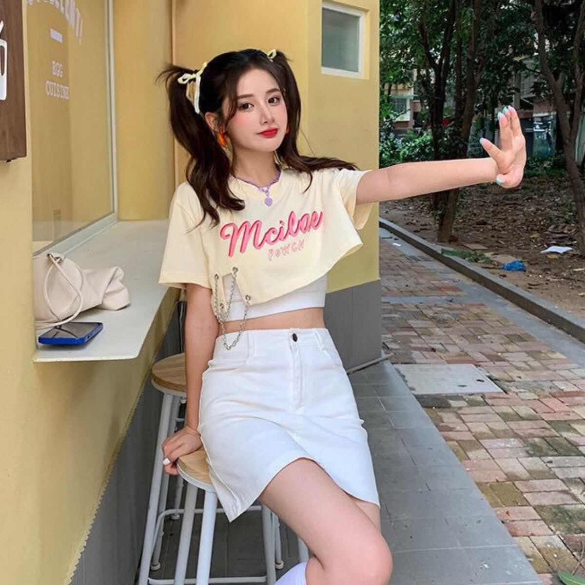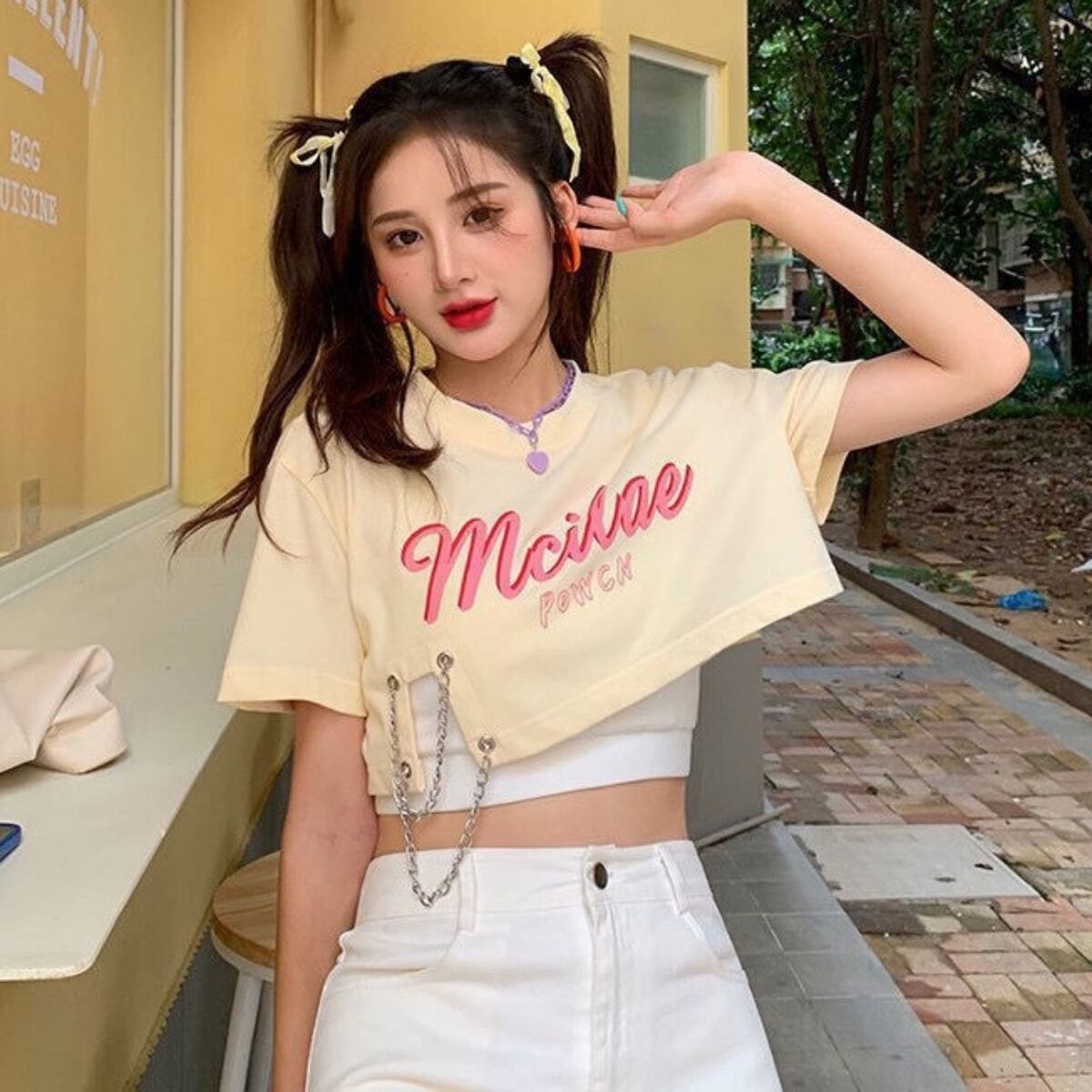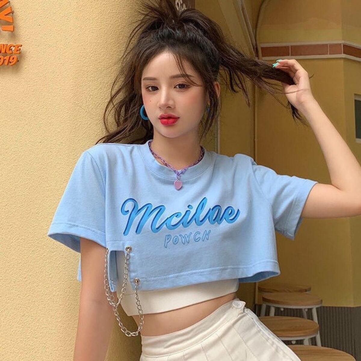 短丈Tシャツ レディース ショート丈 夏 チェーン使い Tシャツ カットソー オルチャン 韓国ファッ