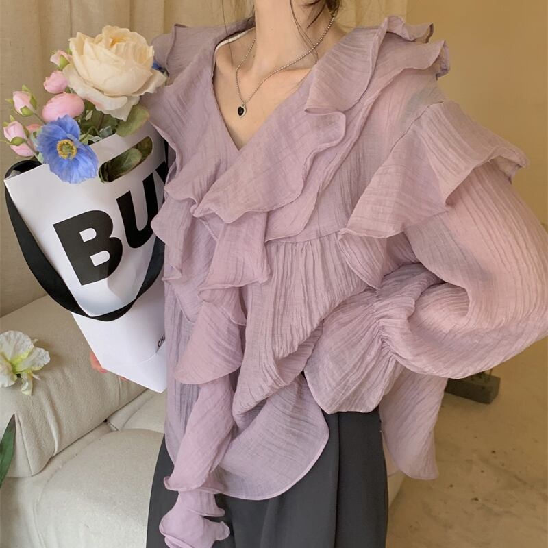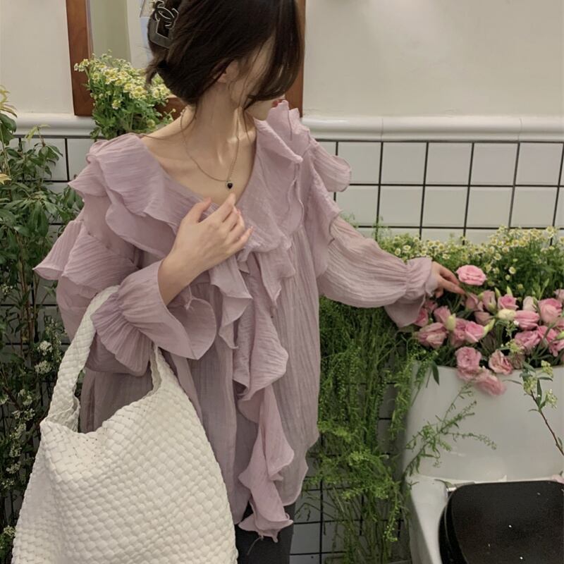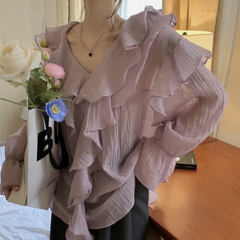 フリルブラウス レディース ワッシャー トップス ガーリー フェミニン シアー 長袖 ブラウス フリ