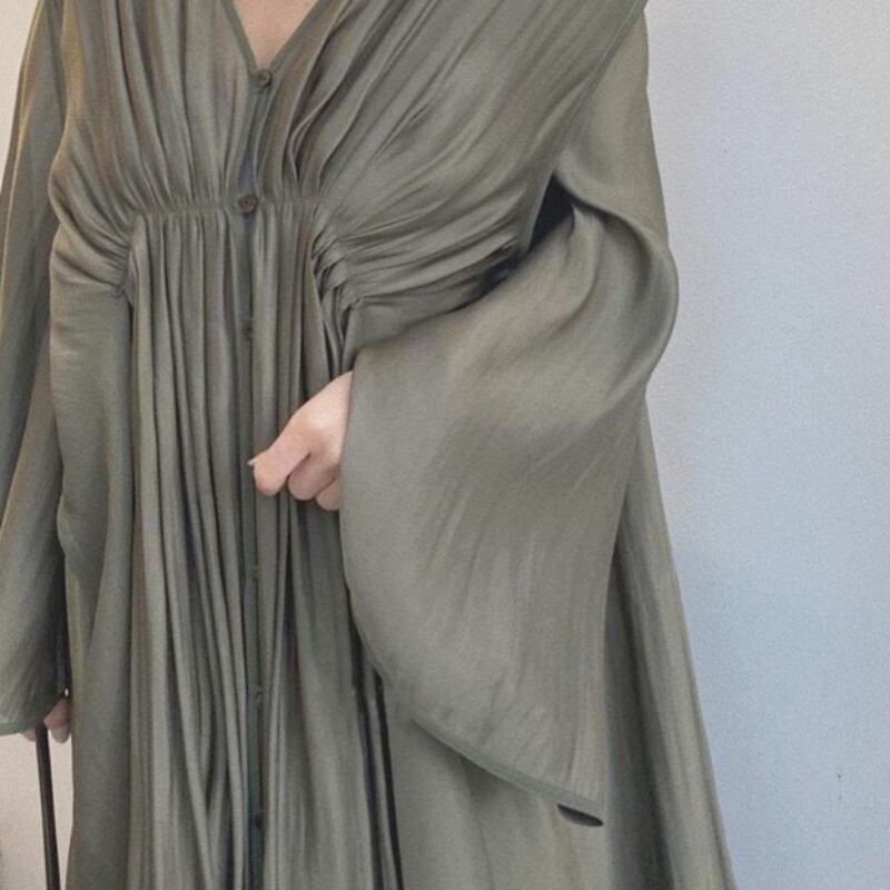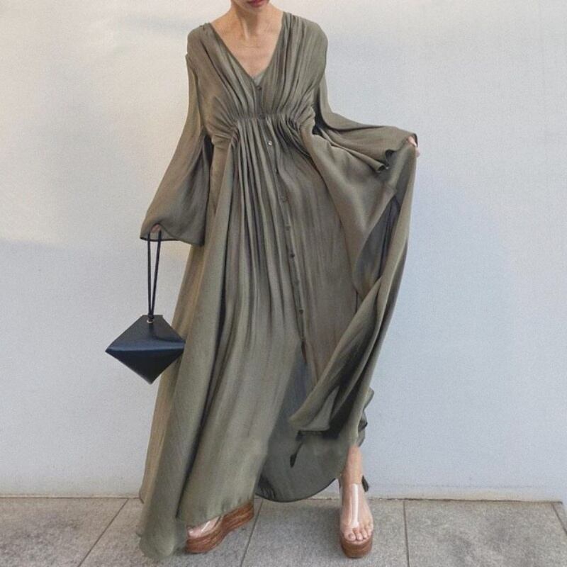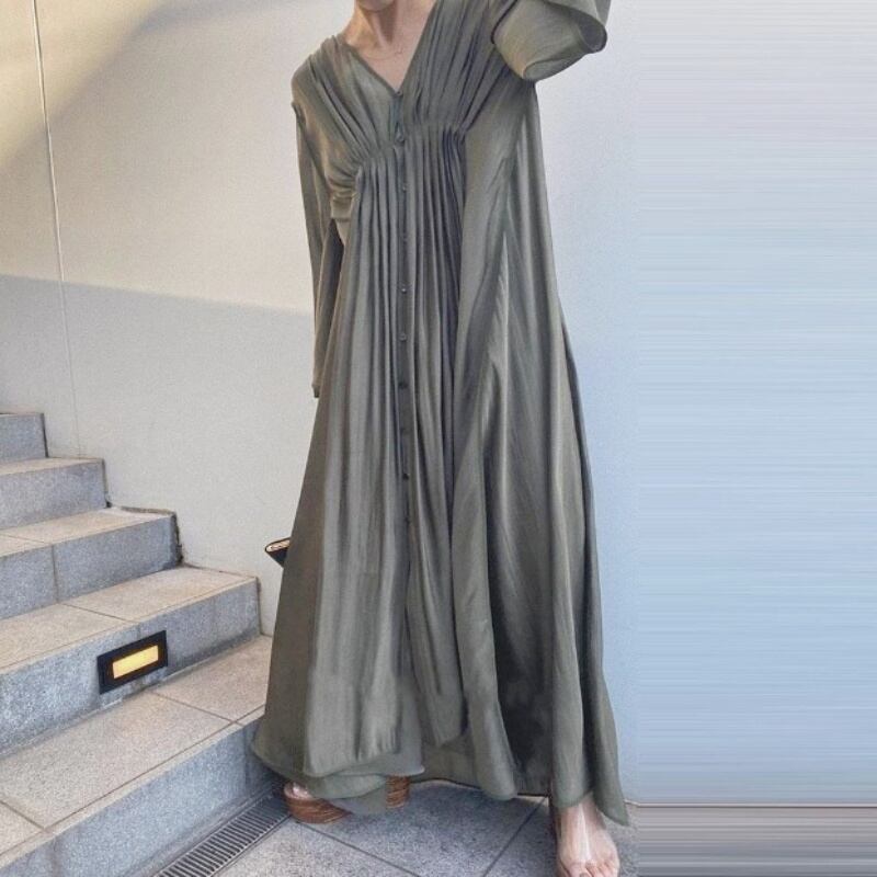 ロング丈 ガウン ワンピース 韓国ファッション レディース シャーリング ギャザー 羽織り 前開き