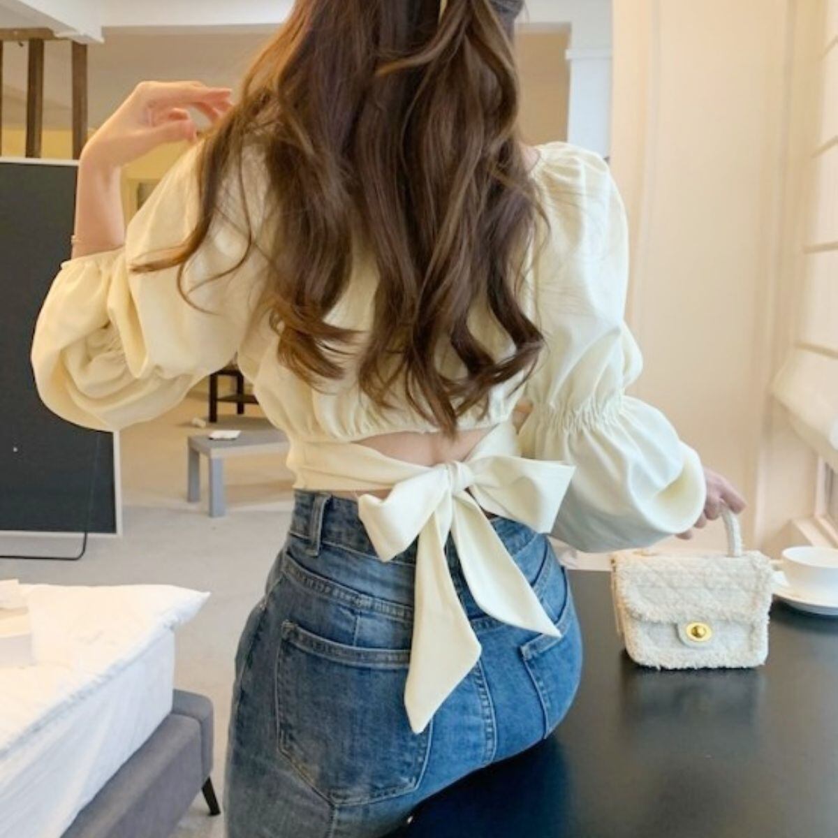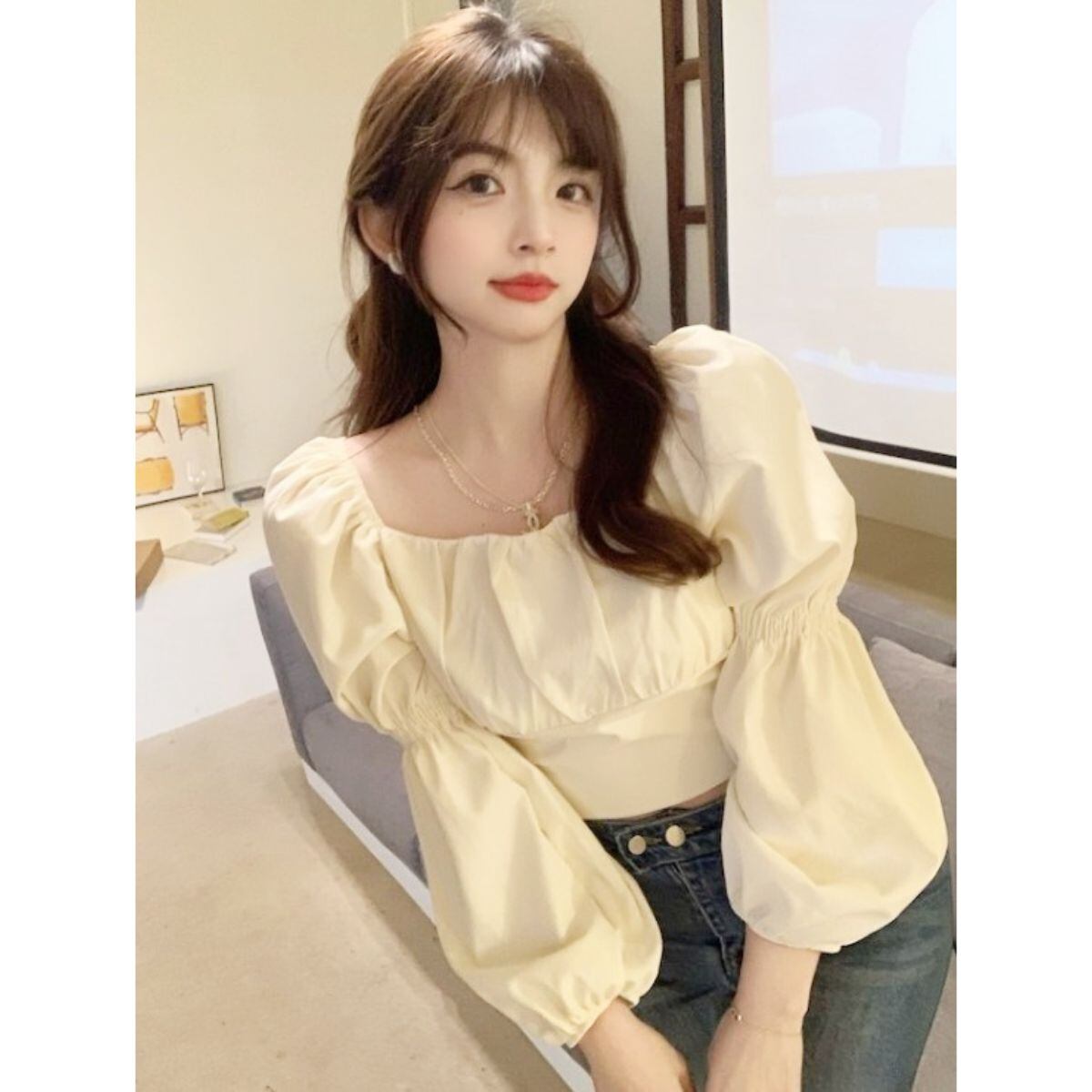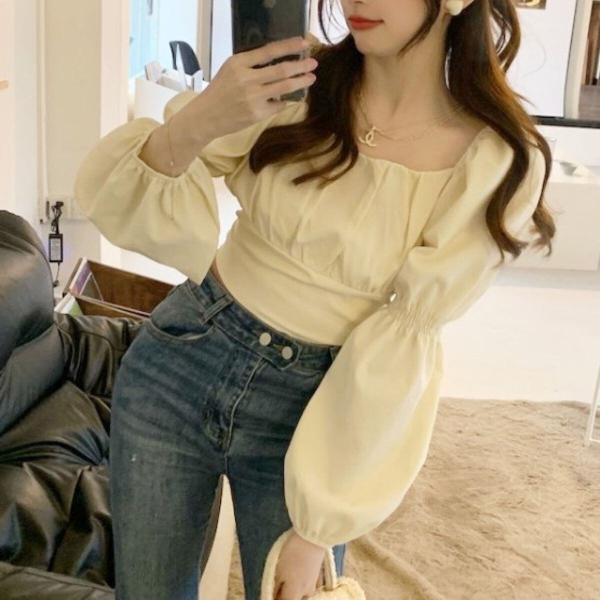 ロンT 韓国ファッション レディース Tシャツ デザインT ショート丈 バルーンスリーブ 肌見せ ト