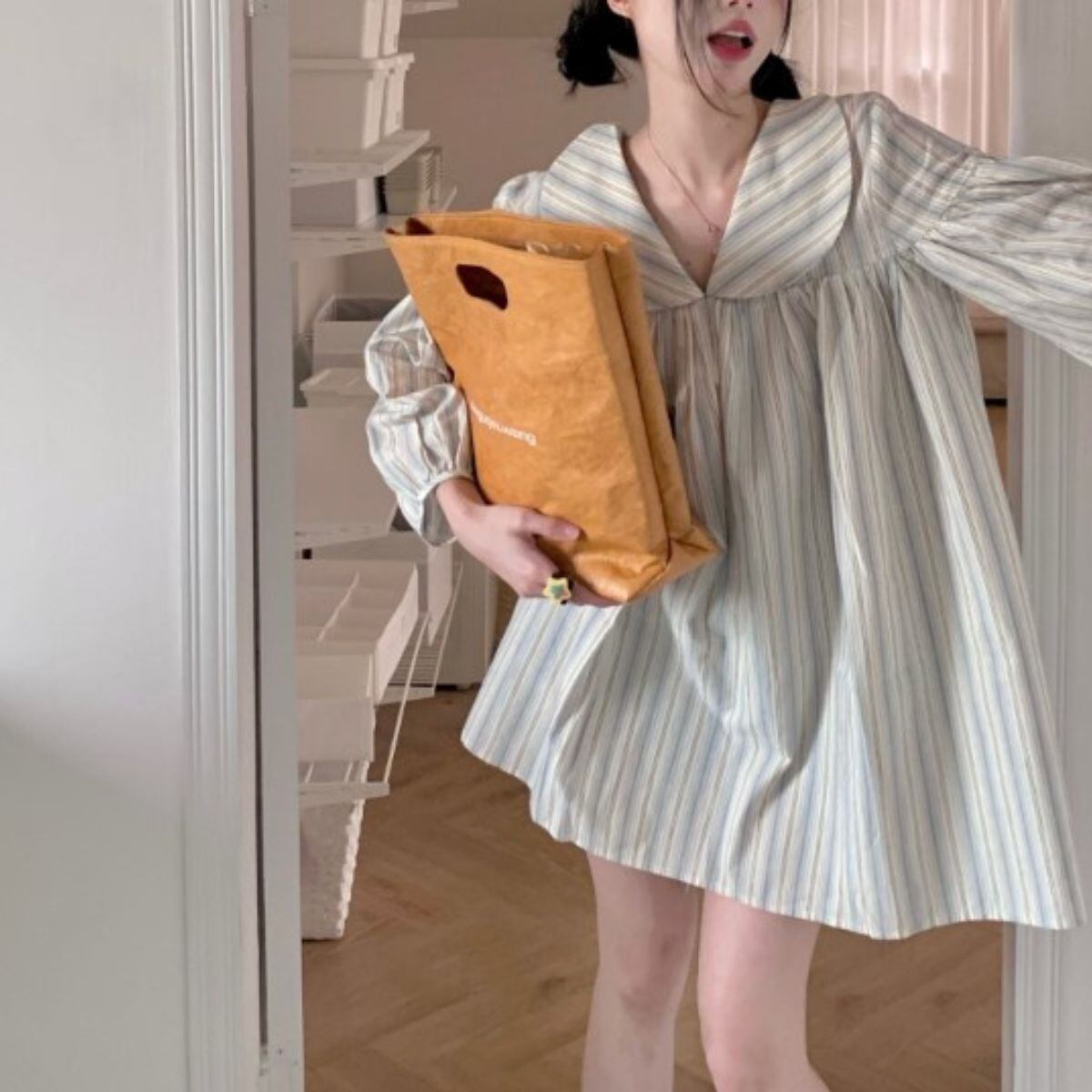 ワンピース スカート ミニ丈 ミニスカ チュニック 韓国ファッション レディース 長袖 襟付き かわ