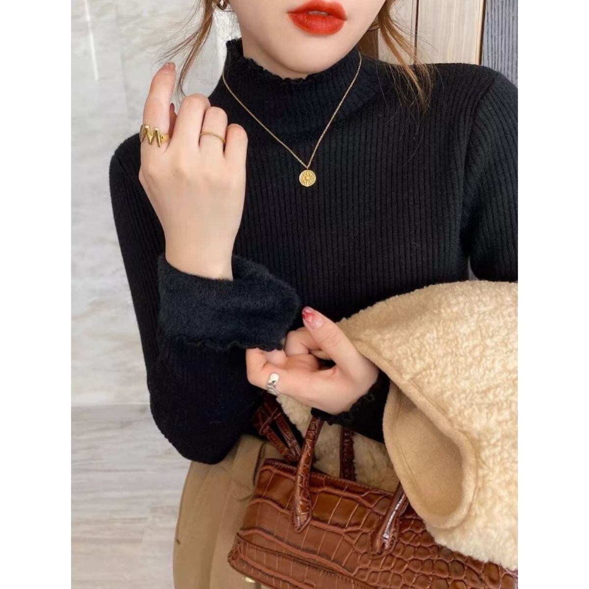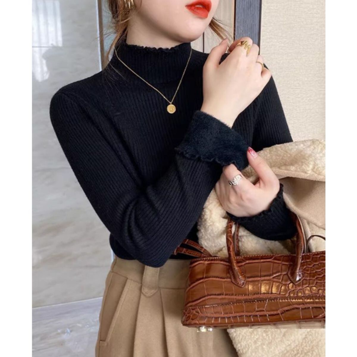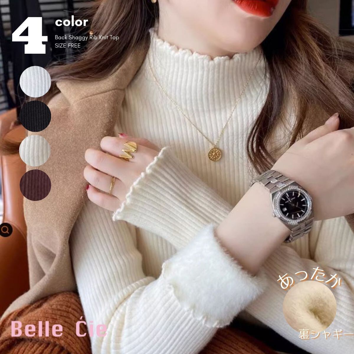 裏シャギー ニット 長袖 ハイネック リブニット セーター トップス 裏起毛 トップス リブ レディ